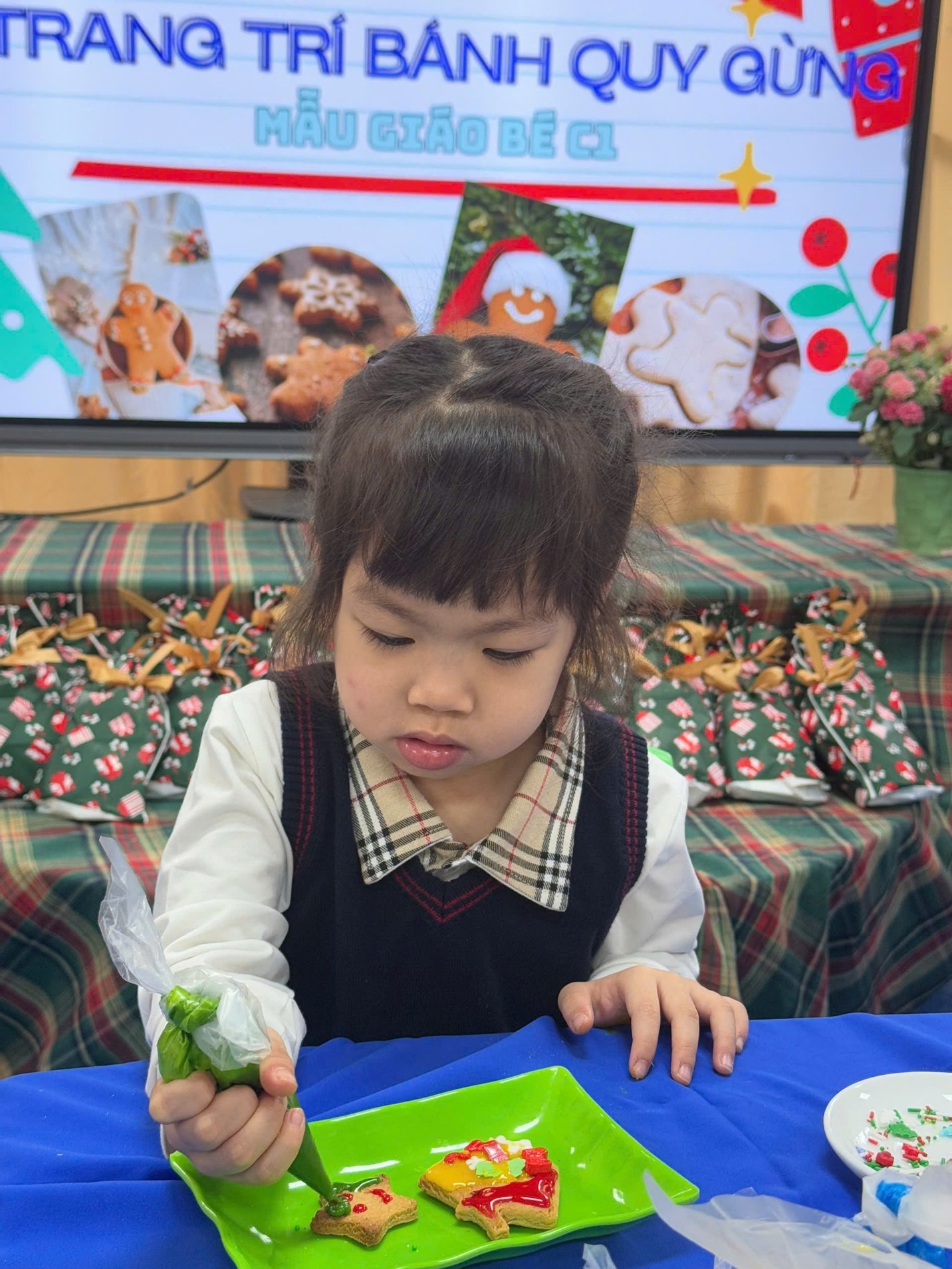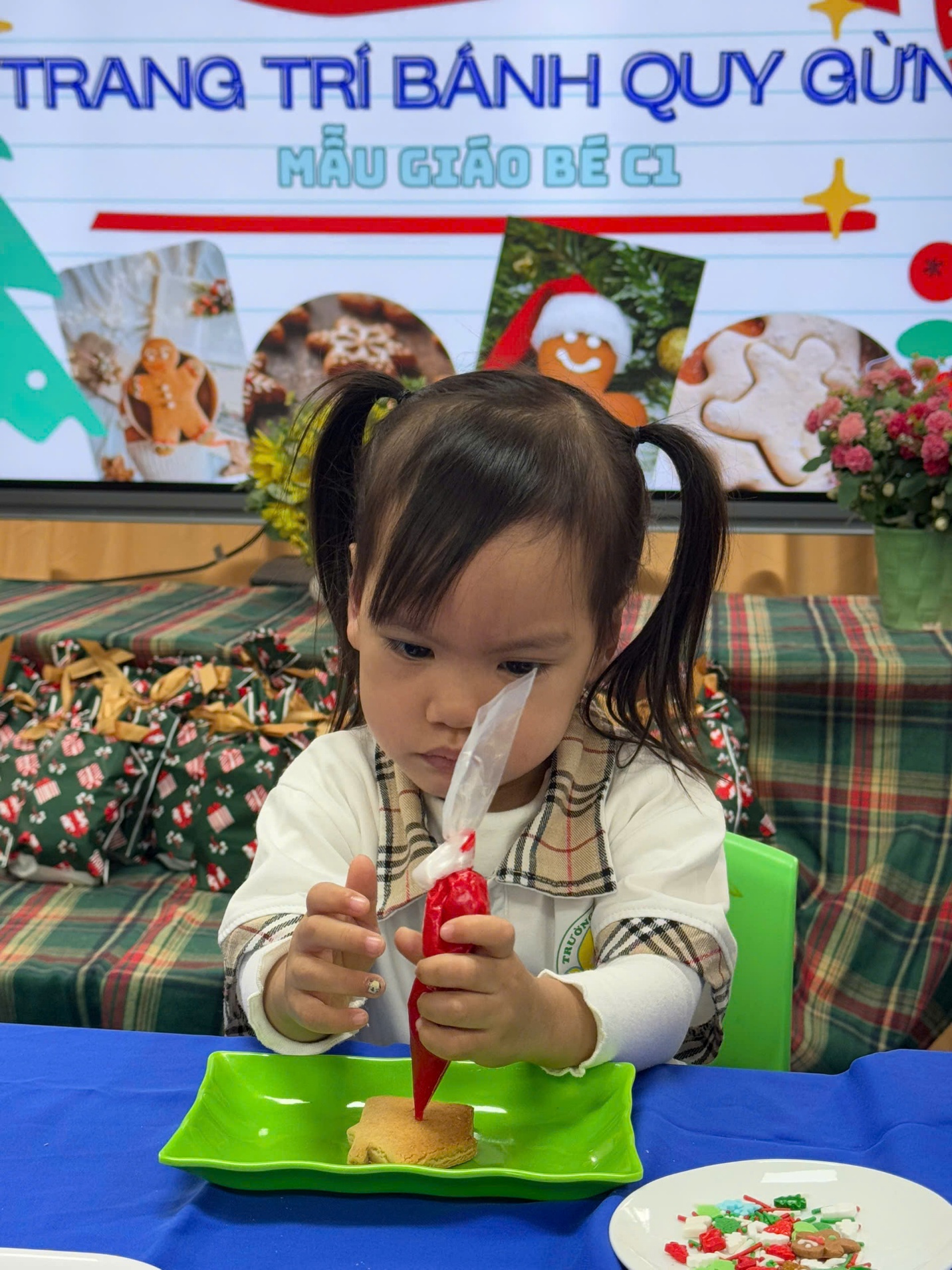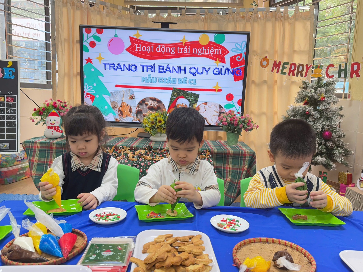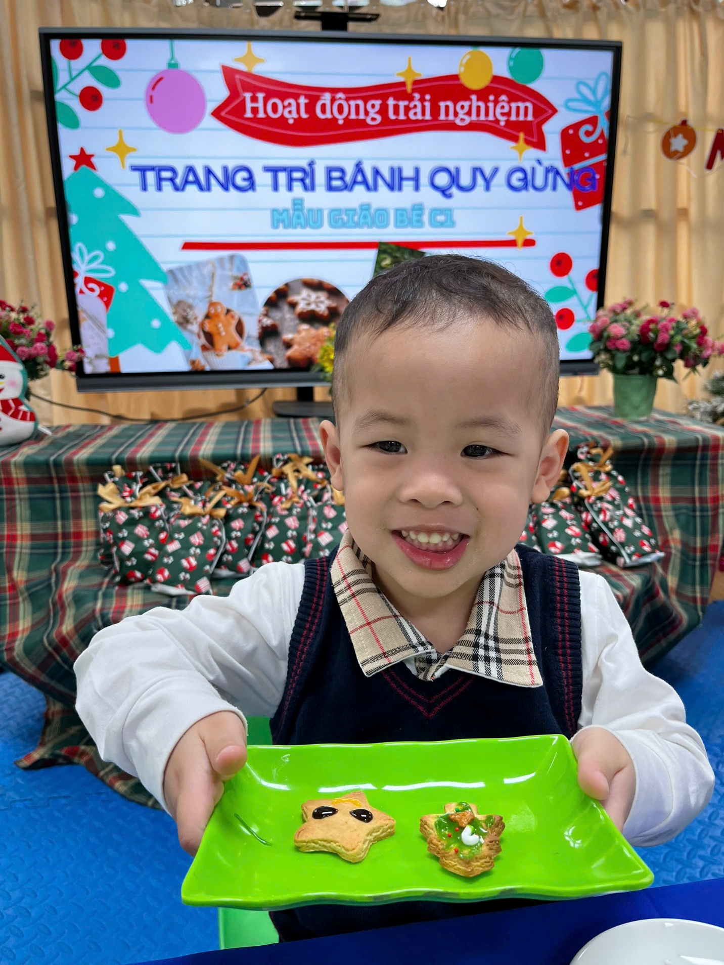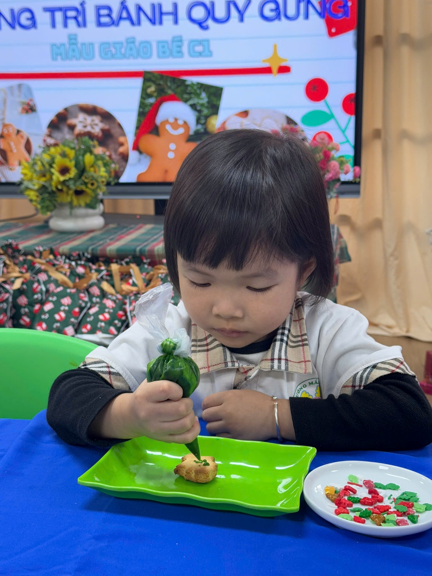 . Dưới sự hướng dẫn nhẹ nhàng của giáo lớp bé C1 các con tạo hình những chiếc bánh gừng, trang trí thật xinh xắn mang đậm sắc màu Noel. Mùi thơm ngọt ngào của bánh gừng lan tỏa khắp không gian lớp học, làm cho ngày Giáng sinh thêm trọn vẹn. Qua buổi trải nghiệm, các bé cảm nhận được niềm vui lao động và ý nghĩa của việc tự tay tạo ra sản phẩm cho ngày lễ.