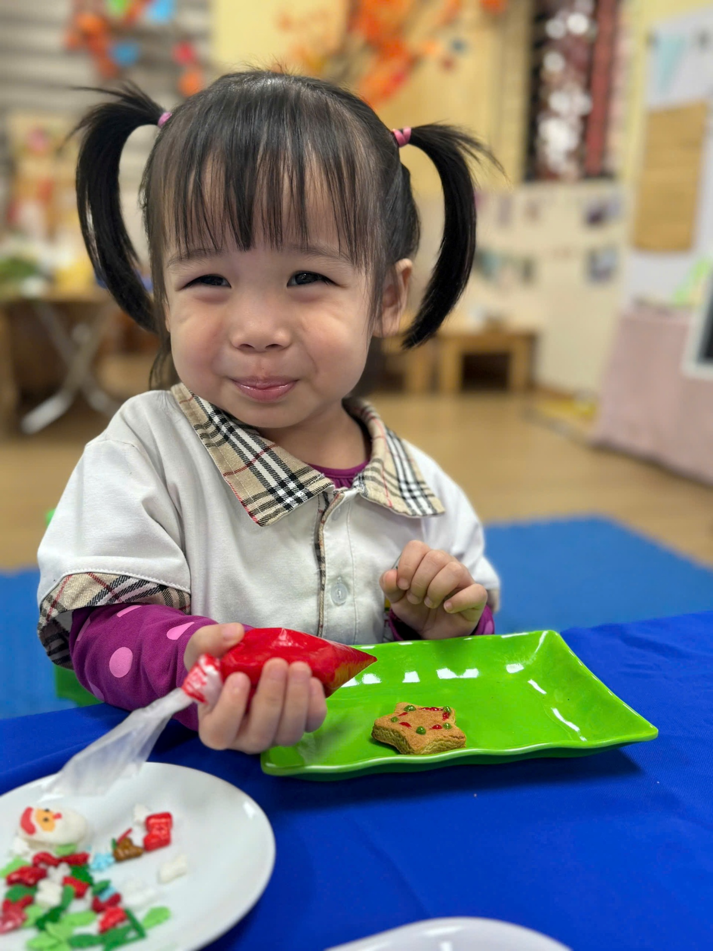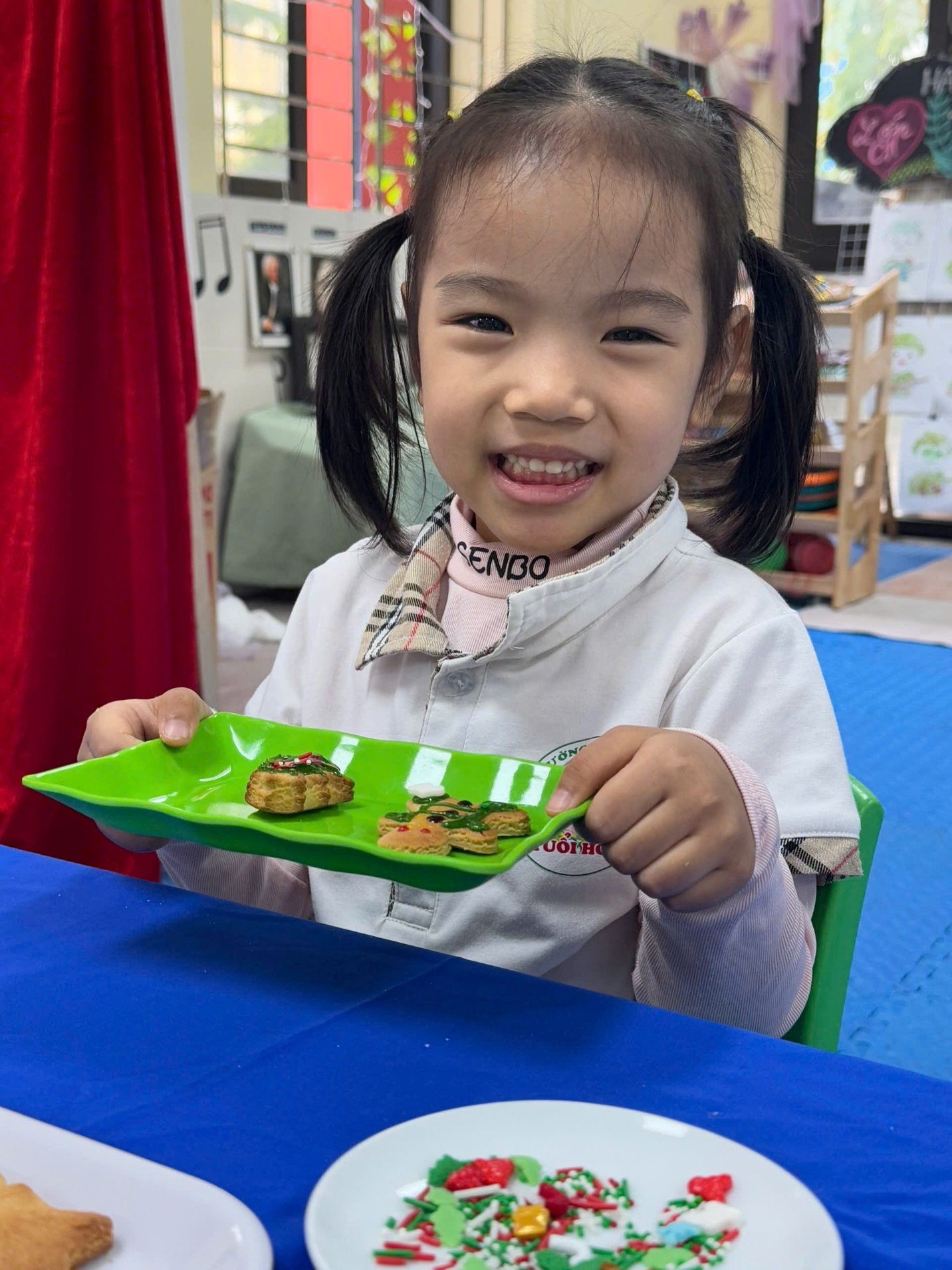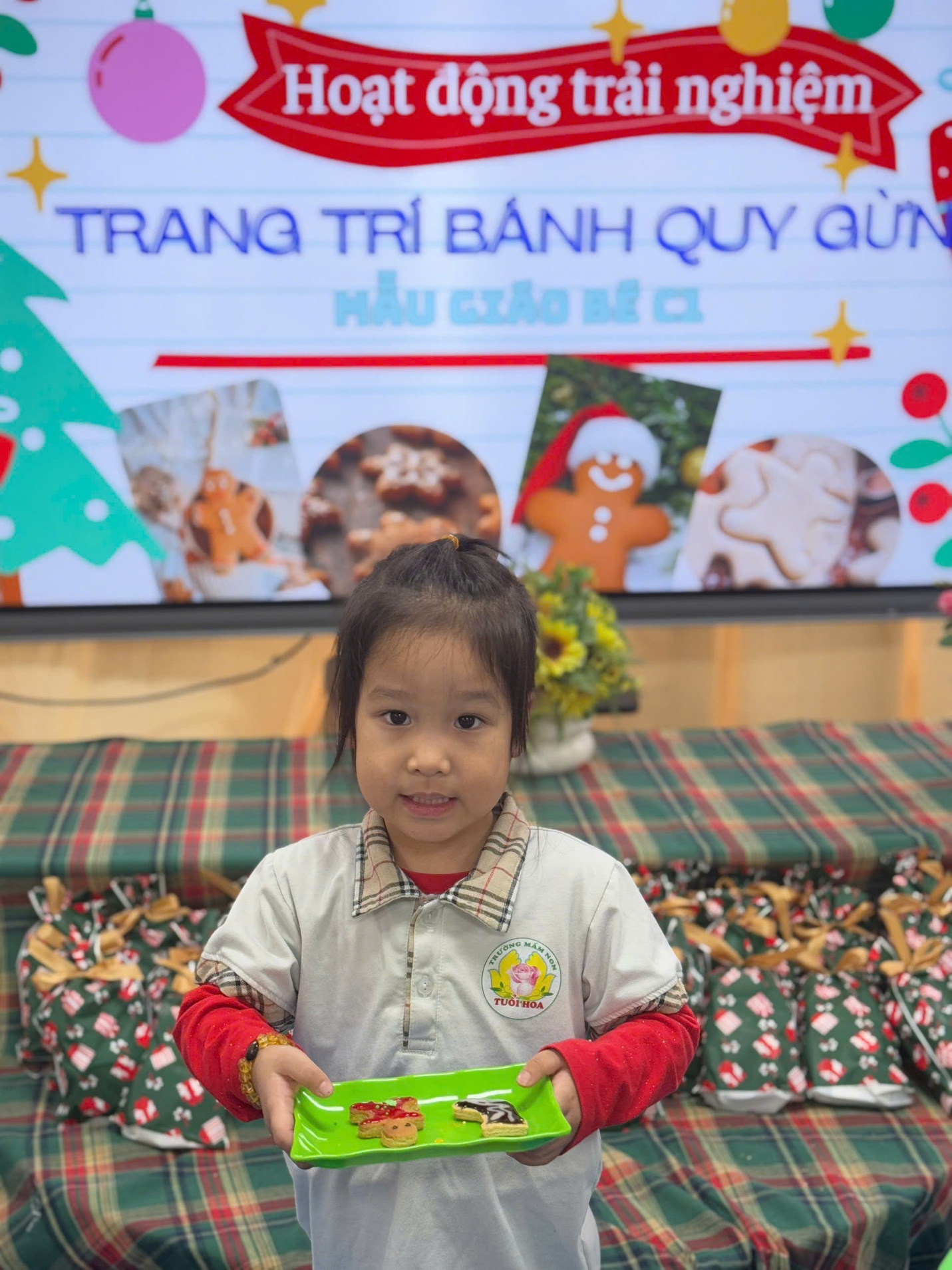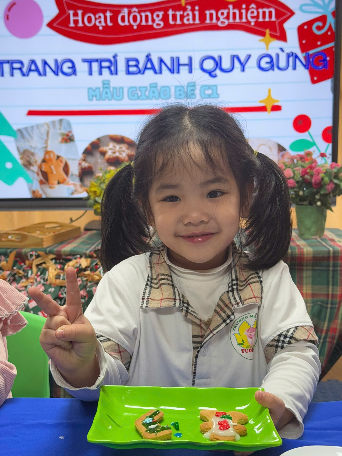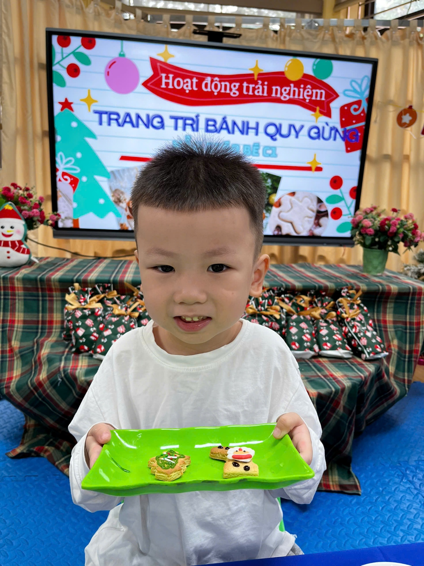 . Dưới sự hướng dẫn nhẹ nhàng của giáo lớp bé C1 các con tạo hình những chiếc bánh gừng, trang trí thật xinh xắn mang đậm sắc màu Noel. Mùi thơm ngọt ngào của bánh gừng lan tỏa khắp không gian lớp học, làm cho ngày Giáng sinh thêm trọn vẹn. Qua buổi trải nghiệm, các bé cảm nhận được niềm vui lao động và ý nghĩa của việc tự tay tạo ra sản phẩm cho ngày lễ.
