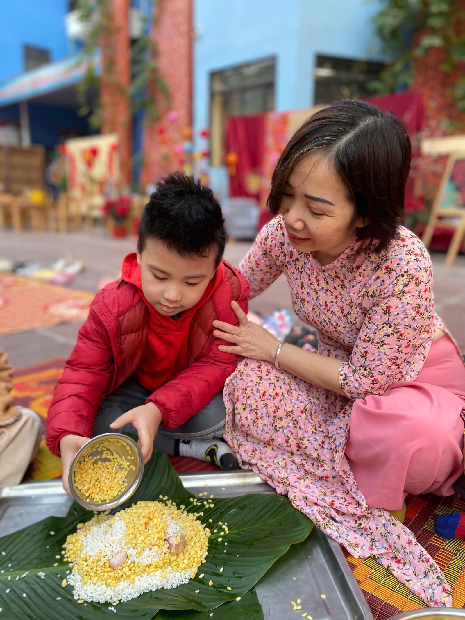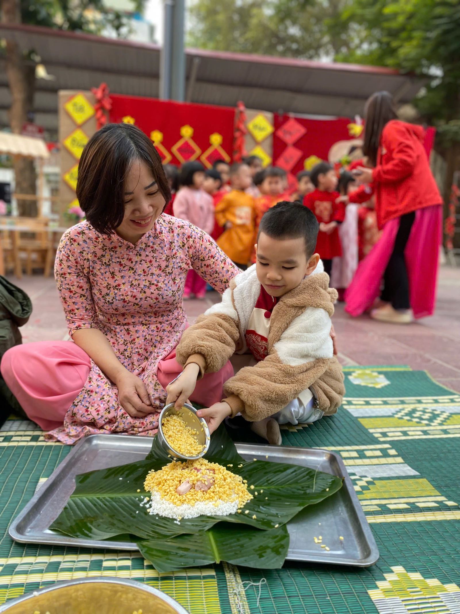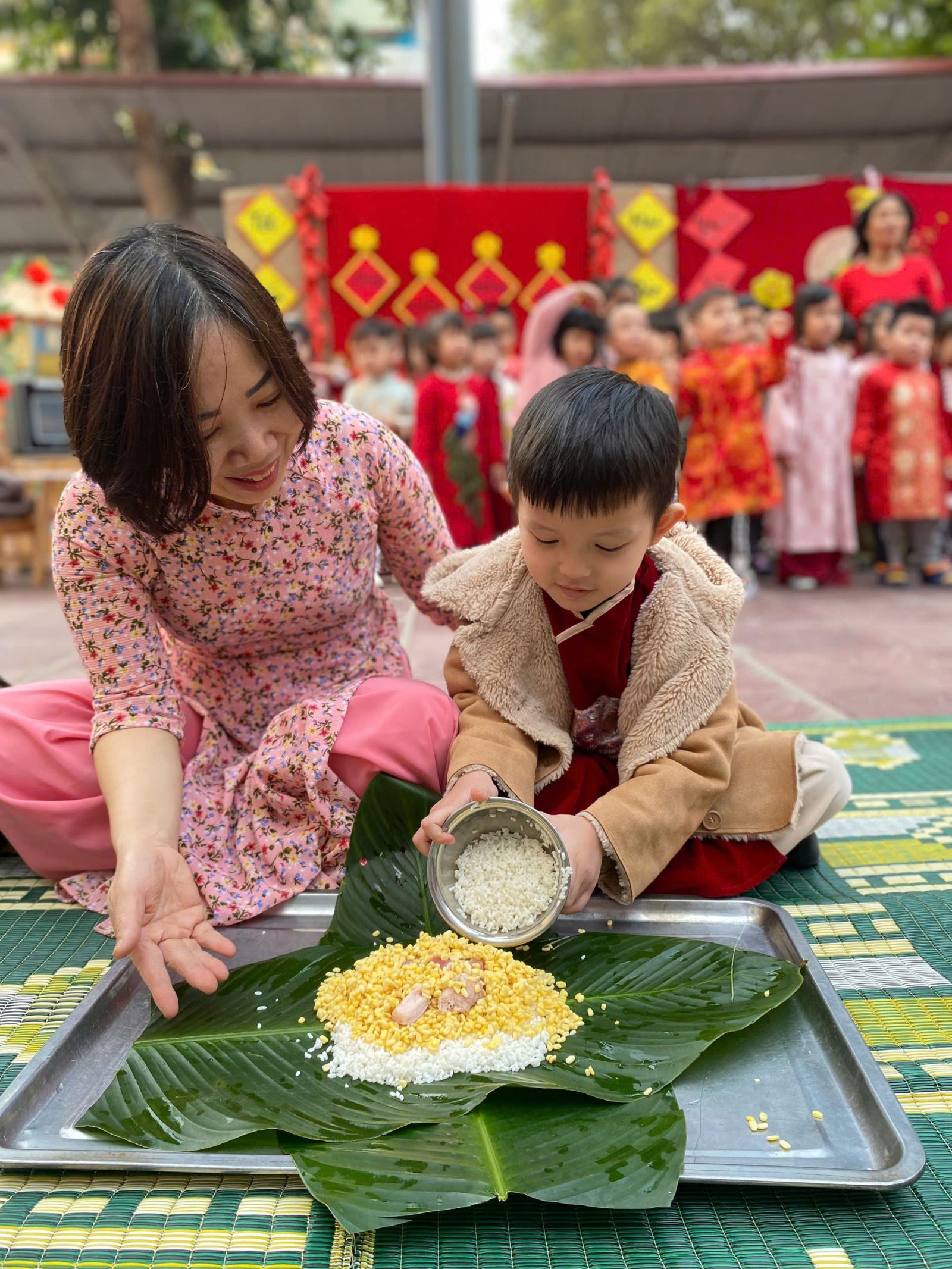Hòa chung trong không khí của những ngày cuối năm, với mong muốn mang đến cho các con những nét văn hóa cổ truyền của dân tộc. Cứ mỗi dịp Tết đến xuân về trường mầm non Tuổi Hoa đều tổ chức cho các bé hoạt động trải nghiệm “Gói bánh chưng”. Với những nguyên liệu thân thuộc nhưng mang đậm nét đặc trưng của ngày Tết như: lá dong, gạo nếp, đỗ xanh, hạt tiêu ướp thịt… cùng với những tiếng cười đùa vui vẻ, những bàn tay nhỏ xinh và biết bao niềm háo hức. Các bạn nhỏ lớp A1 đã có một trải nghiệm thật vui vẻ với hoạt động “Gói bánh chưng ngày Tết” vô cùng ý nghĩa.