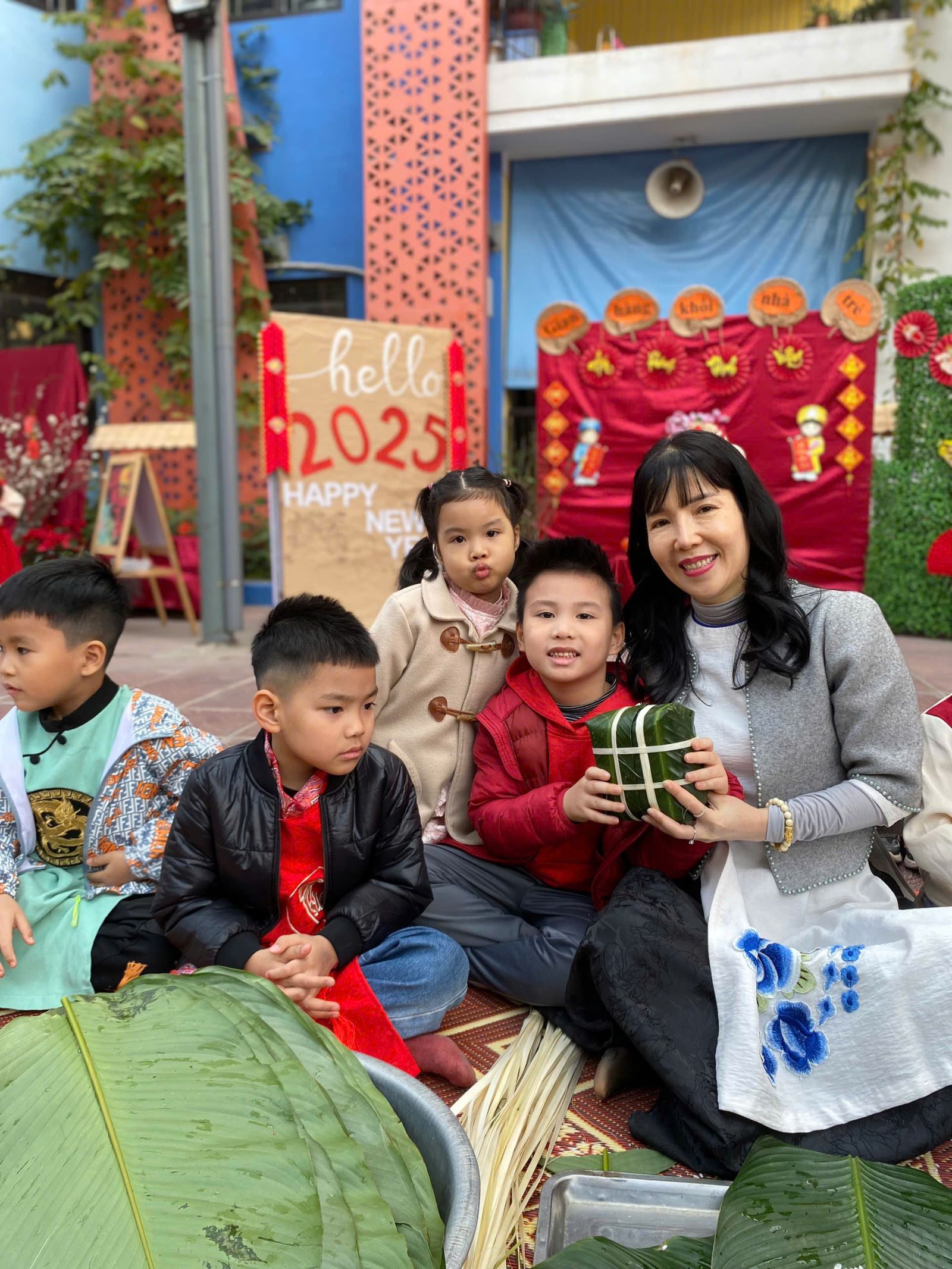 Bác Hiệu trưởng hướng dẫn các bé gói bánh chưng