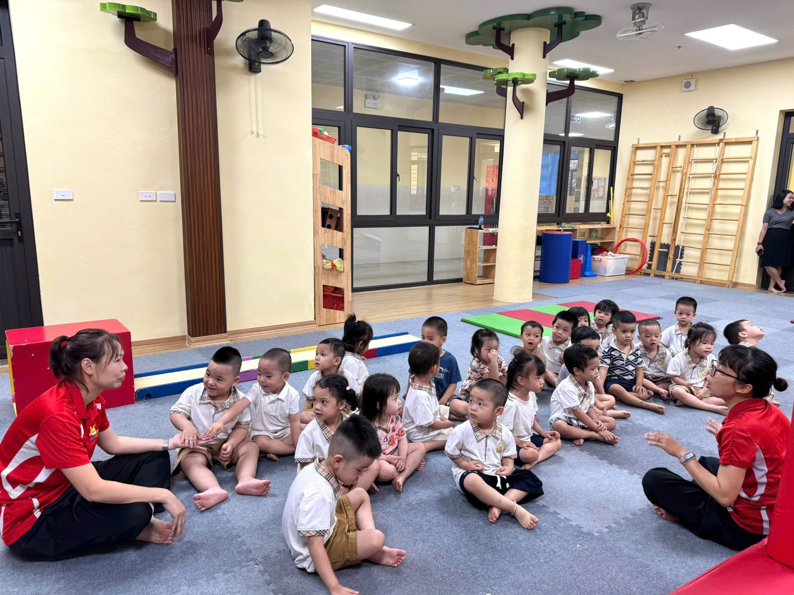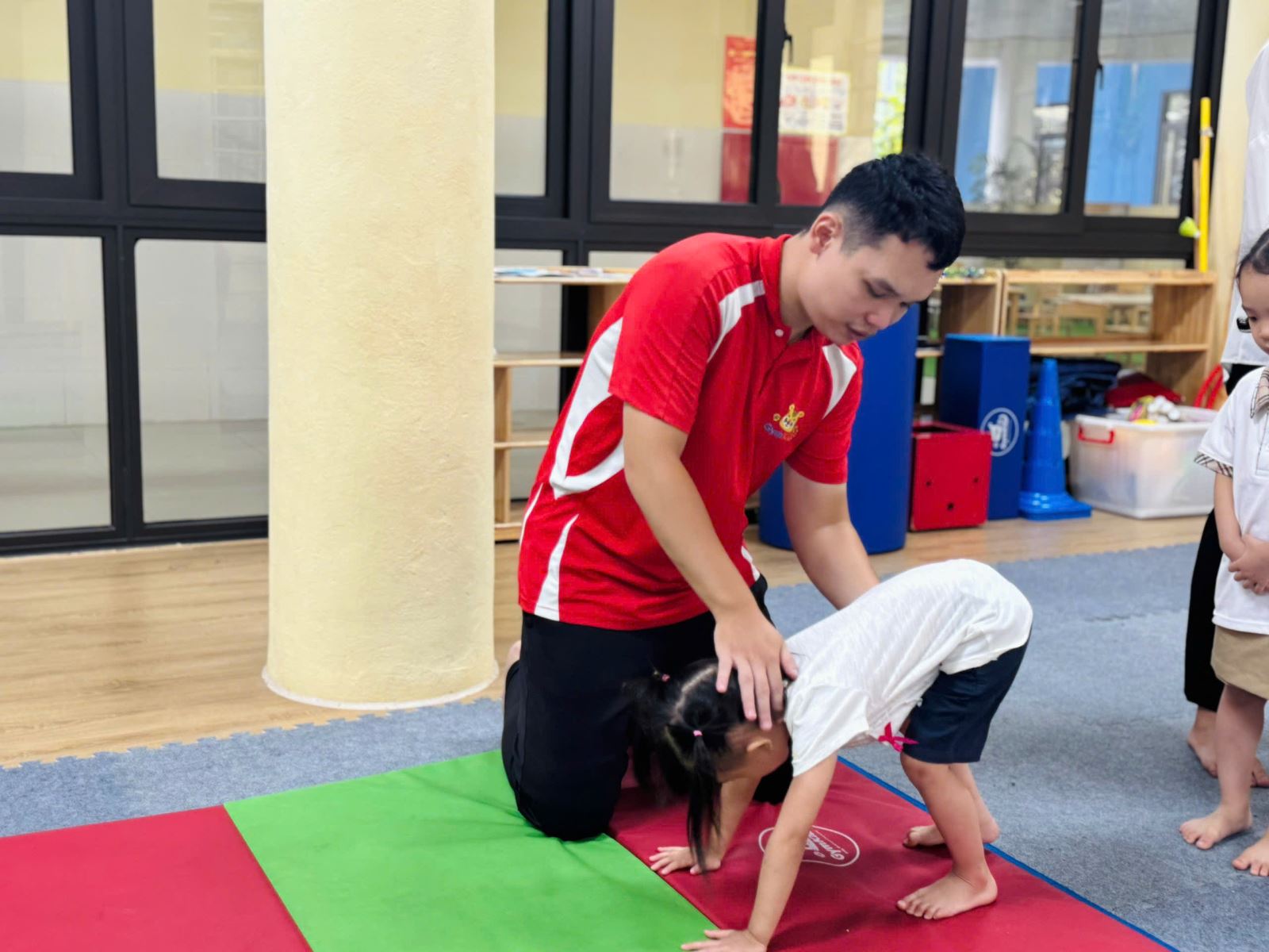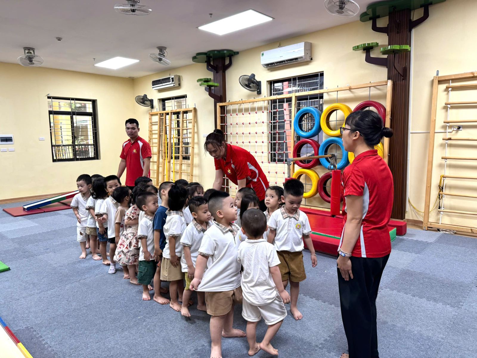 Các bé hào hứng tham gia tập luyện với sự hướng dẫn và hỗ trợ nhiệt tình của các thầy cô .