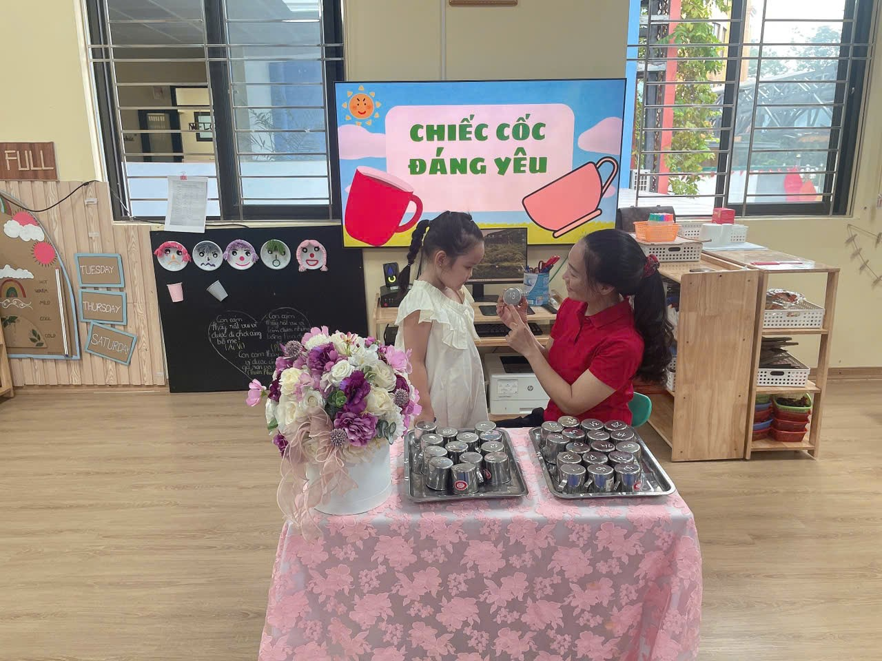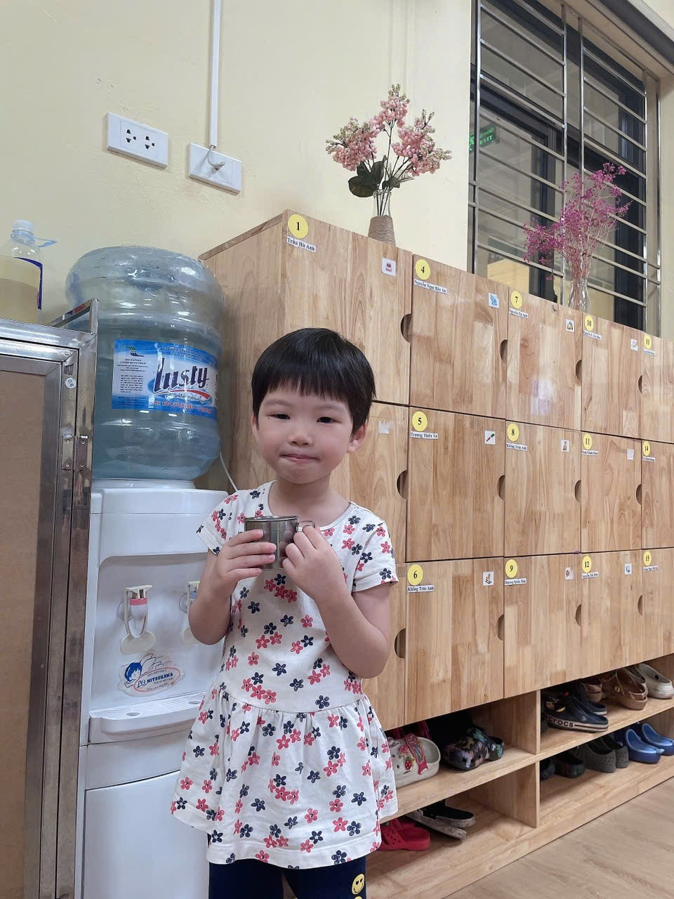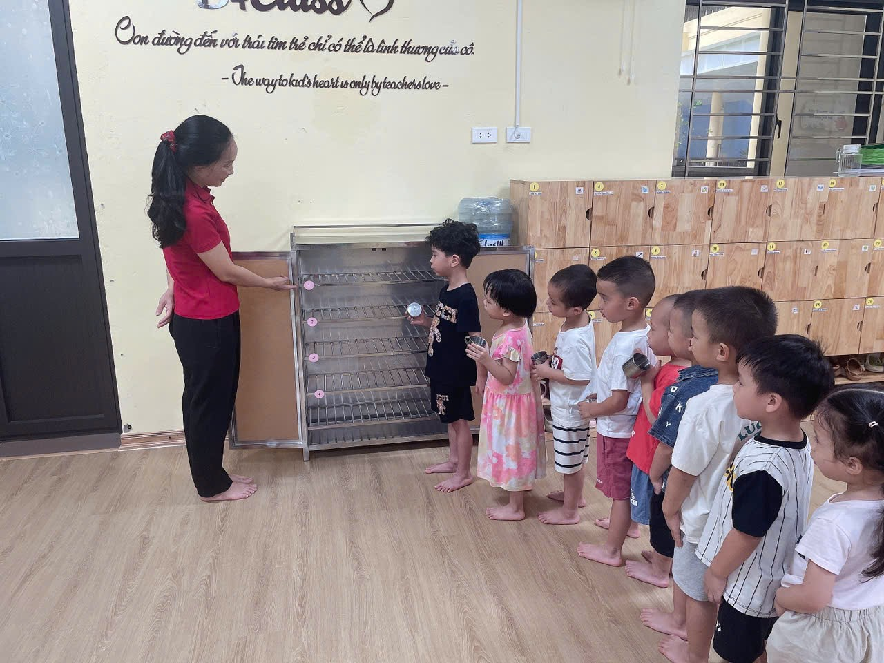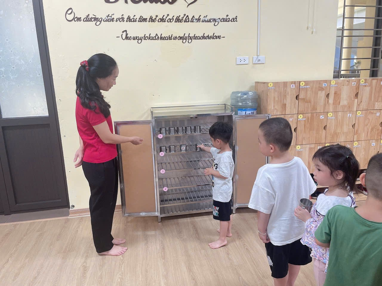 Với sự hướng dẫn tận tình của cô giáo, các bé được làm quen với chiếc cốc uống nước – một vật dụng tưởng chừng đơn giản nhưng lại chứa đựng nhiều bài học quý giá. Các con được học cách phân biệt cốc của mình thông qua màu sắc, hình dán cá nhân hoặc ký hiệu riêng biệt để tránh nhầm lẫn với bạn khác.