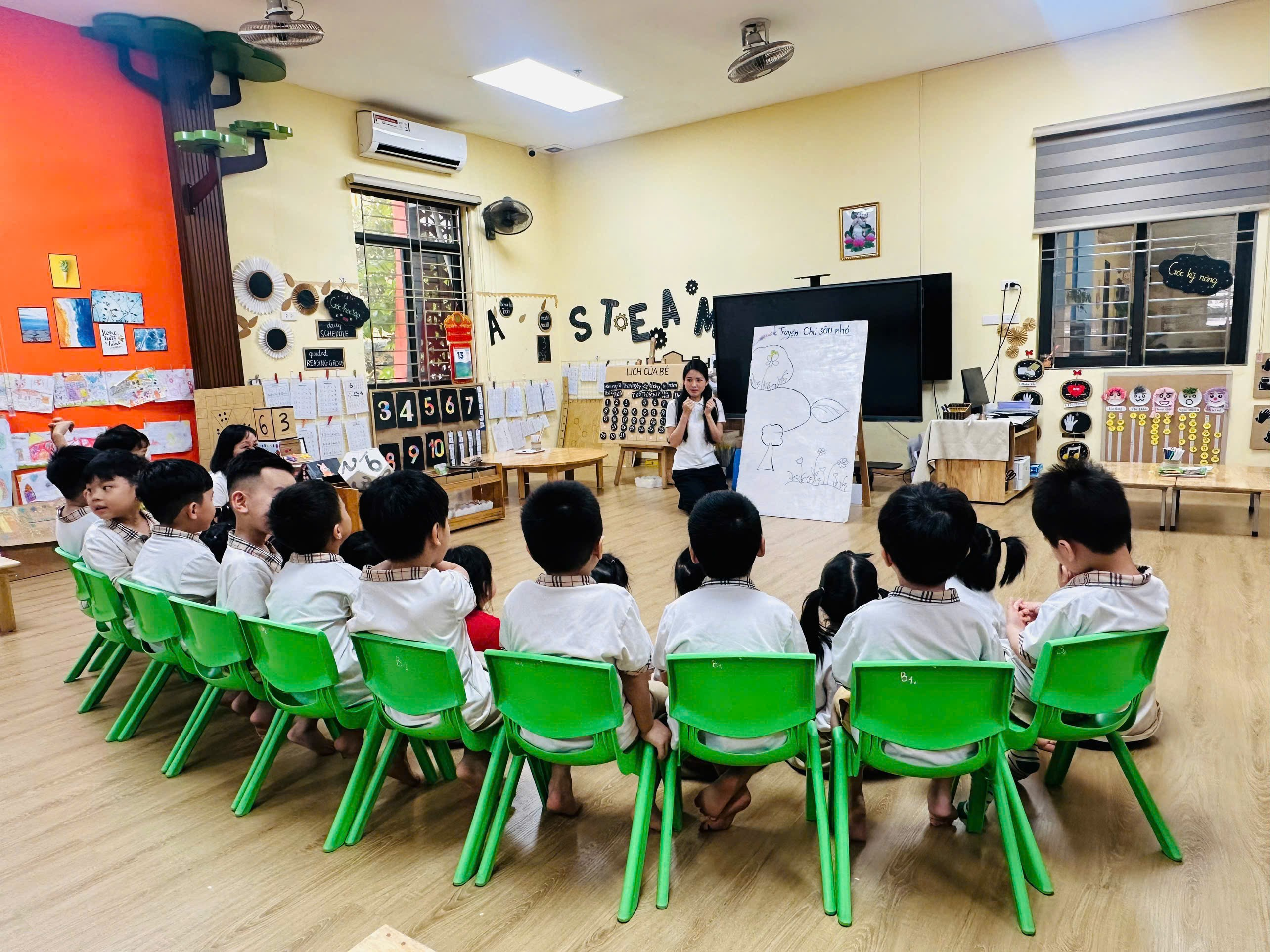 Lớp MGN B1 chào đón các phụ huynh đến tham quan và dự giờ hoạt động LQVH truyện “Chú sâu nhỏ”. Đây không chỉ là một buổi học thường nhật, mà còn là dịp để phụ huynh trực tiếp trải nghiệm phương pháp giảng dạy tiên tiến mà nhà trường đang áp dụng theo trường UNIS Quốc tế
