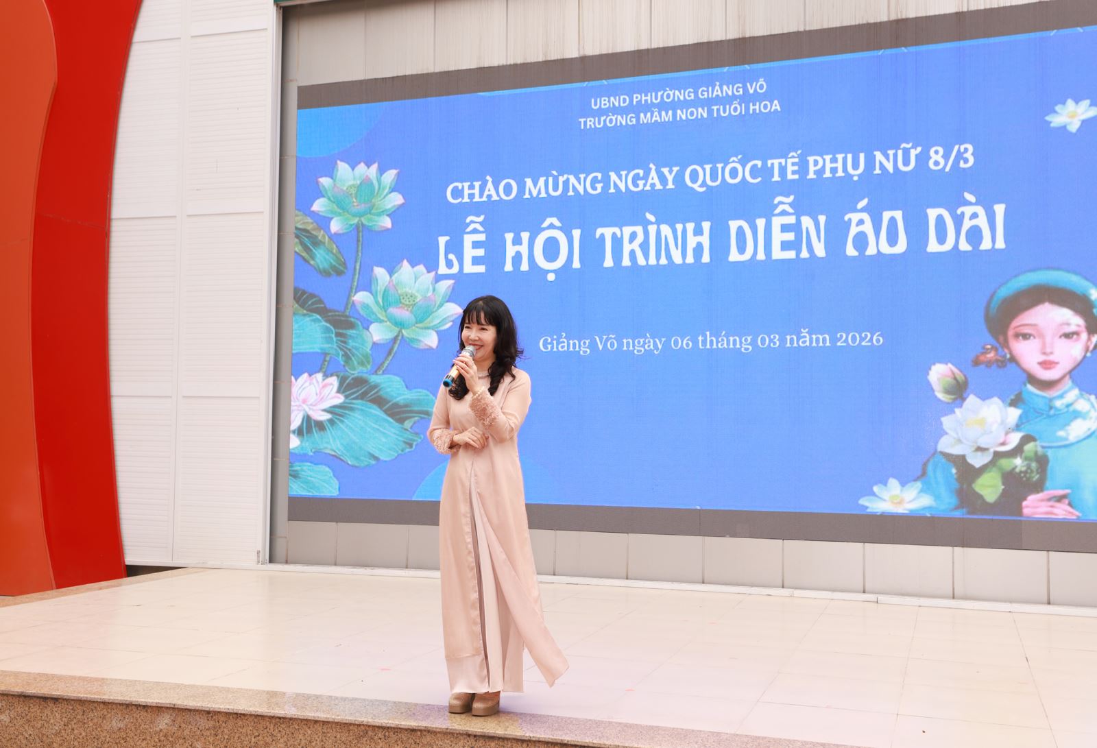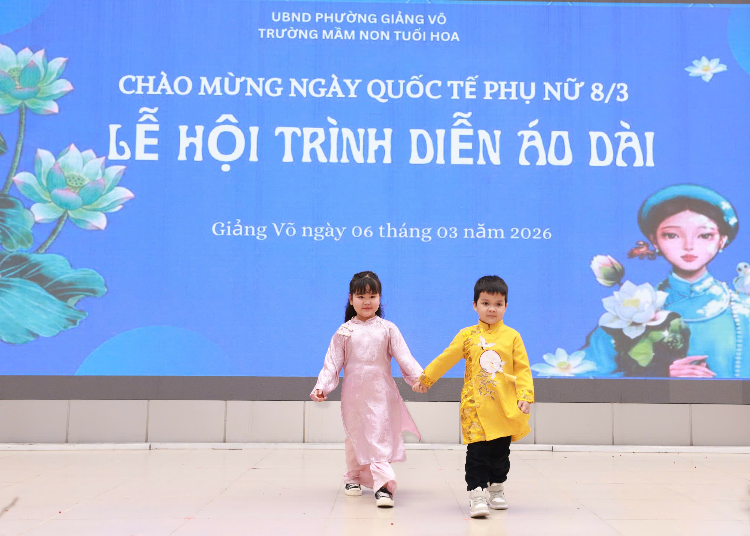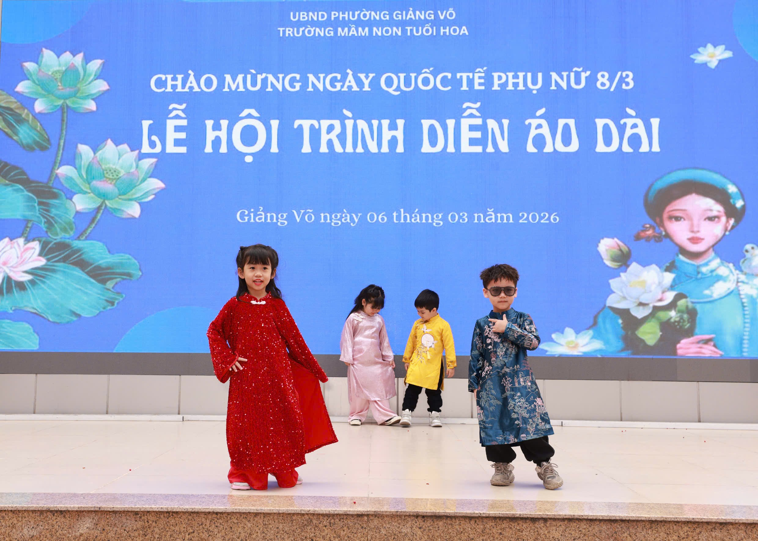 Trong chương trình của nhà trường, các bé được tham gia đồng diễn nghệ thuật sôi động và trình diễn áo dài duyên dáng. Những tà áo dài rực rỡ cùng những bước đi tự tin, đáng yêu của các bé đã tạo nên một không khí thật vui tươi và ấm áp.