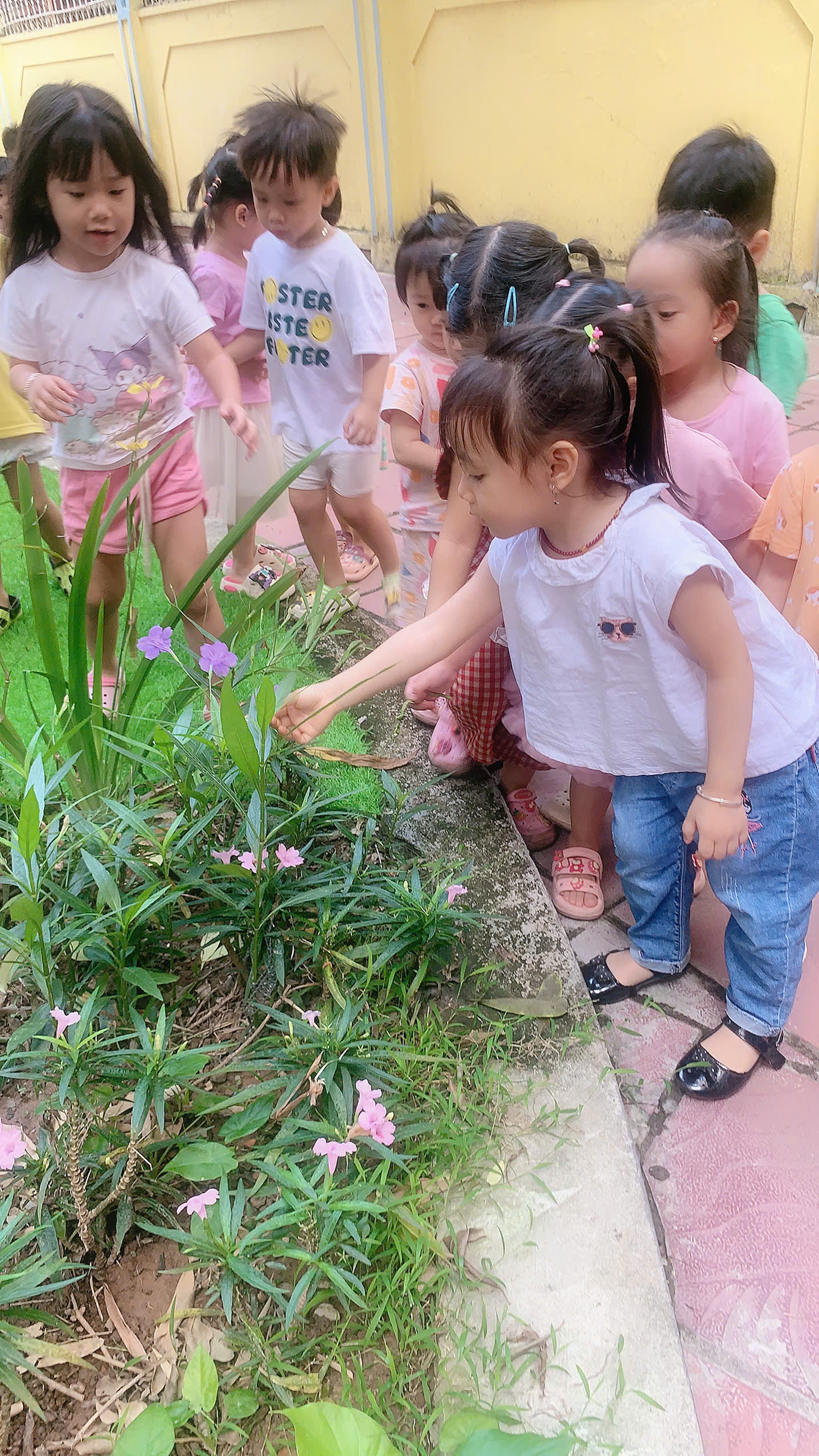 Trong buổi hoạt động quan sát vườn cây, các bé lớp C2 trường Mầm non Tuổi Hoa được tham gia vào nhiều hoạt động khác nhau. Cô giáo hướng dẫn các bé cách nhận biết một số loại rau, loại hoa trong vườn. Các bé háo hức khi được cô chỉ dẫn những đặc điểm của cây rau mồng tơi, cây hoa dẻ quạt…Những đôi tay nhỏ nhắn của các bé háo hức nhặt từng chiếc lá vàng khỏi mặt đất. Tiếng cười vui vẻ vang lên khi các bé hái được những lá rau tươi non. Có bé còn giơ cây rau vừa nhổ được lên khoe với bạn bè và cô giáo. Đây là khoảnh khắc tuyệt vời khi trẻ được tiếp xúc thực tế với cây trồng: ngắm nhìn, sờ, ngửi, được nhổ để quan sát từng bộ phận của cây rau mồng tơi, ngắm ttuwfng cánh hoa màu vàng của bụi hoa dẻ quạt. Những câu hỏi thú vị được đặt ra để các bé khám phá như "Lá của rau này có hình gì?,cánh hoa màu gì ", "Rau này thường ăn như thế nào?", tạo điều kiện để trẻ phát triển khả năng quan sát và tư duy. Sau khi hái rau, các bé được ngắm nhìn, sờ vào từng cây rau, cảm nhận sự mềm mại của lá, mùi thơm đặc trưng của rau tươi. Điều này giúp trẻ hình thành cảm nhận trực quan, phân biệt được các loại rau khác nhau thông qua giác quan.