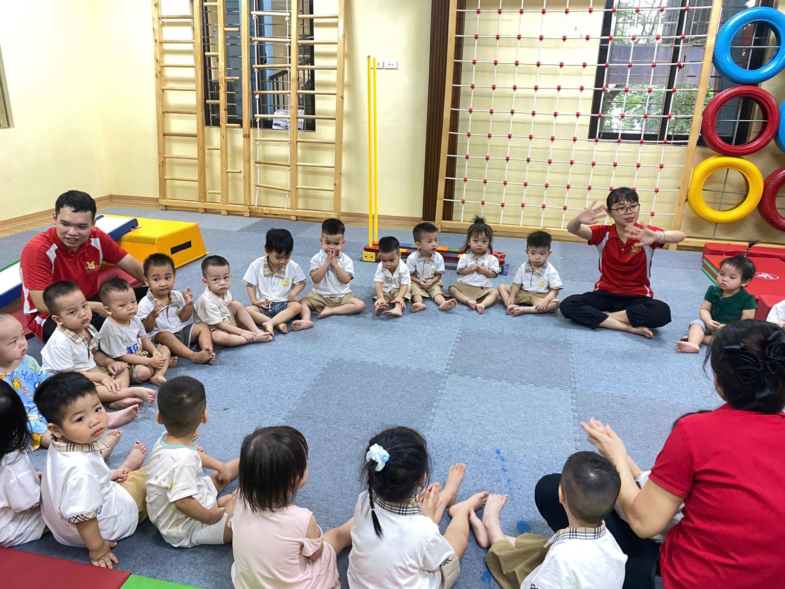 Hình ảnh các con HS tập chuỗi bài tập Gymkid dưới sự hướng dẫn của cô giáo