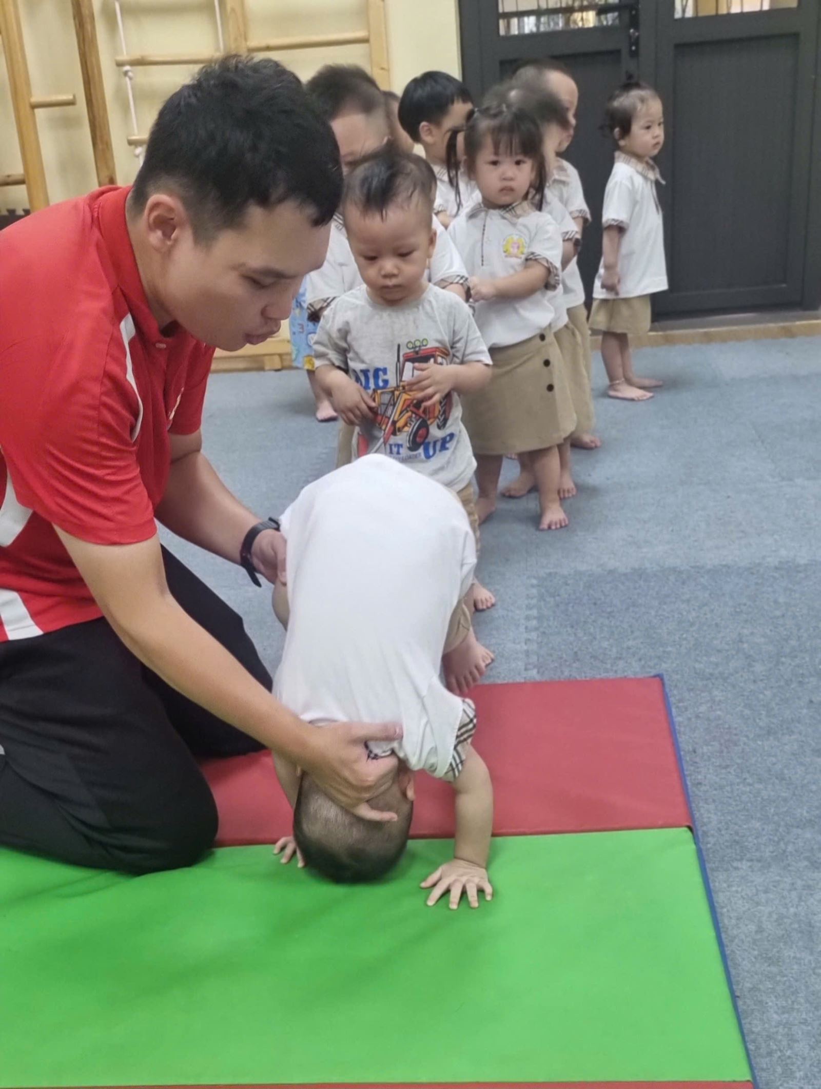 Hình ảnh các con HS tập chuỗi bài tập Gymkid dưới sự hướng dẫn của thầy giáo