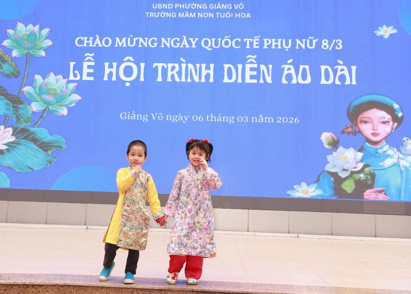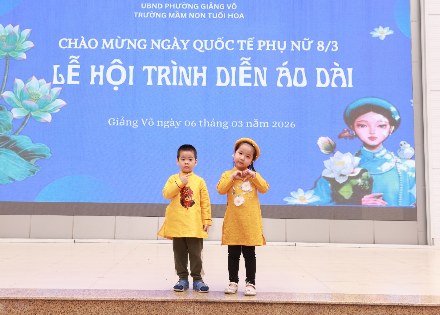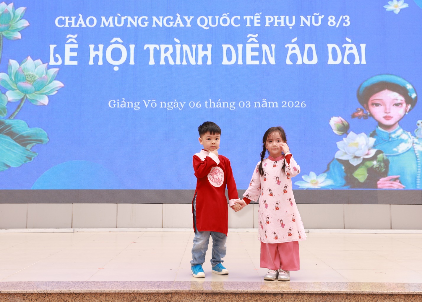 Trong không khí hân hoan chào mừng ngày Quốc tế Phụ nữ 8/3, lớp MGN B1 đã mang đến phần thi duyên dáng áo dài thật rực rỡ. Các bé bước lên sân khấu với sự tự tin, hồn nhiên và duyên dáng, khiến khán giả vô cùng thích thú. Nhờ sự luyện tập chăm chỉ cùng sự hướng dẫn tận tình của các cô giáo, các con đã biết cách lắng nghe nhạc điệu, làm chủ chiếc áo dài và bước đi đầy tự tin. Từng động tác nhỏ bé nhưng tràn đầy sự cố gắng đã tạo nên một phần thi xuất sắc, thể hiện sự thông minh và nỗ lực của các con. Cuộc thi là dịp để các bé gửi gắm tình cảm đến mẹ, đến cô giáo và những người phụ nữ thân yêu. Thông điệp của lớp MGN B1 được thể hiện qua hai câu đối đầy ý nghĩa: • “Mẹ hiền như suối ngọt” • “Ngày 8 tháng 3 ngập tràn yêu thương” Những lời chúc hồn nhiên ấy chính là món quà tinh thần mà các bé muốn dành tặng, thể hiện tình yêu thương trong sáng của tuổi thơ. Phần thi duyên dáng áo dài của lớp MGN B1 đã trở thành điểm nhấn trong chương trình, vừa là sân chơi bổ ích cho các bé, vừa là niềm tự hào của tập thể. Thành công ấy là kết quả của sự đồng hành tận tâm của các cô giáo và sự cố gắng không ngừng của các con.