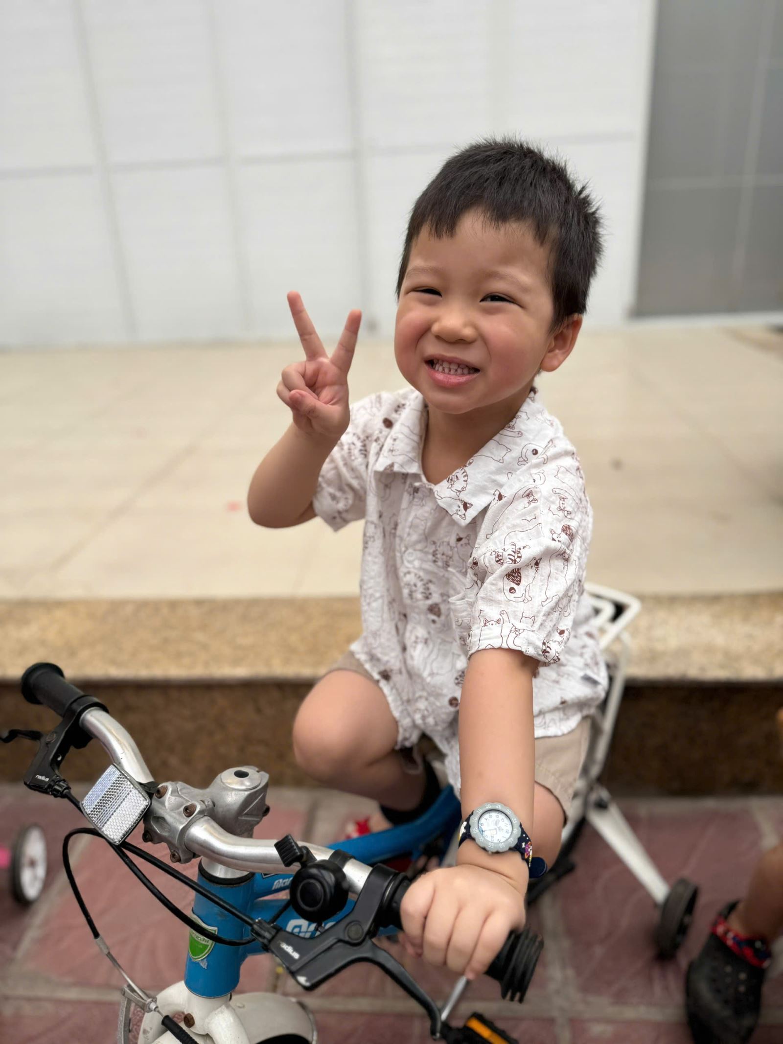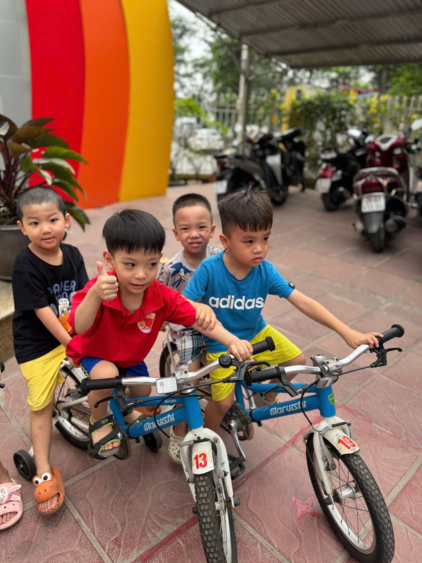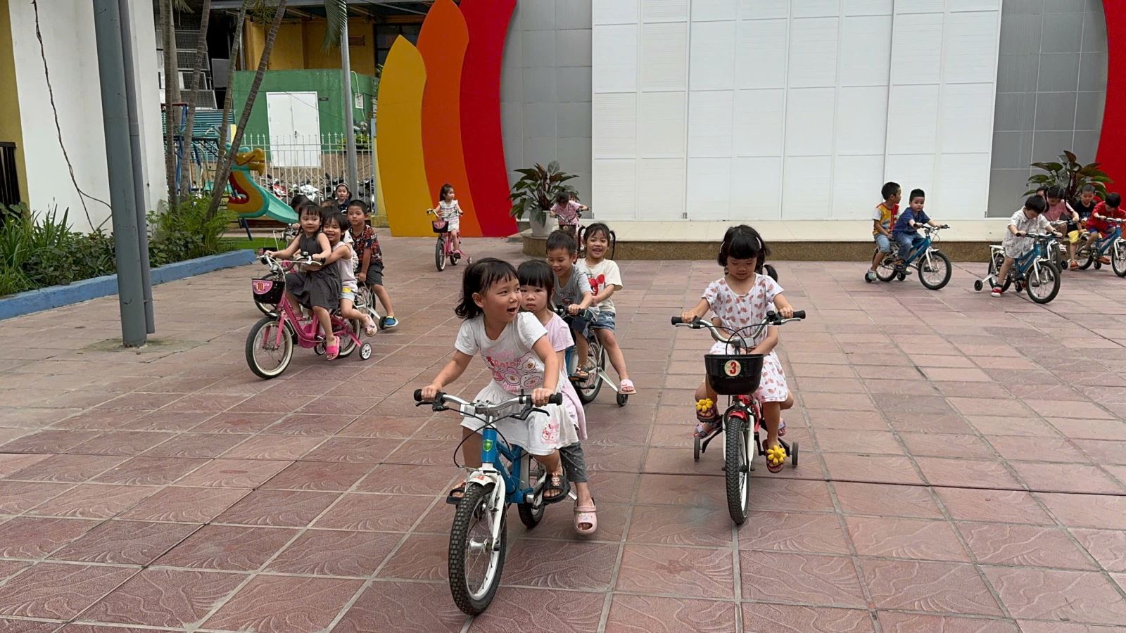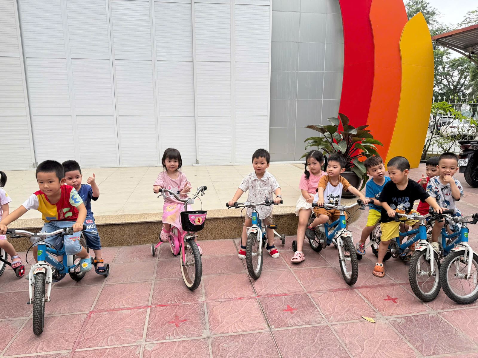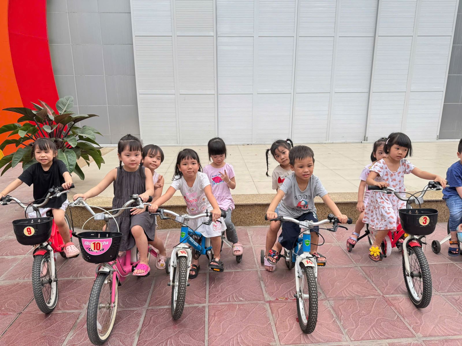 Các bé lớp B2 hào hứng tham gia hoạt động đi xe đạp, rèn luyện thể chất, tăng sự tự tin và phát triển kỹ năng vận động.
