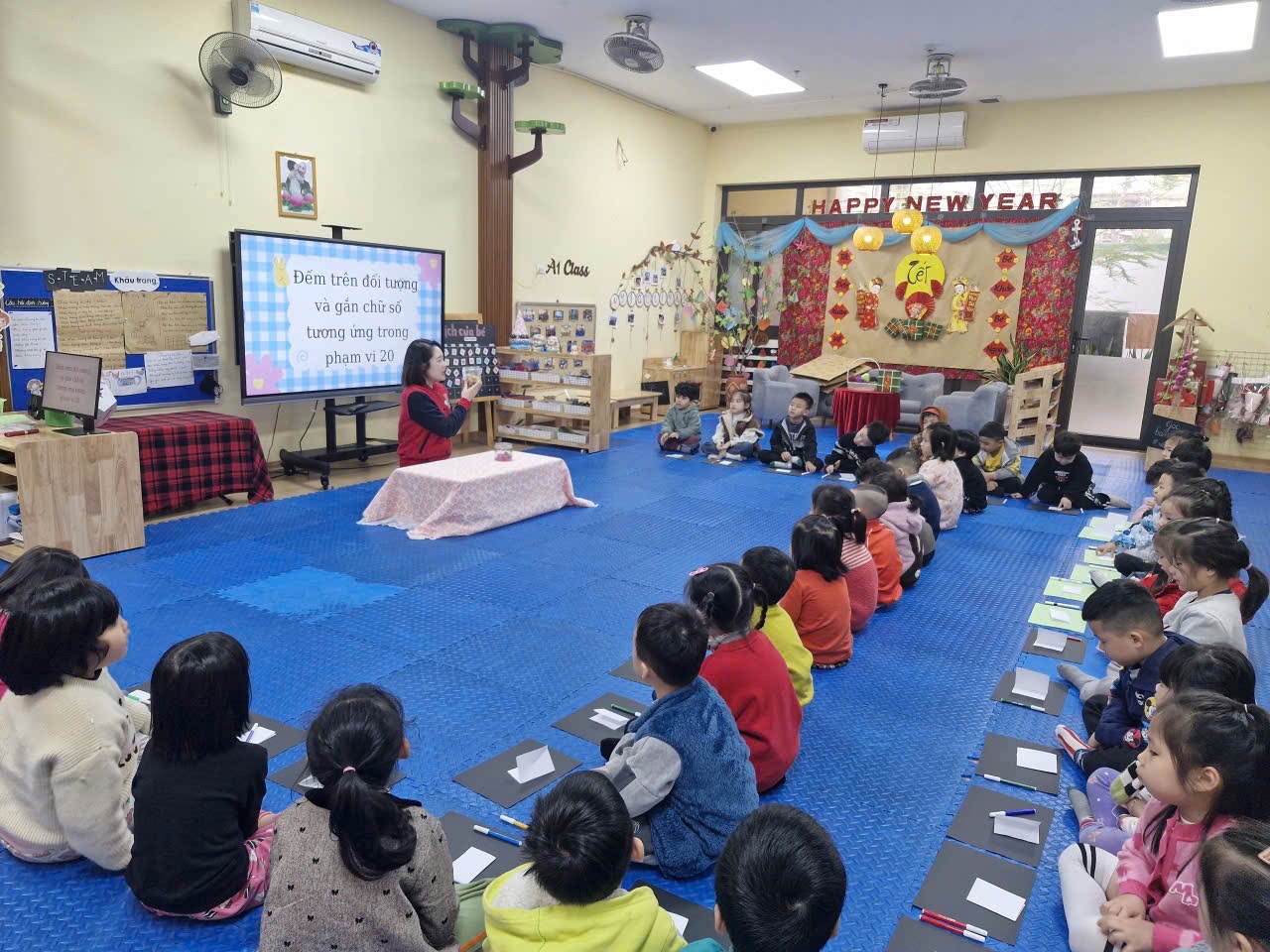 Thông qua các đồ dùng học tập gần gũi, sinh động, các con được trực tiếp đếm số lượng trên các đối tượng, rèn kỹ năng quan sát, so sánh và tư duy logic. Không chỉ dừng lại ở việc đếm, các bé còn được gắn chữ số phù hợp với số lượng, giúp trẻ ghi nhớ mặt số, hiểu mối quan hệ giữa số và lượng một cách tự nhiên, hiệu quả.