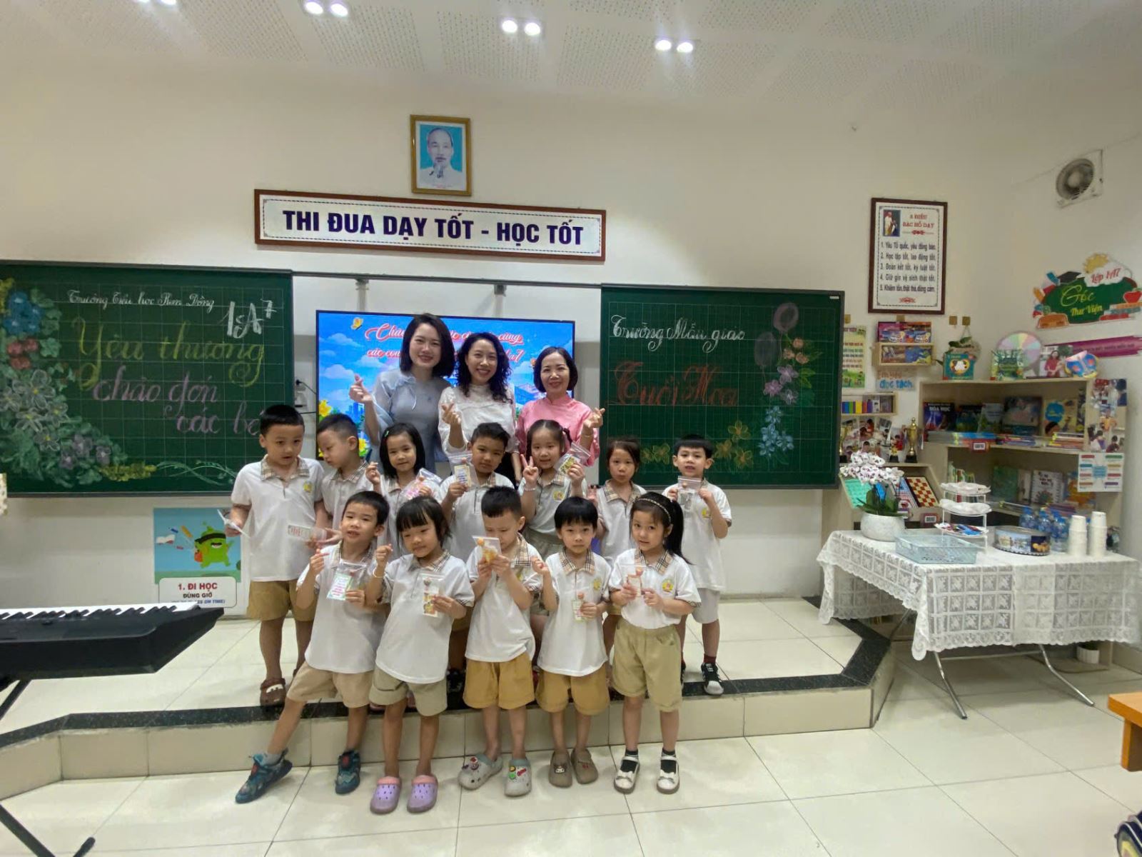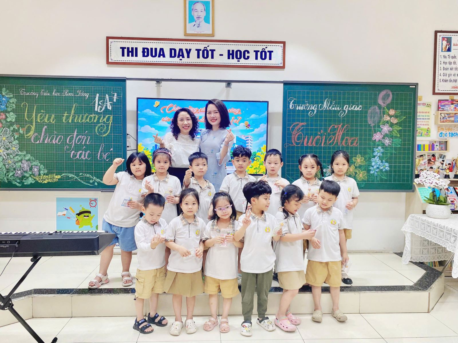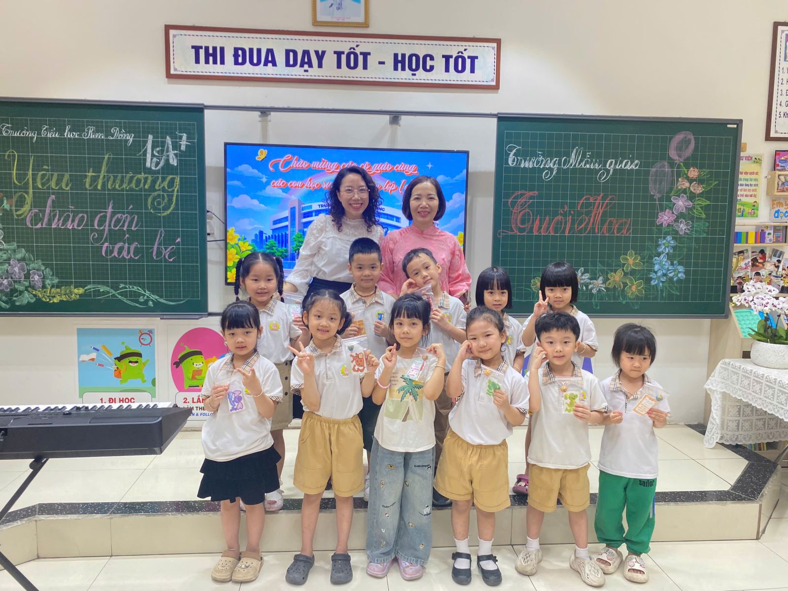 BGH trường mầm non Tuổi Hoa chụp ảnh kỷ niệm cùng BGH trường tiểu học Kim Đồng và cô, trò lớp MGL A1