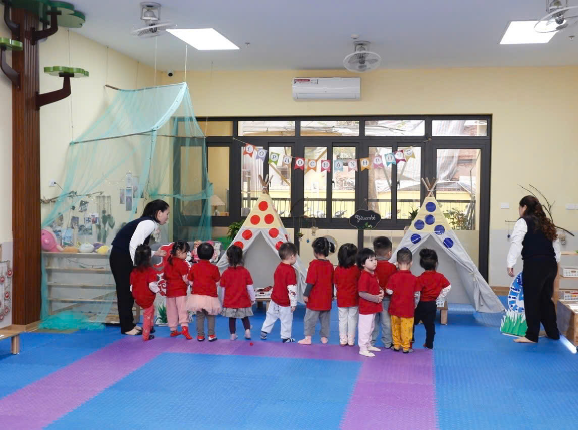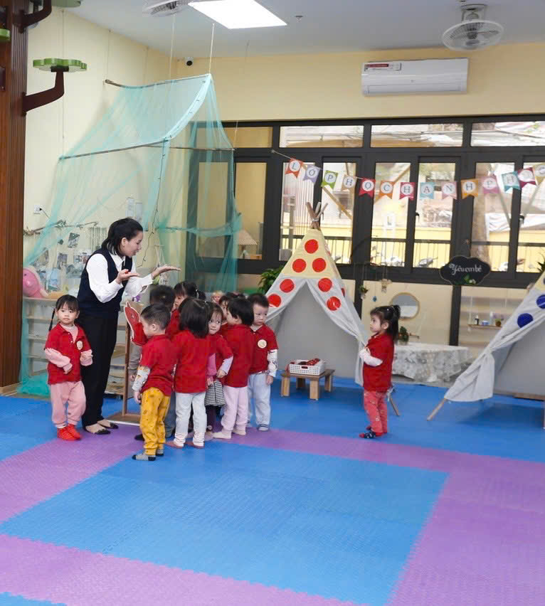 Cô và trò lớp D2 tham gia hoạt động nhận biết màu xanh- màu đỏ