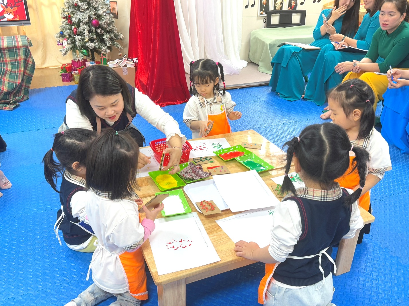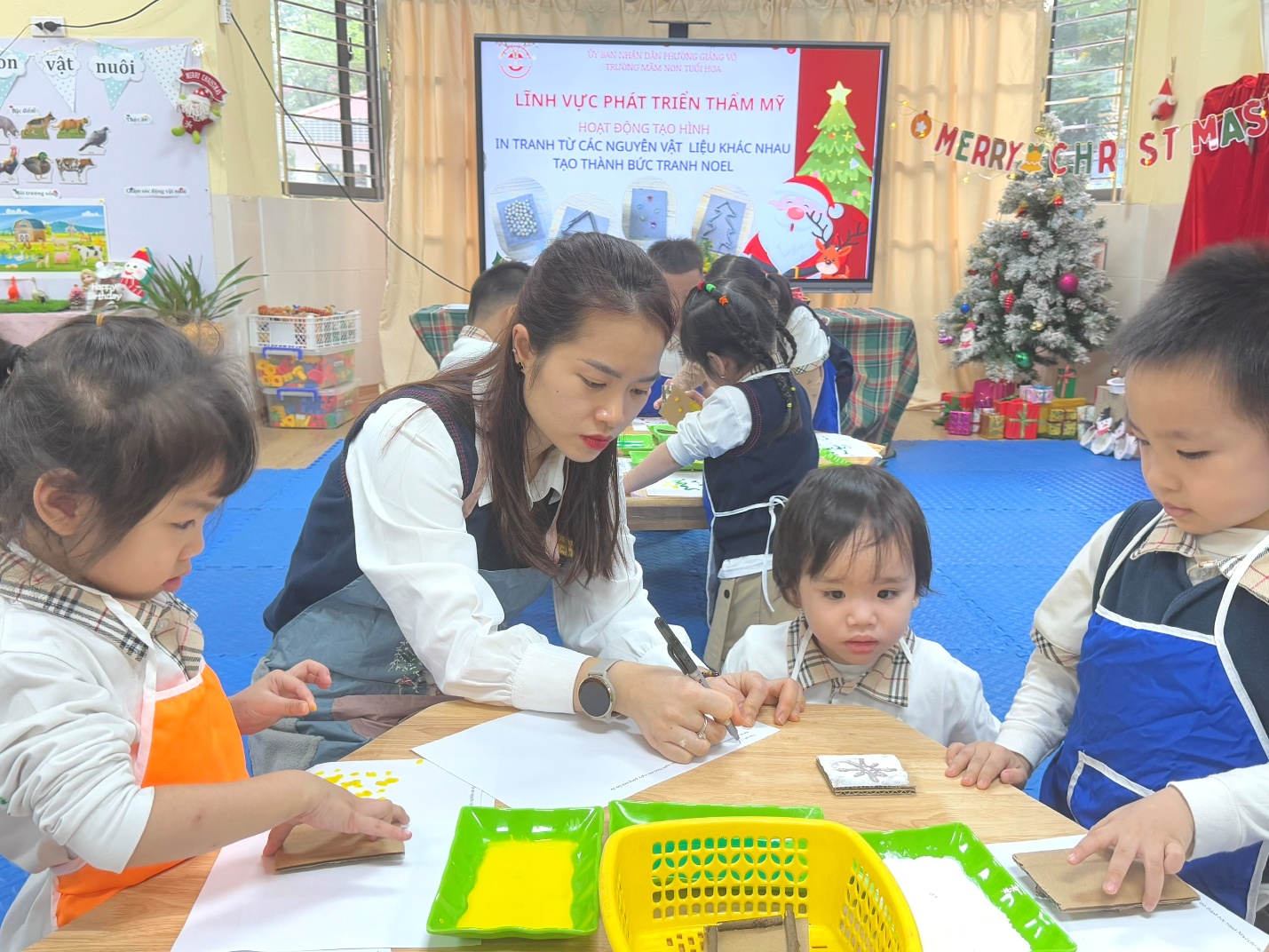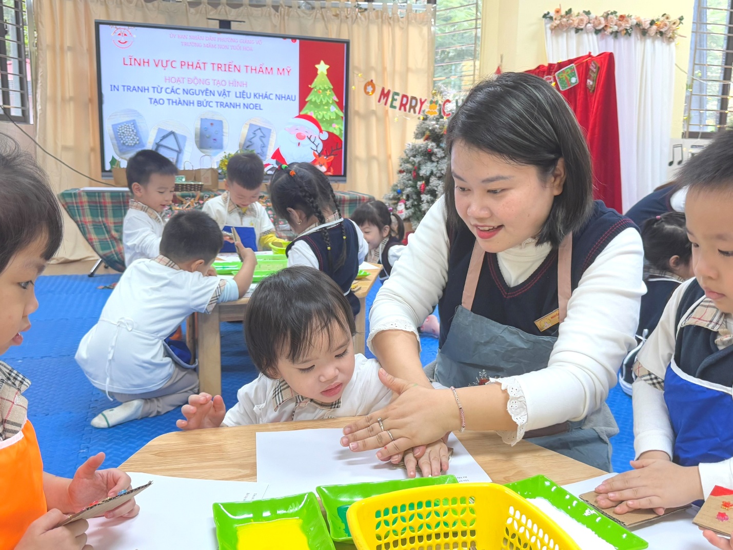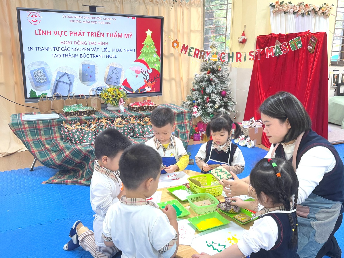 Lớp Mẫu giáo bé C1 rất vui mừng, vinh dự được đón tiếp các bác, các cô xã Phú Lương đến thăm quan, học tập môi trường và các hoạt động giáo dục tại lớp. Trong buổi kiến tập, các cô giáo và các con đã tổ chức hoạt động học vô cùng sinh động với nội dung “In tranh từ các nguyên vật liệu khác nhau”. Từ dây thừng, miếng xốp, bìa cứng…, các bé đã khéo léo tạo nên những bức tranh Noel đầy màu sắc và sáng tạo. Hoạt động không chỉ giúp trẻ phát huy trí tưởng tượng mà còn rèn luyện sự khéo léo và hứng thú trong học tập. Không khí lớp học diễn ra sôi nổi, vui tươi với sự tham gia tích cực của các con.