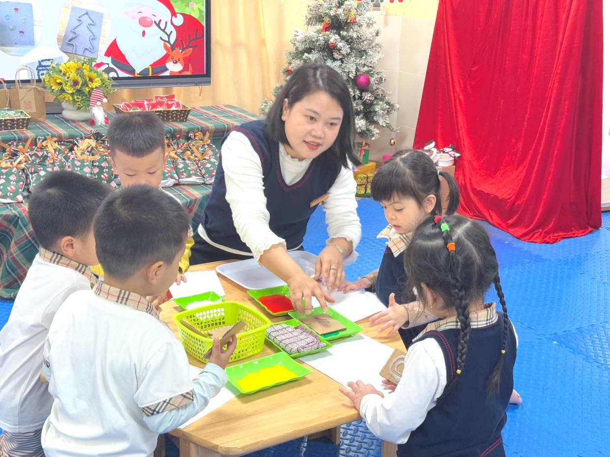 Hình ảnh cô hướng dẫn trẻ kỹ năng ấn nguyên liệu tạo thành bức tranh