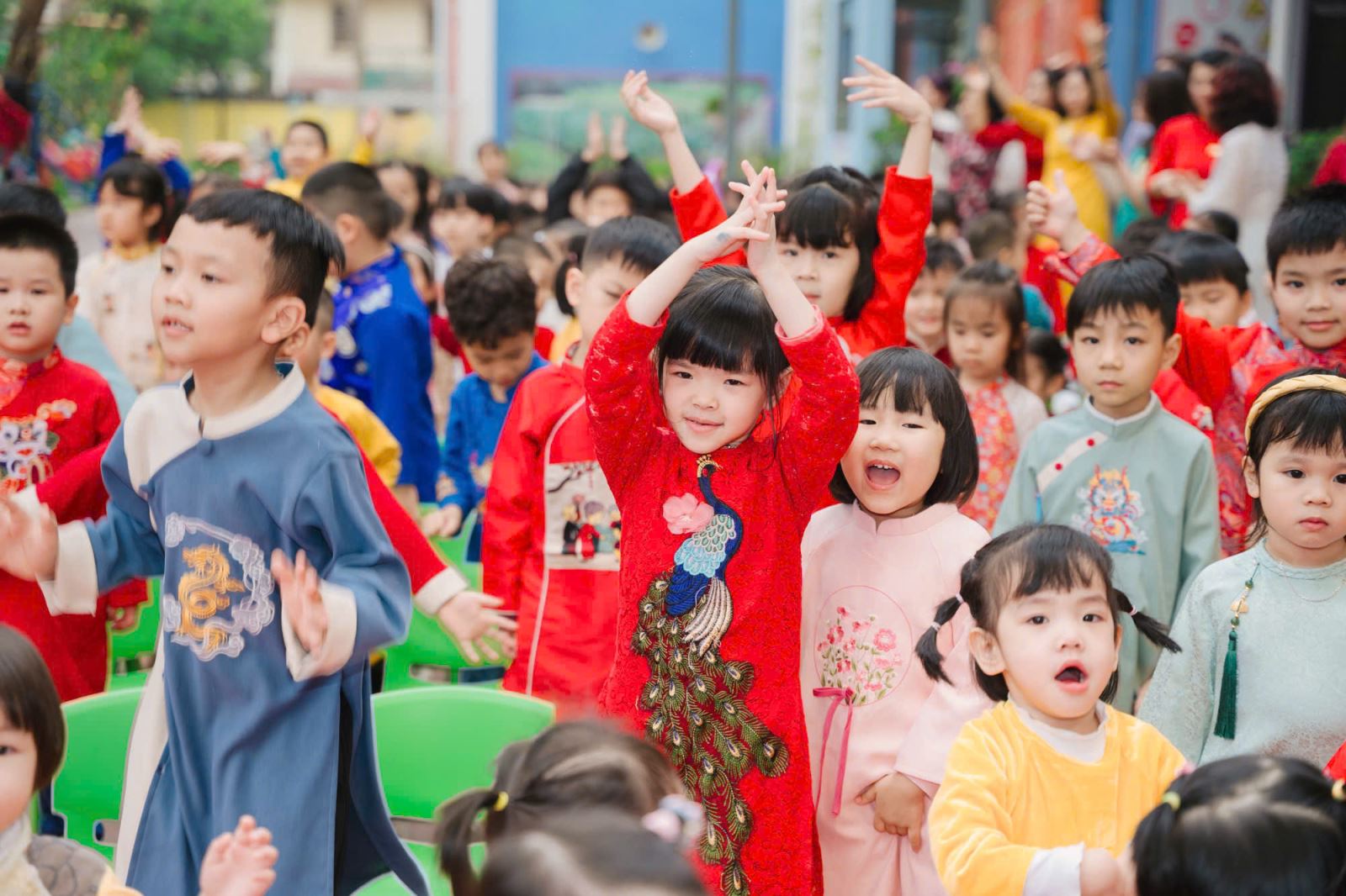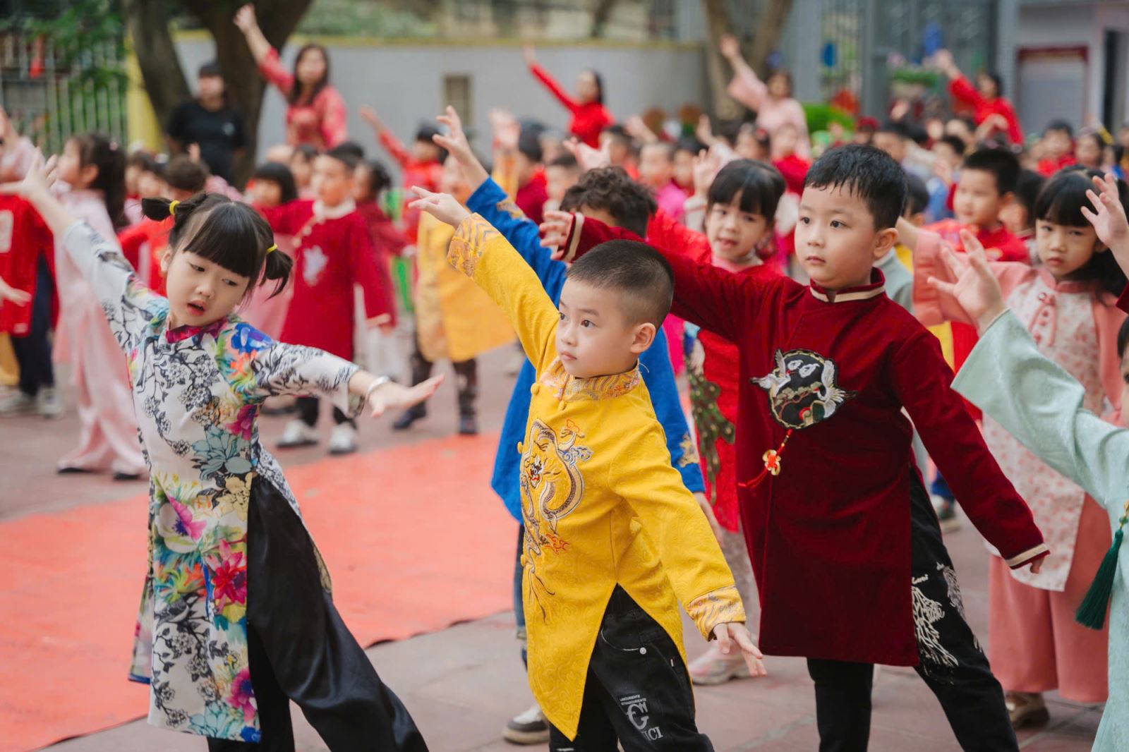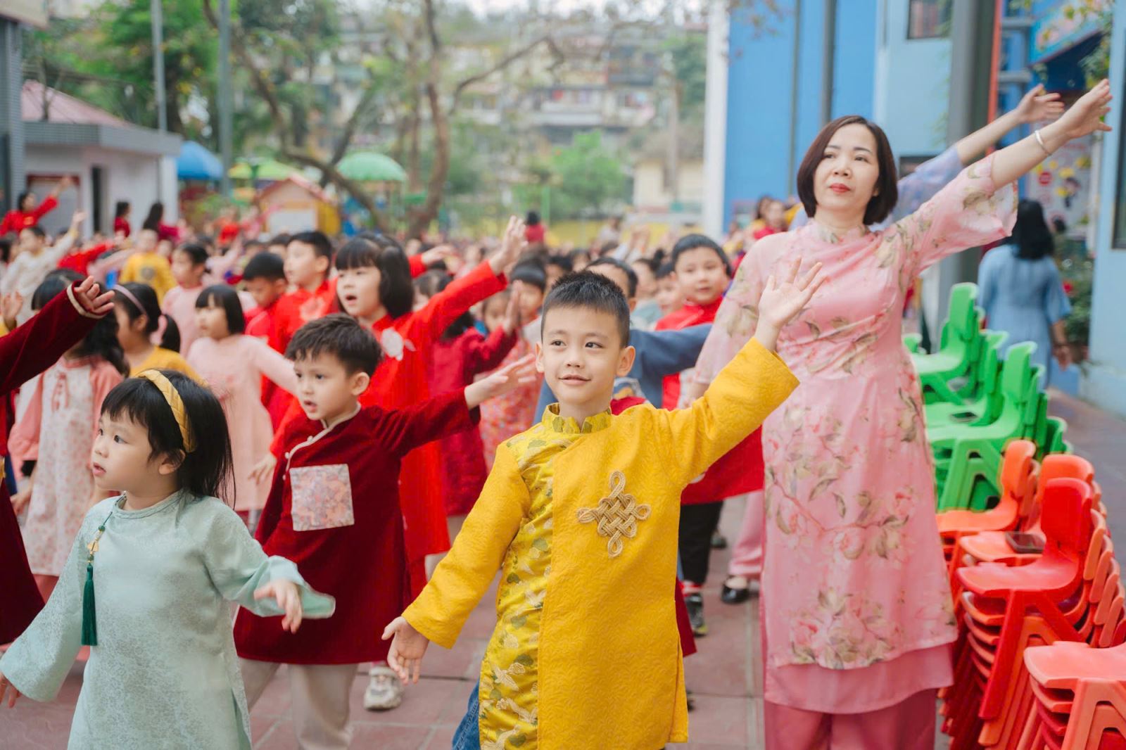 Ngay từ sáng sớm, không khí tại trường đã trở nên rộn ràng hơn bao giờ hết. Các bé lớp A1 xuất hiện trong những bộ áo dài rực rỡ sắc màu, đầy hứng khởi. Các bé trai diện áo dài truyền thống, trong khi các bé gái duyên dáng với những tà áo dài thướt tha, tạo nên một khung cảnh vô cùng đẹp mắt.
