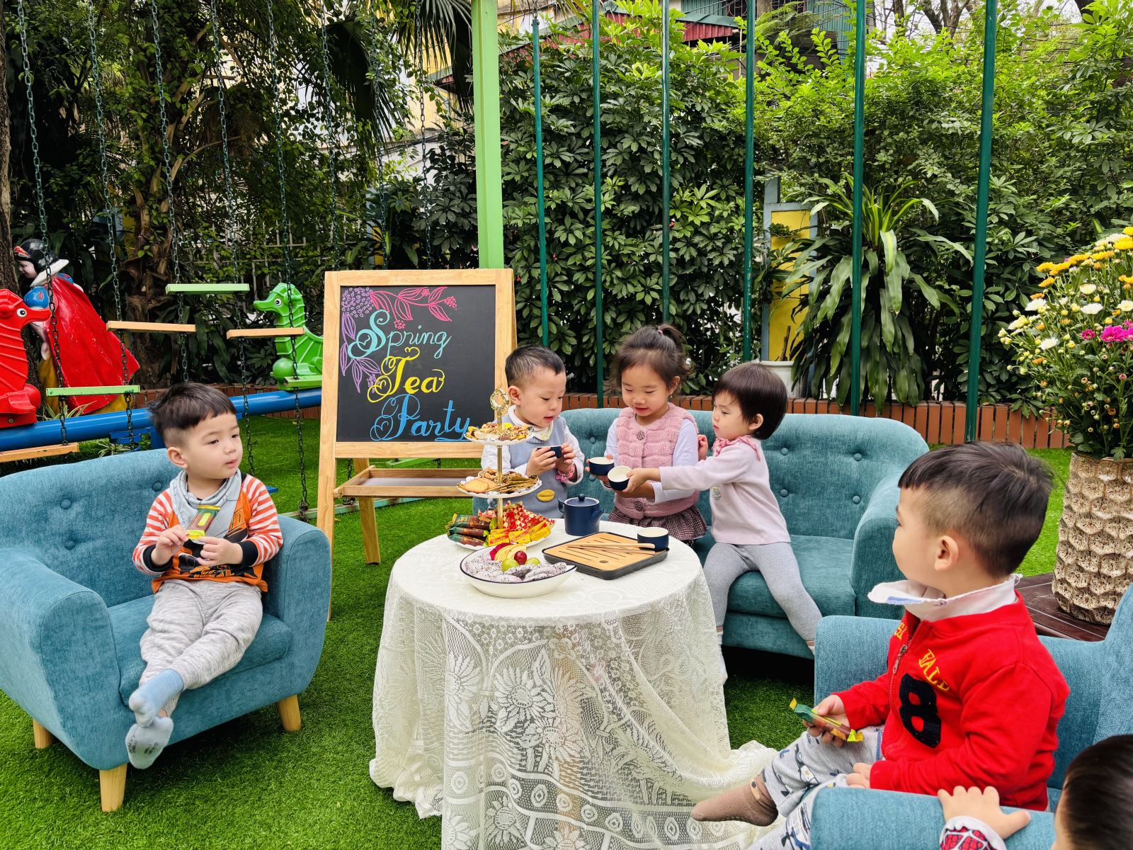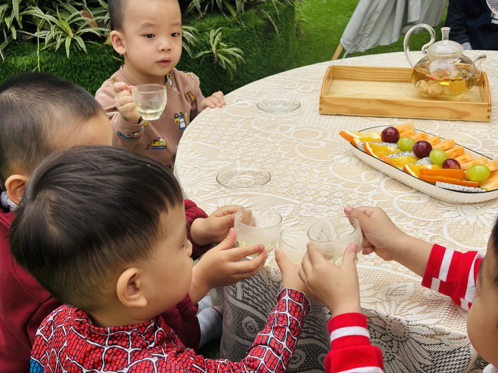 Hôm nay các bé lớp Nhà trẻ D2 đã có một trải nghiệm thật vui và đáng nhớ với hoạt động tiệc trà nhỏ xinh tại lớp. Các con được ngồi quây quần bên nhau, cùng thưởng thức những chiếc bánh ngọt, nhâm nhi ly trà (nước trái cây) và trò chuyện rôm rả.