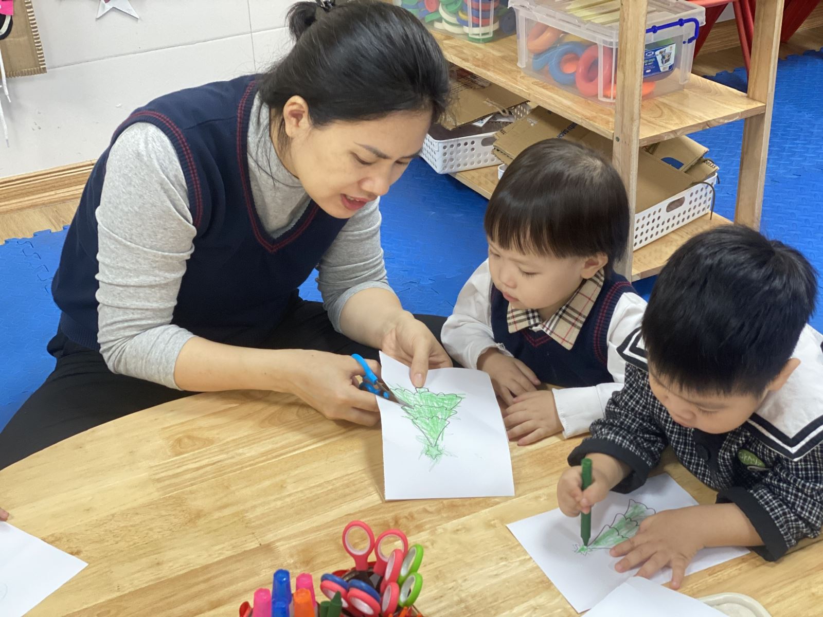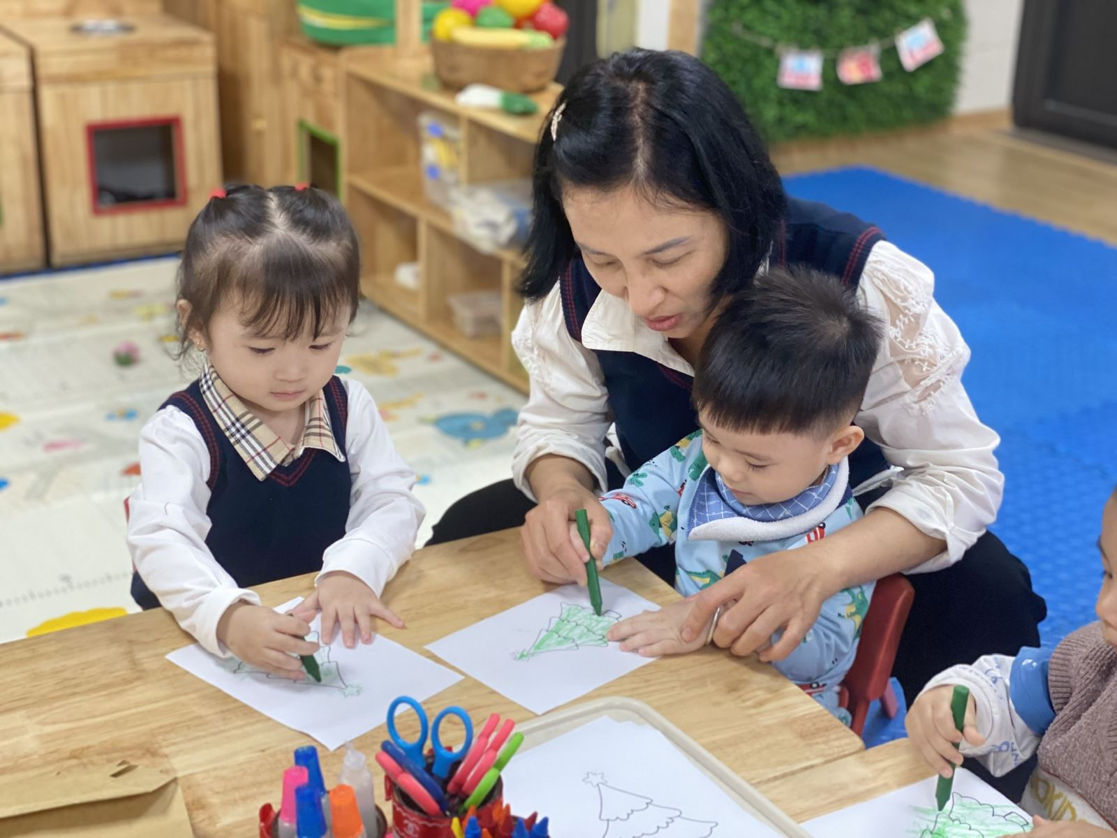 Các bé được cô hướng hướng dẫn tô màu cây thông