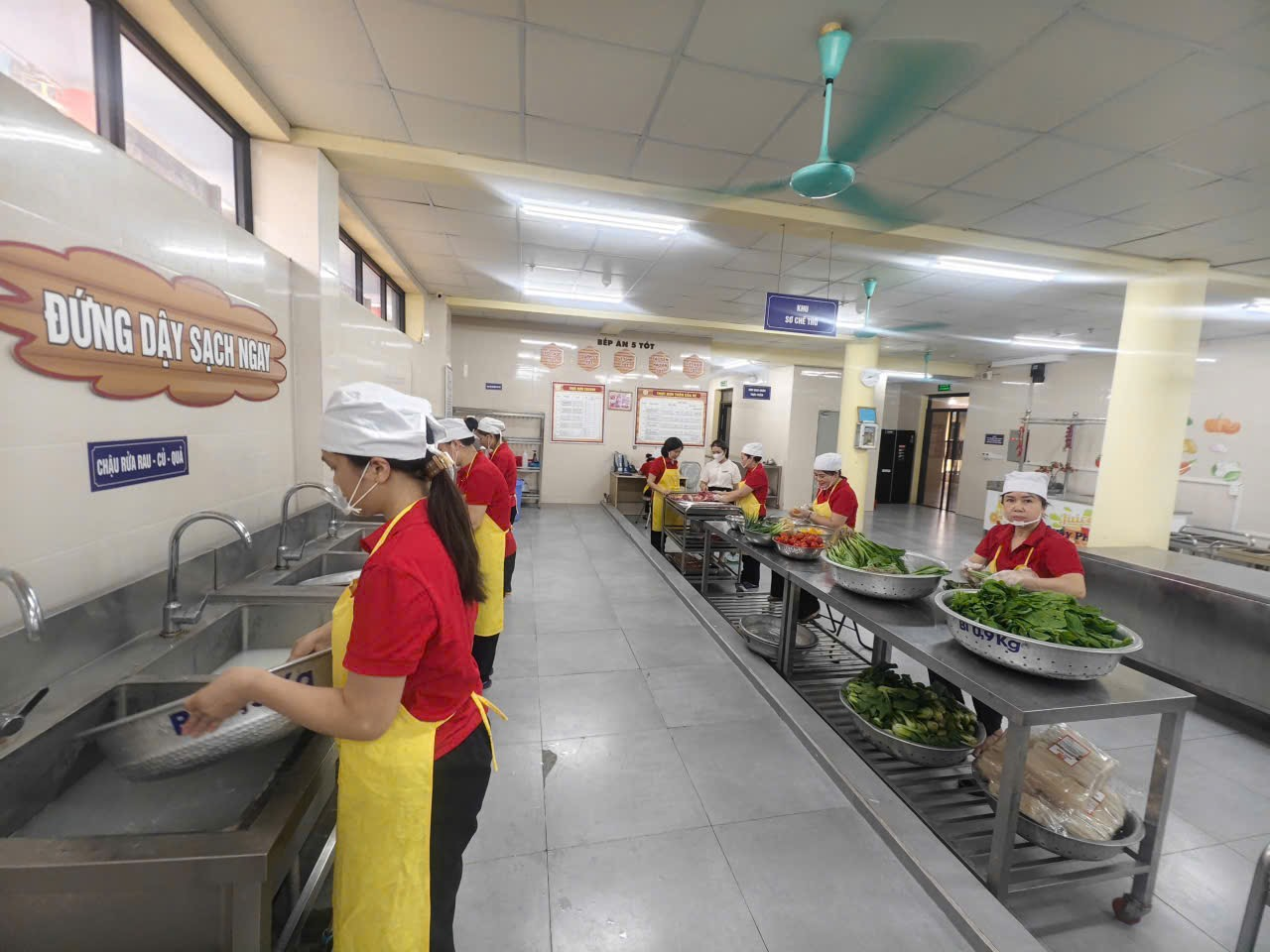 Với mô hình bếp một chiều để tránh lẫn lộn giữa thực phẩm sống và chín, đảm bảo vệ sinh tuyệt đối. Sau khi chế biến, thành phẩm được chuyển xuống lớp học theo đúng quy trình, sẵn sàng phục vụ các con.