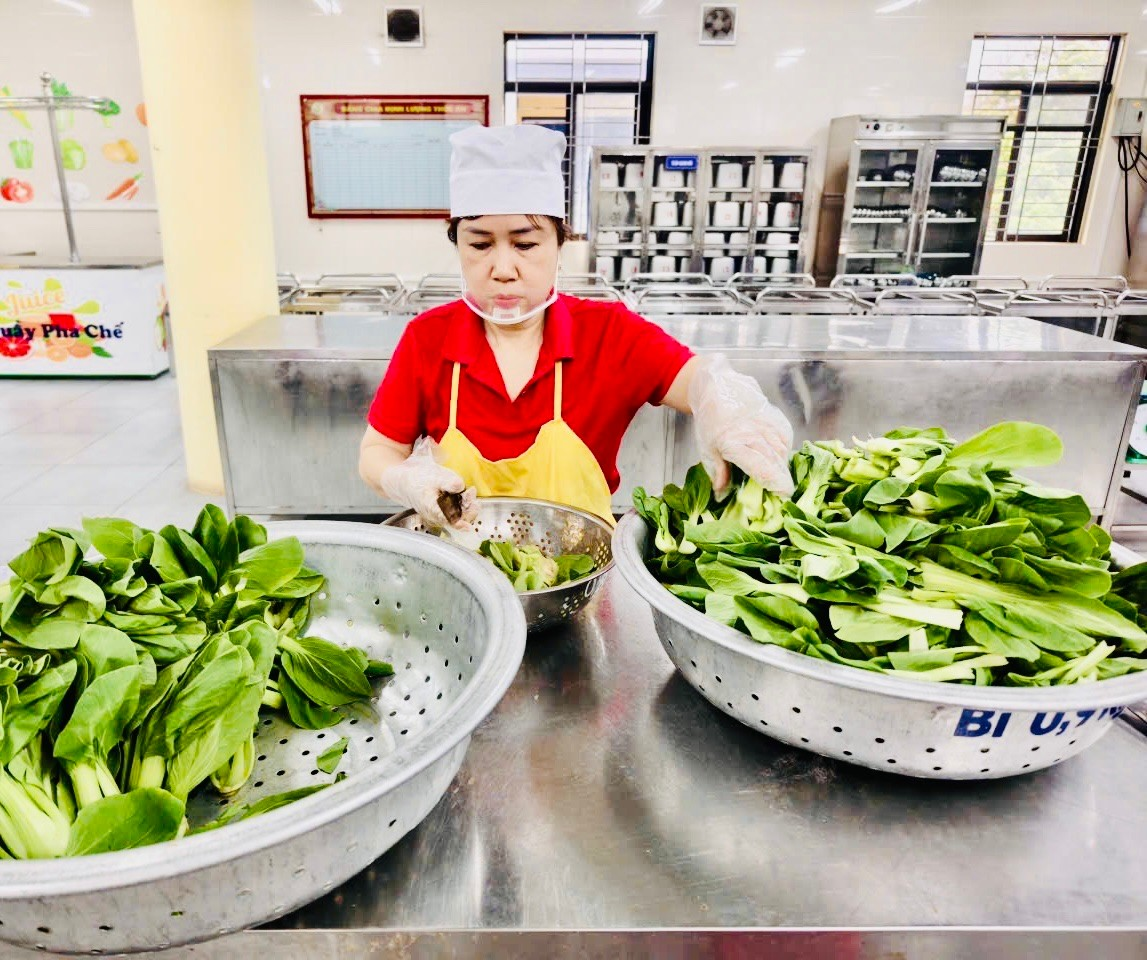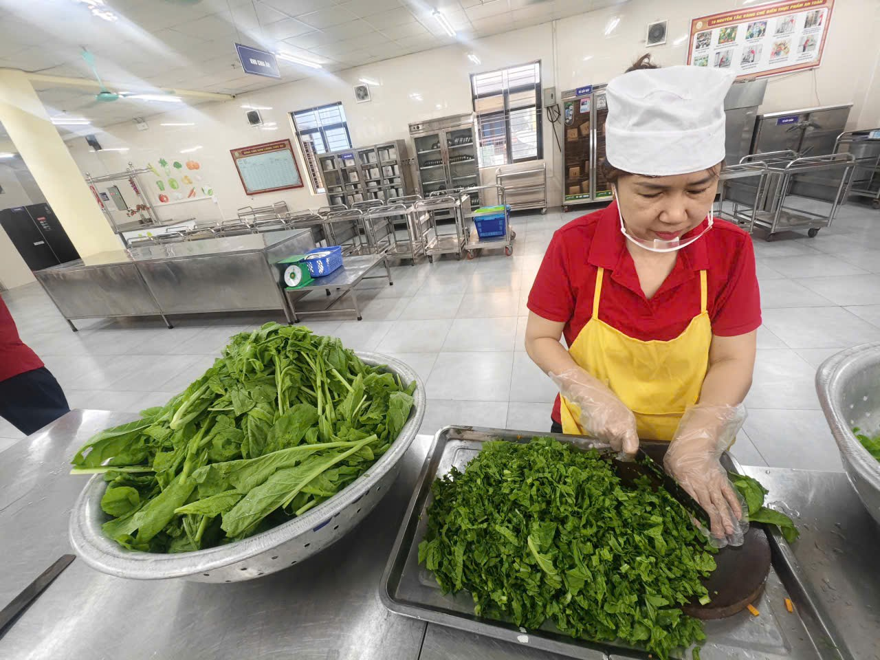 Nhân viên nuôi dưỡng tiến hành sơ chế rau sau khi đã được rửa sạch.