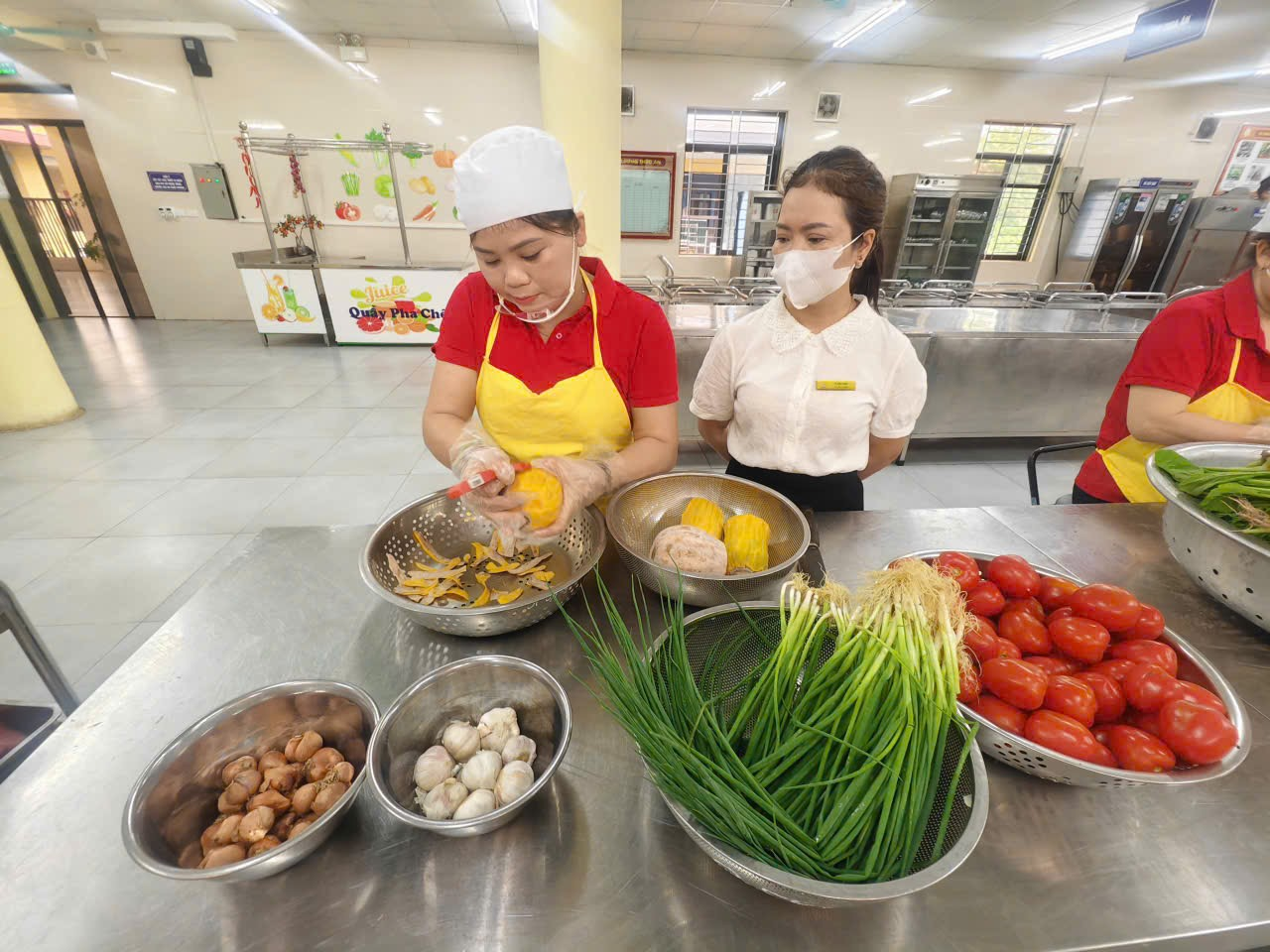 Nhân viên nuôi dưỡng tiến hành sơ chế thực phẩm