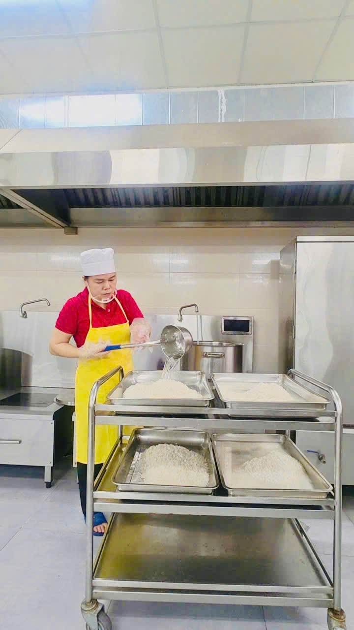 Nhân viên nuôi dưỡng tiến hành đong nước vào gạo để đưa vào tủ nấu cơm.
