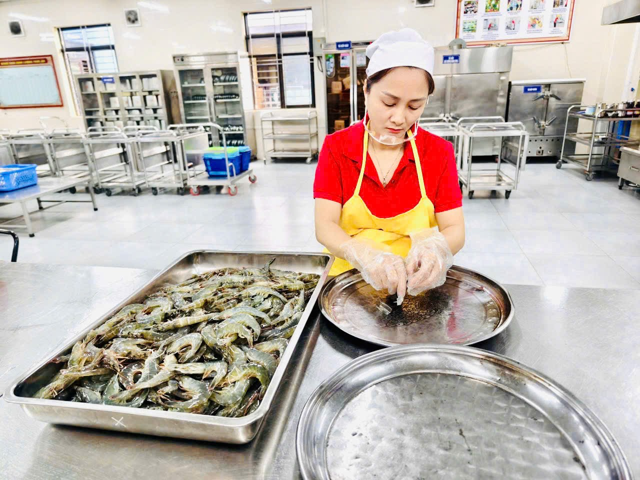Nhân viên nuôi dưỡng tiến hành sơ chế tôm