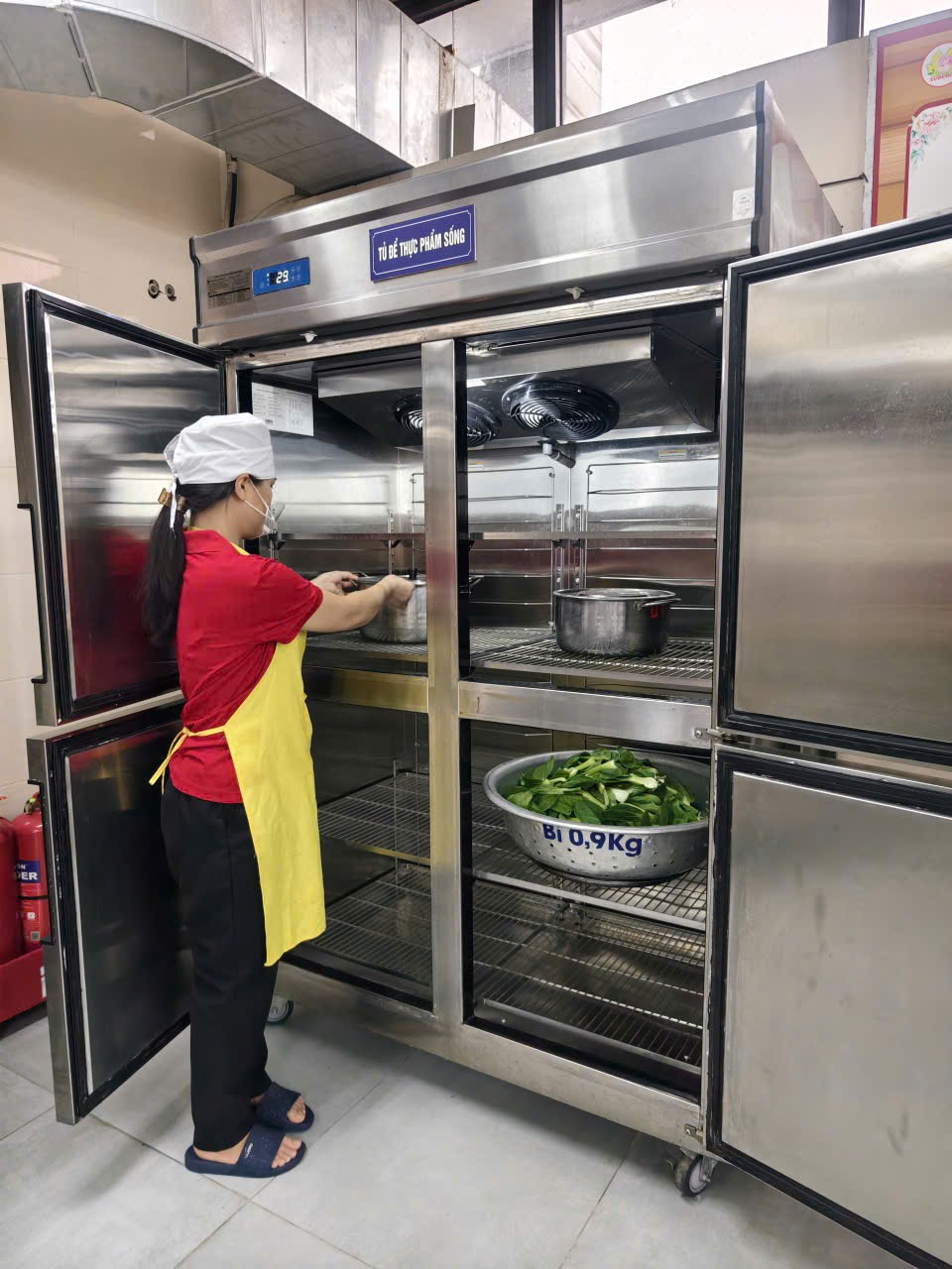 Nhân viên nuôi dưỡng cho các thực phẩm nấu ăn chiều vào tủ làm mát.