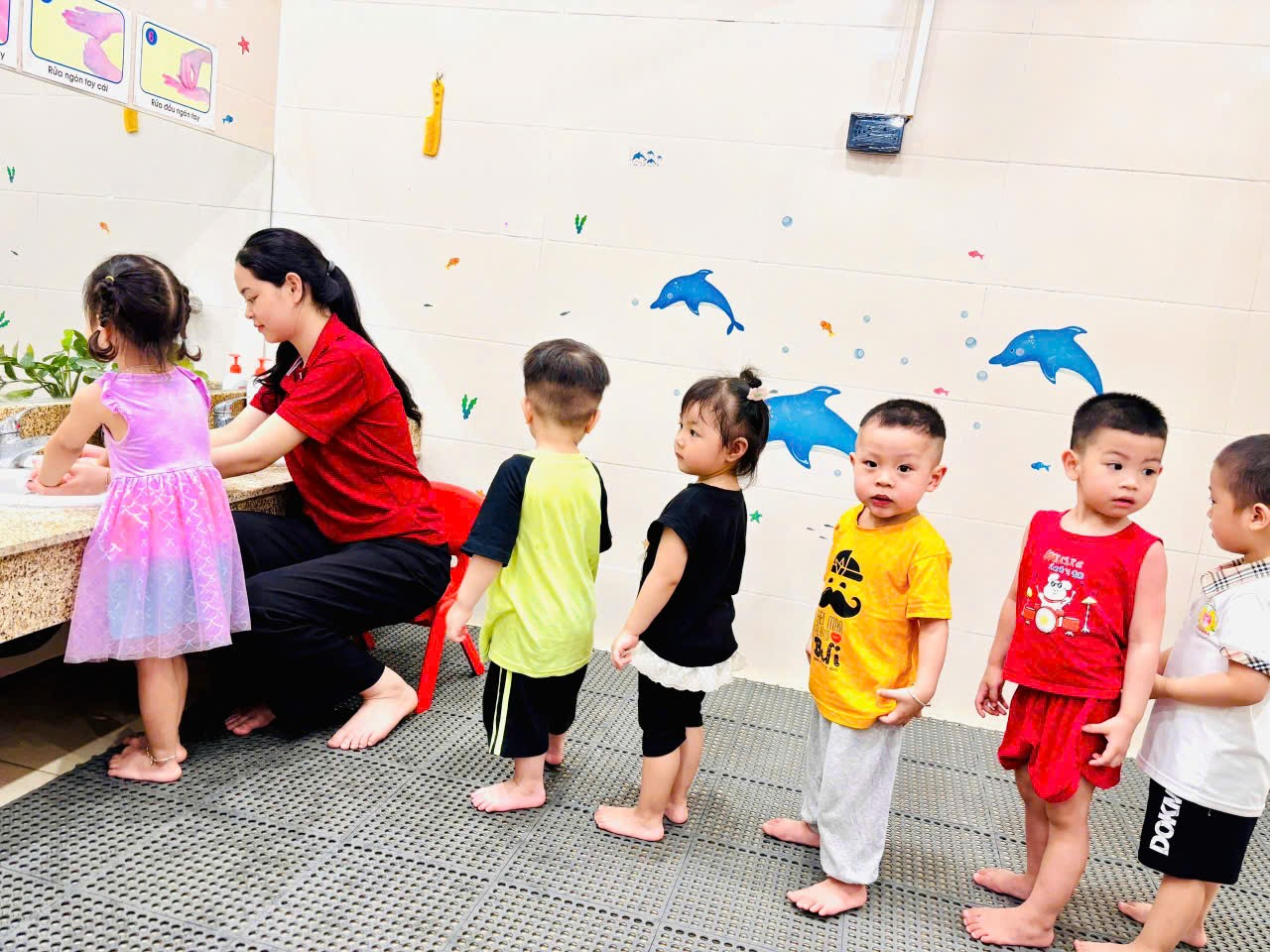 Giáo viên tổ chức rửa tay cho trẻ trước bữa ăn ( lớp nhà trẻ)