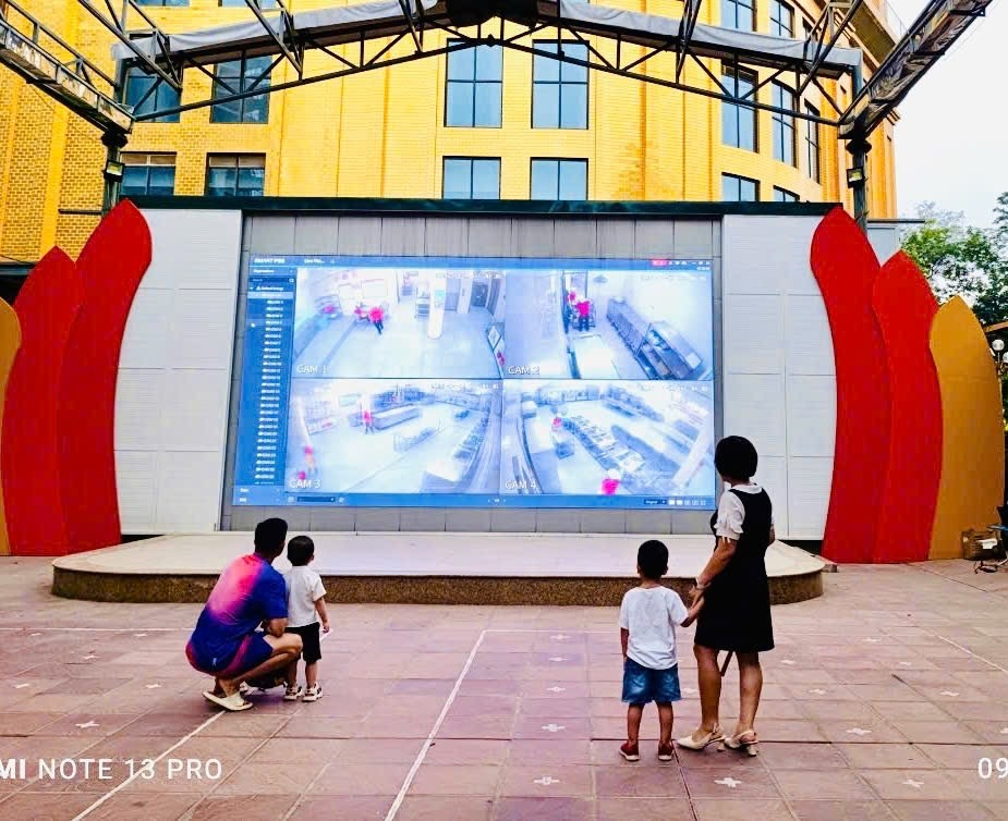 Phụ huynh và các con học sinh đang xem công khai giao nhận thực phẩm trên màn hình Led dưới sân trường Tầng 1