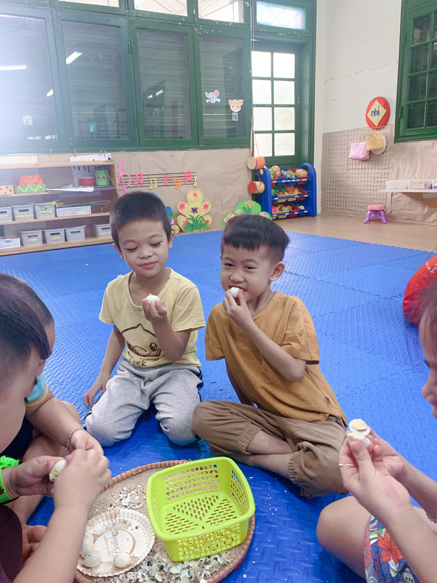 Các bạn nhỏ lớp A1 vô cùng hào hứng và thích thú khi được tham gia hoạt động bóc vỏ trứng, các bạn rất khéo léo bóc vỏ trứng mà không làm vỡ sau đó được thưởng thức luôn những quả trứng tựu tay mình bóc ra. Dưới đây là một số hình ảnh của hoạt động