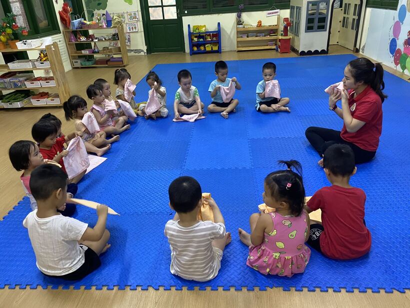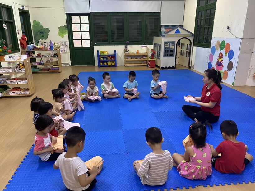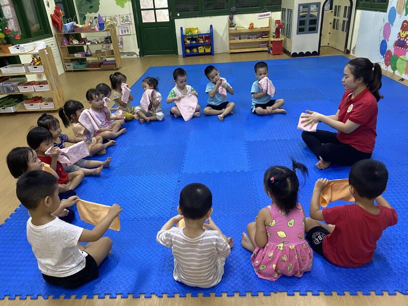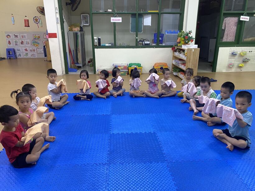 + Bước 1: Rũ khăn, cô trải khăn lên 2 lòng bàn tay, trẻ đỡ khăn bằng 2 lòng bàn tay và cổ tay