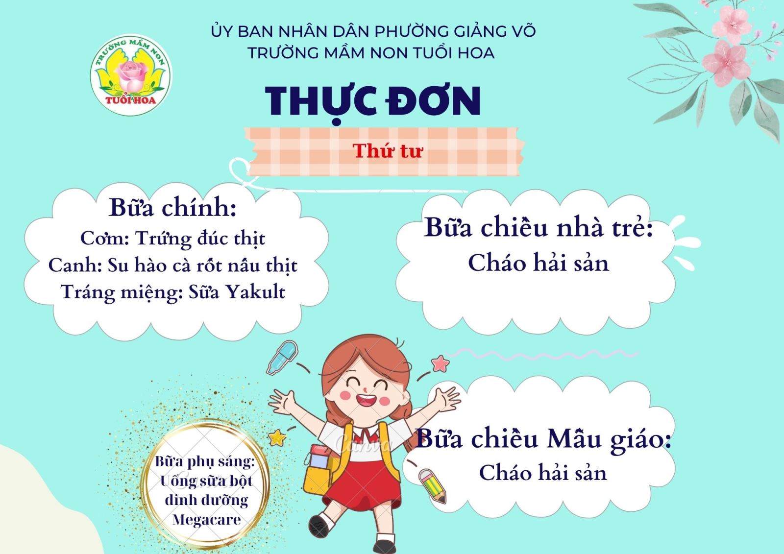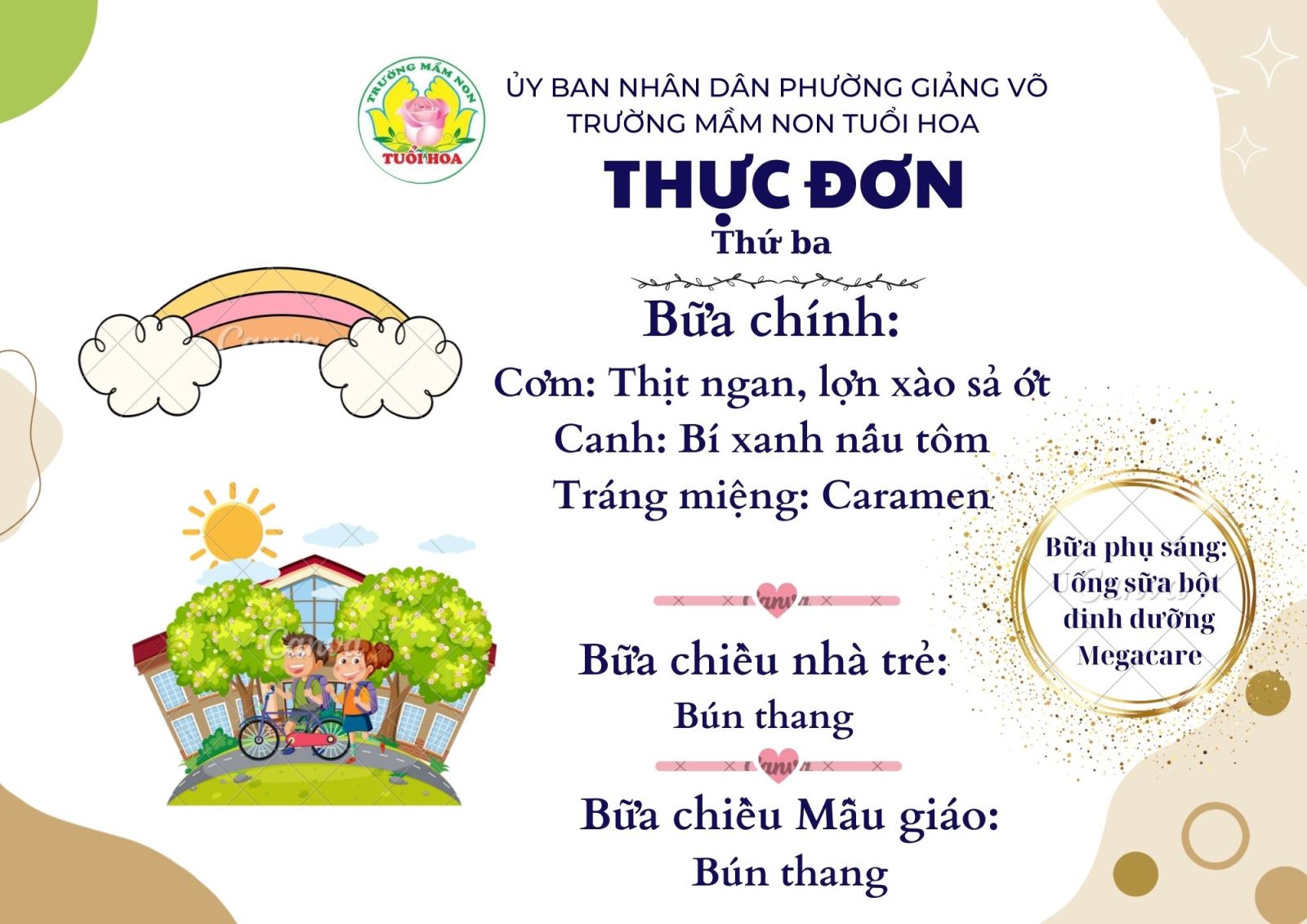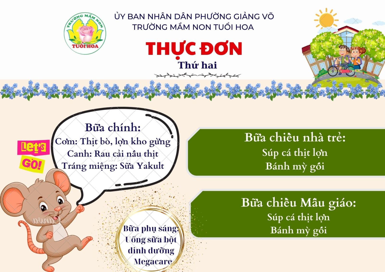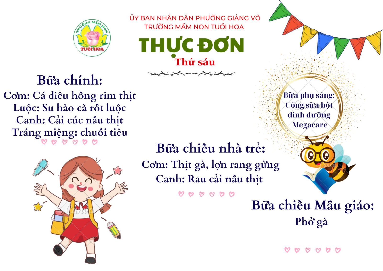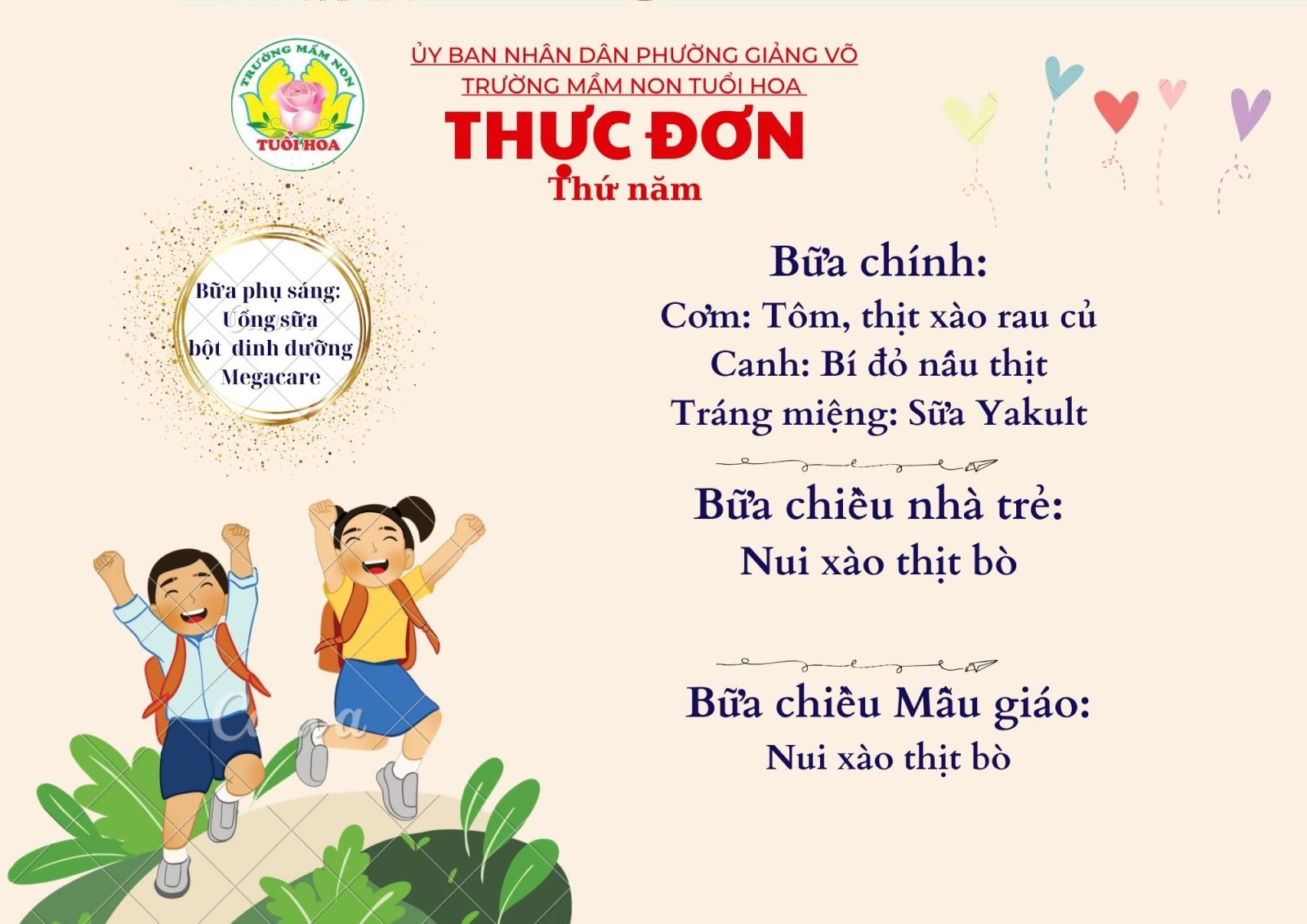 Ghi chú: Thực đơn có thể thay đổi cho phù hợp trong các ngày lễ hội, hoặc có việc đột xuất nhưng vẫn đảm bảo chất dinh dưỡng cho trẻ.