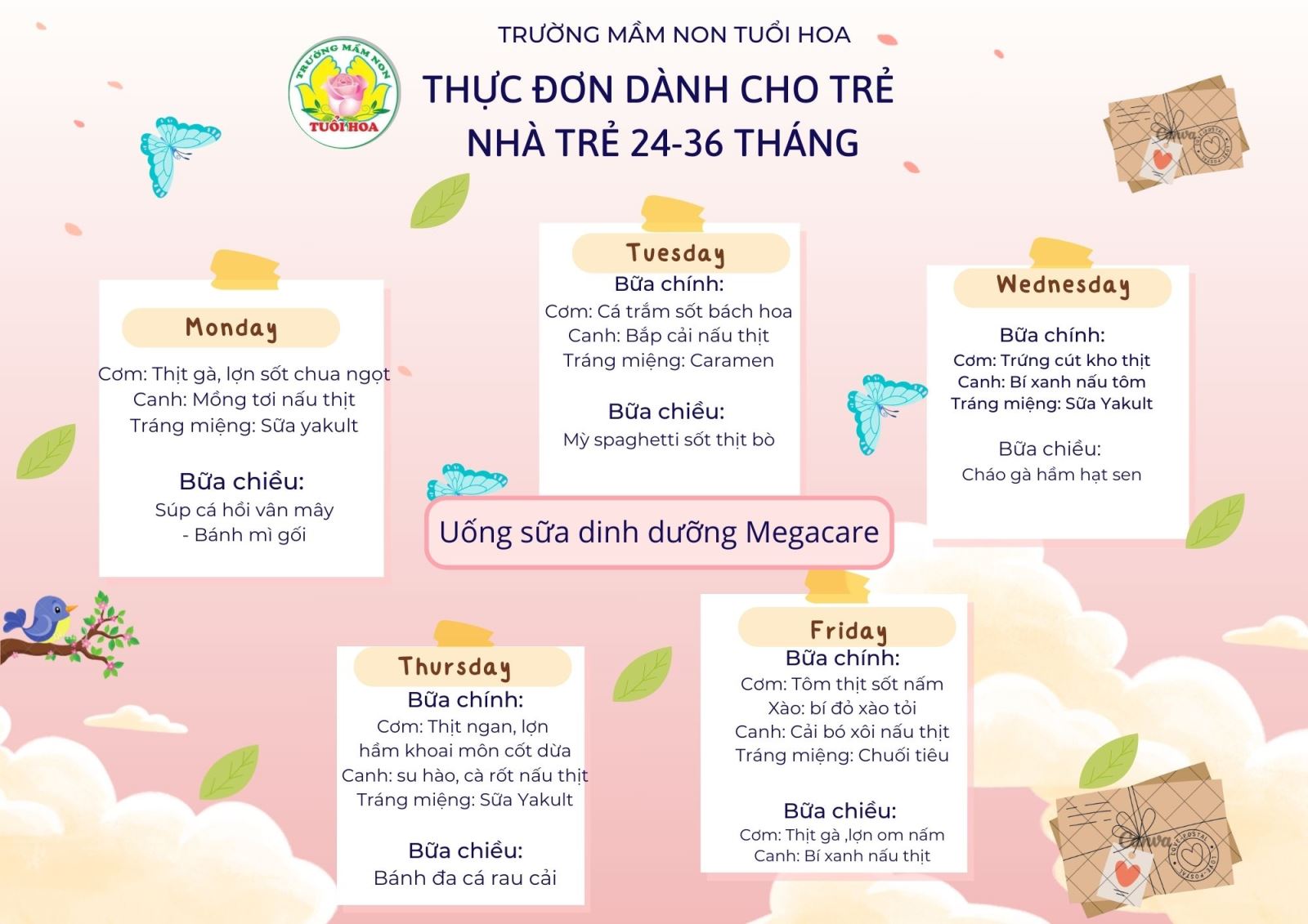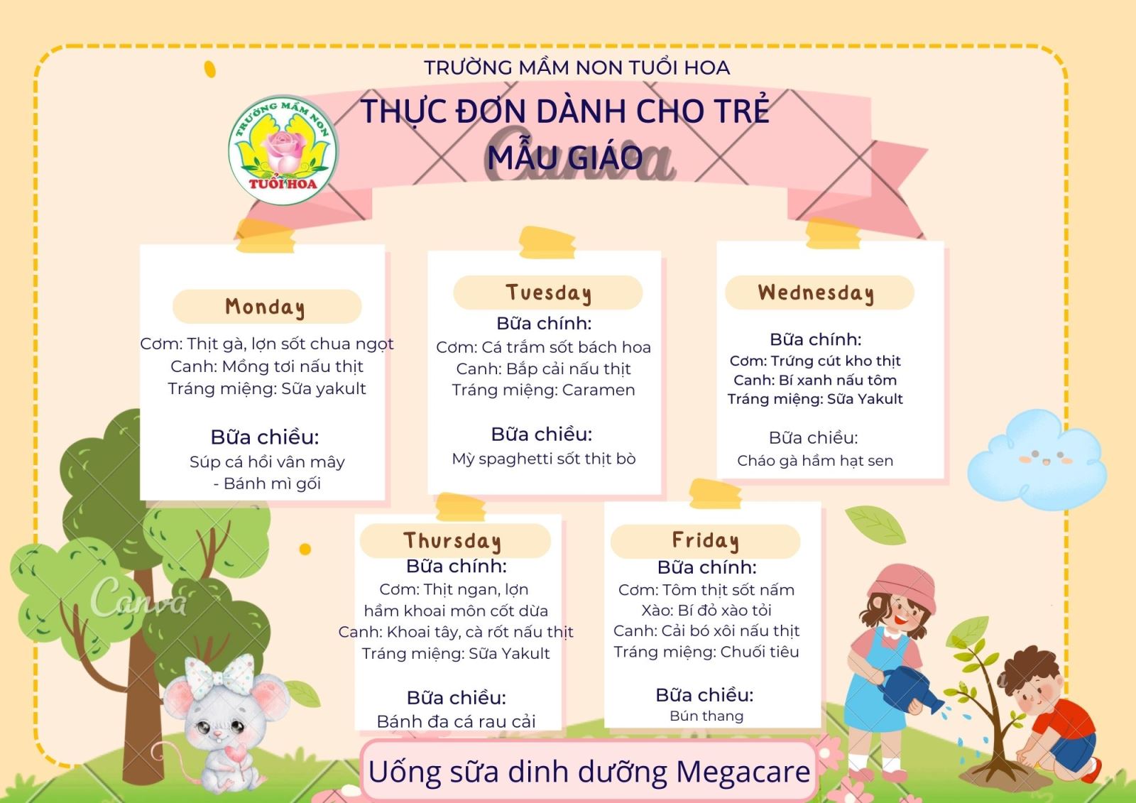 Ghi chú: Thực đơn có thể thay đổi cho phù hợp trong các ngày lễ hội, hoặc có việc đột xuất nhưng vẫn đảm bảo chất dinh dưỡng cho trẻ