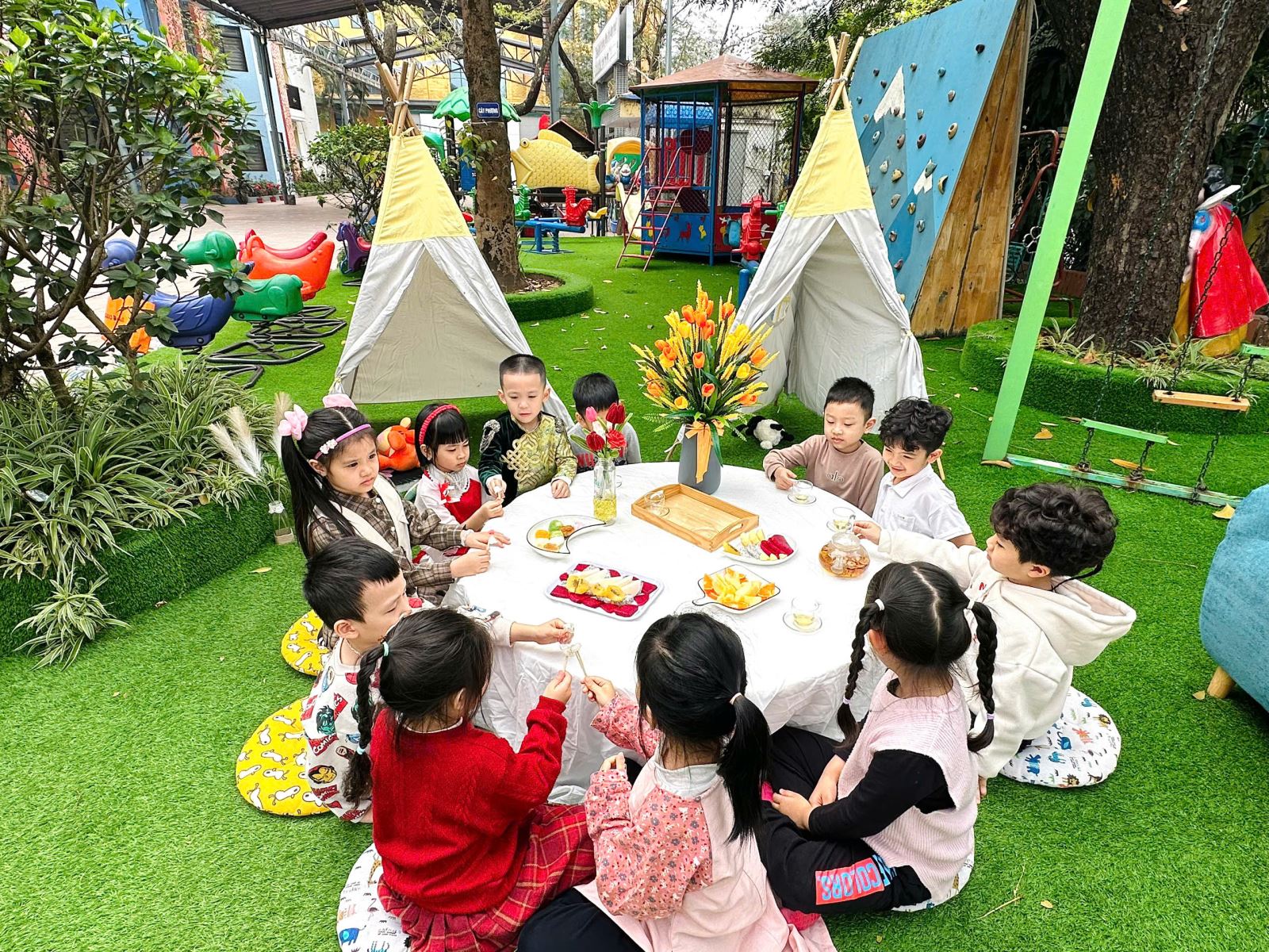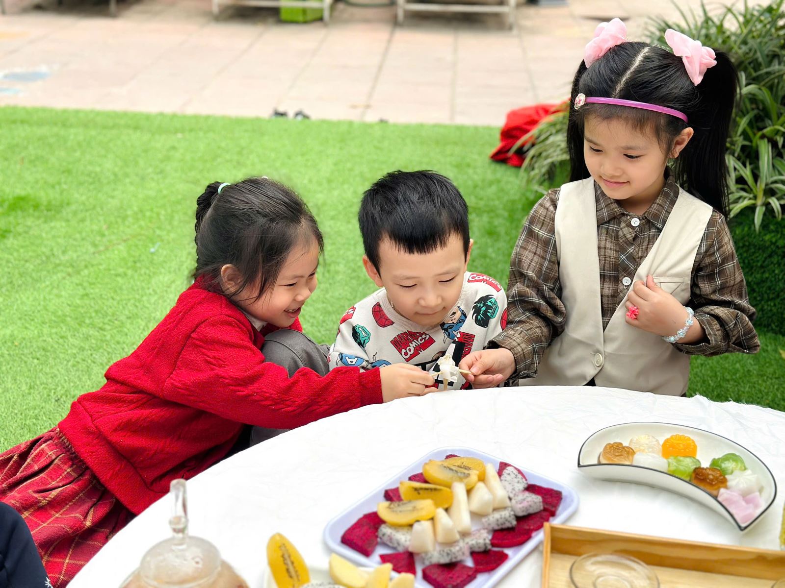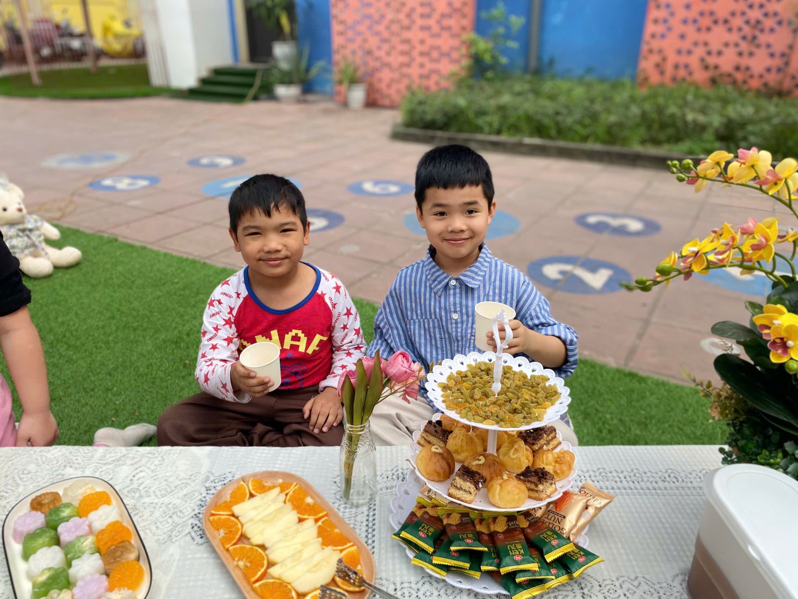 Buổi giao lưu là dịp để các bé gặp gỡ, làm quen và cùng nhau chia sẻ những khoảnh khắc đáng nhớ bên bạn bè và cô giáo. Những bàn tiệc nhỏ được trang trí bằng hoa, bánh kẹo và trái cây tươi sắc màu, tạo nên không gian ấm áp, tràn ngập sắc xuân. Các bé hào hứng thưởng thức tiệc trà, trò chuyện, tham gia các trò chơi nhẹ nhàng và biểu diễn những tiết mục văn nghệ dễ thương.