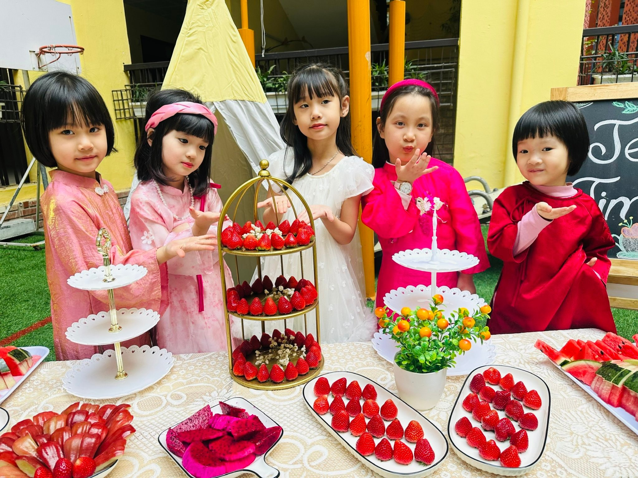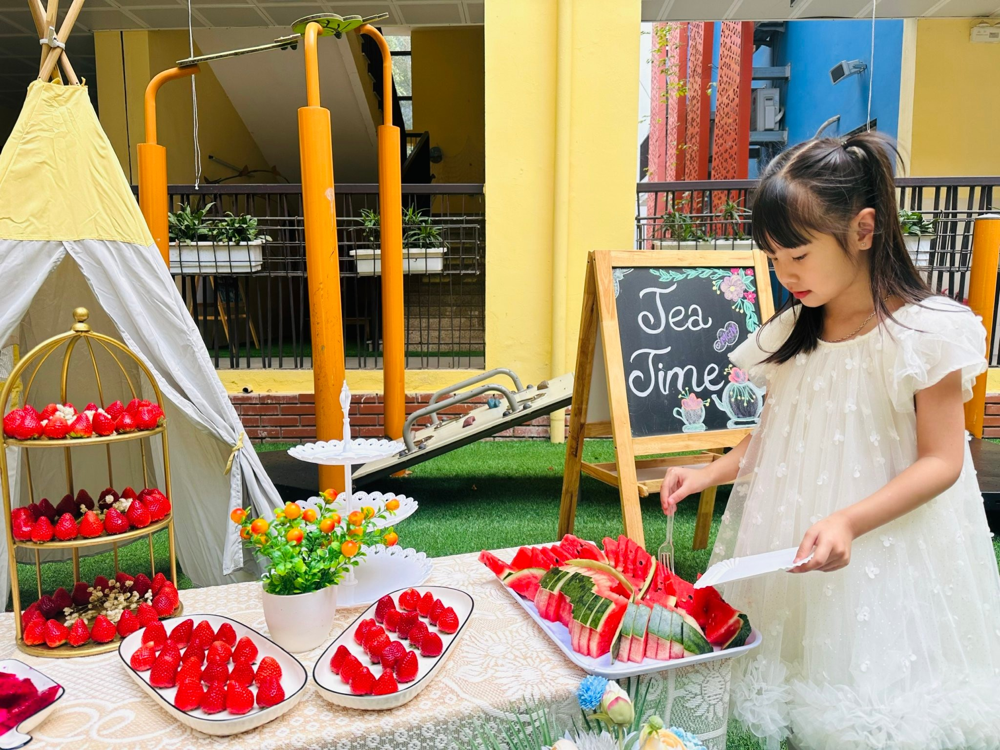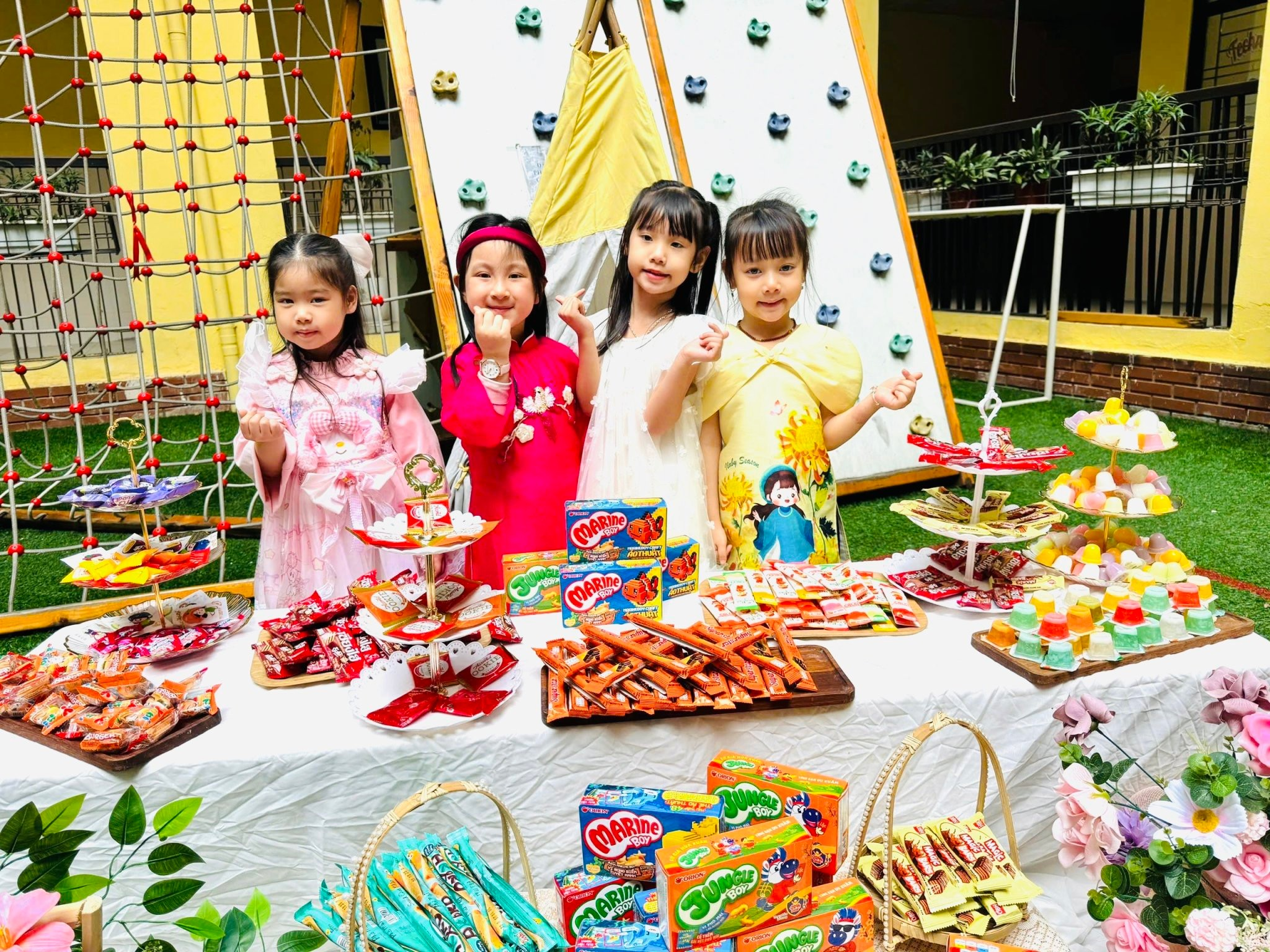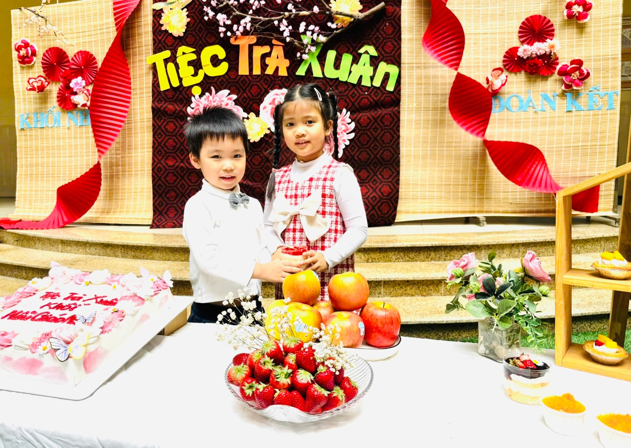 Tiệc trà mùa Xuân được các cô sắp xếp bày trí đẹp mắt, tạo ra cho các con một không gian ấm cúng và thân mật, nơi các bé được cùng nhau thưởng thức vị ngọt ngào của bánh,trả sữa,hoa quả và có thể chia sẻ những câu chuyện vu vơ thật vui.