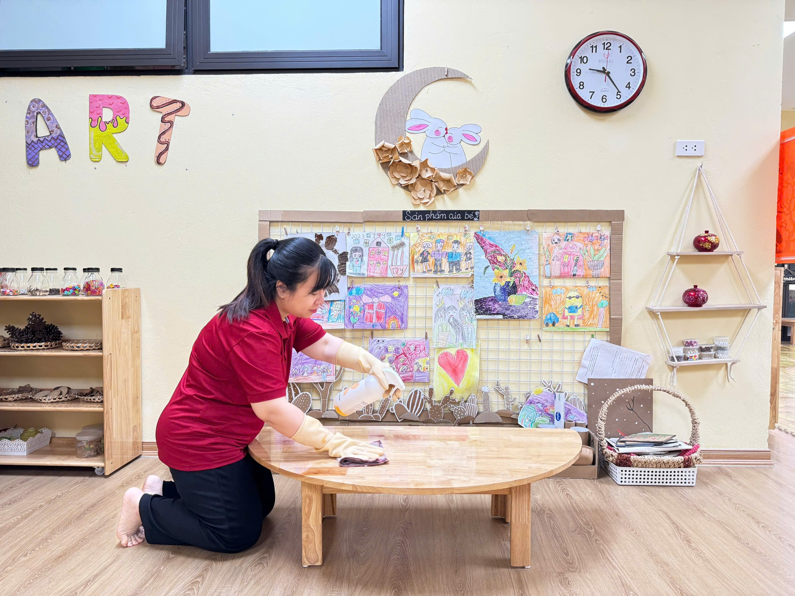 * Vệ sinh lớp học: Lau dọn, khử khuẩn toàn bộ bàn ghế, đồ chơi, và các vật dụng trong lớp, đảm bảo không còn vi khuẩn hay bụi bẩn có thể gây hại cho sức khỏe của các bé.