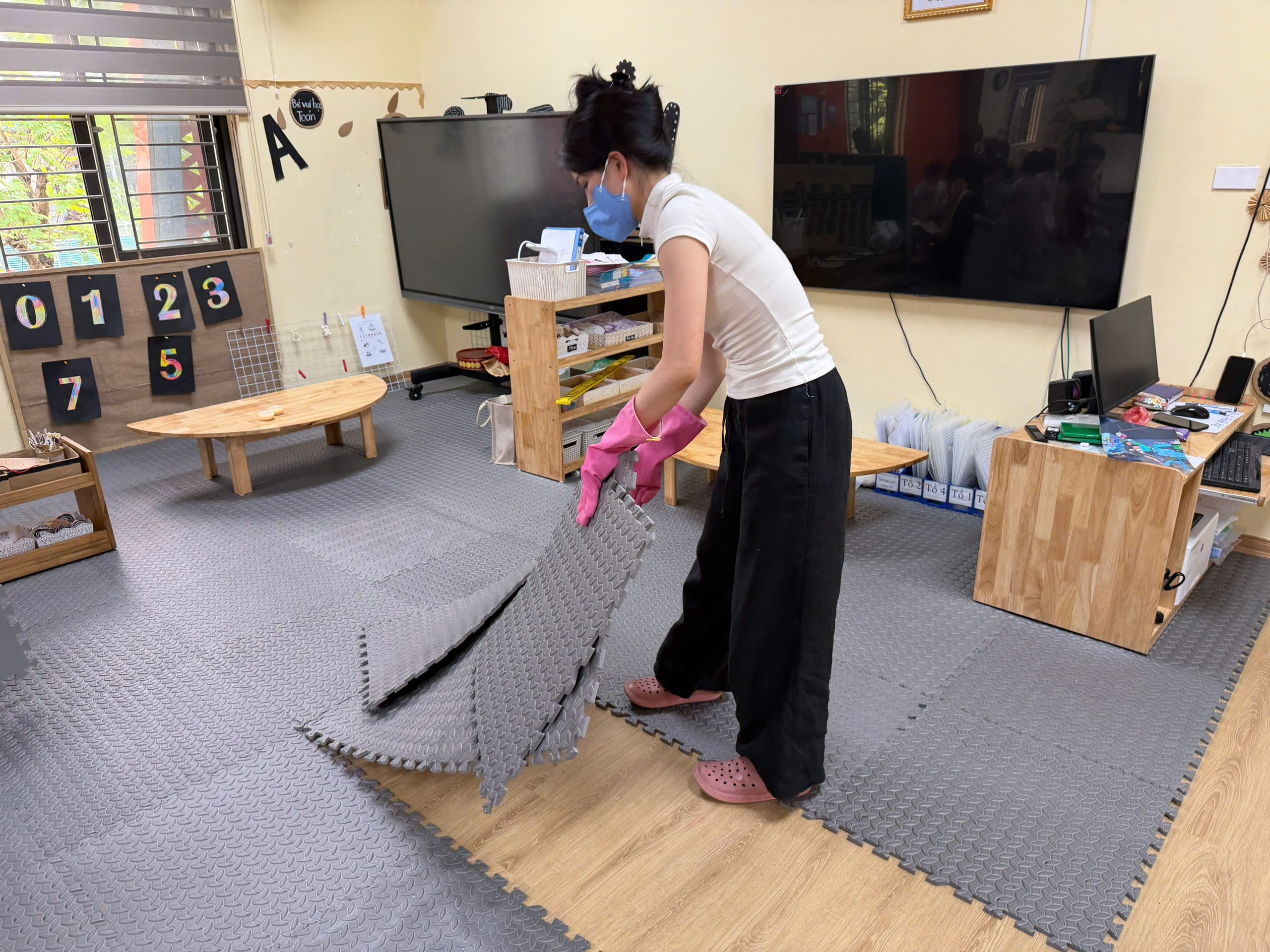 Ảnh: Giáo viên vệ sinh các tấm thảm trải trong lớp