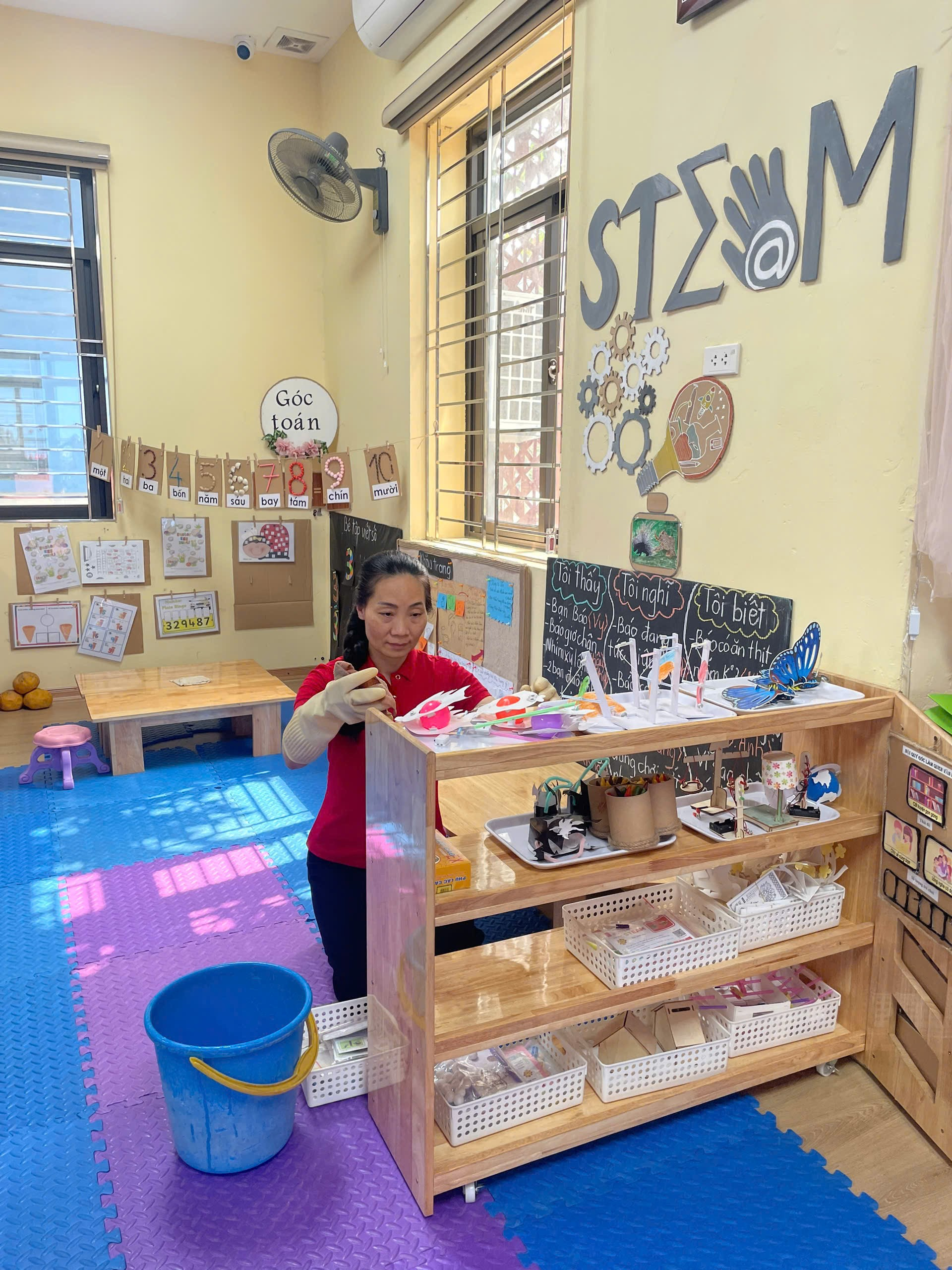 Ảnh: Giáo viên vệ sinh các giá đồ chơi trong lớp học