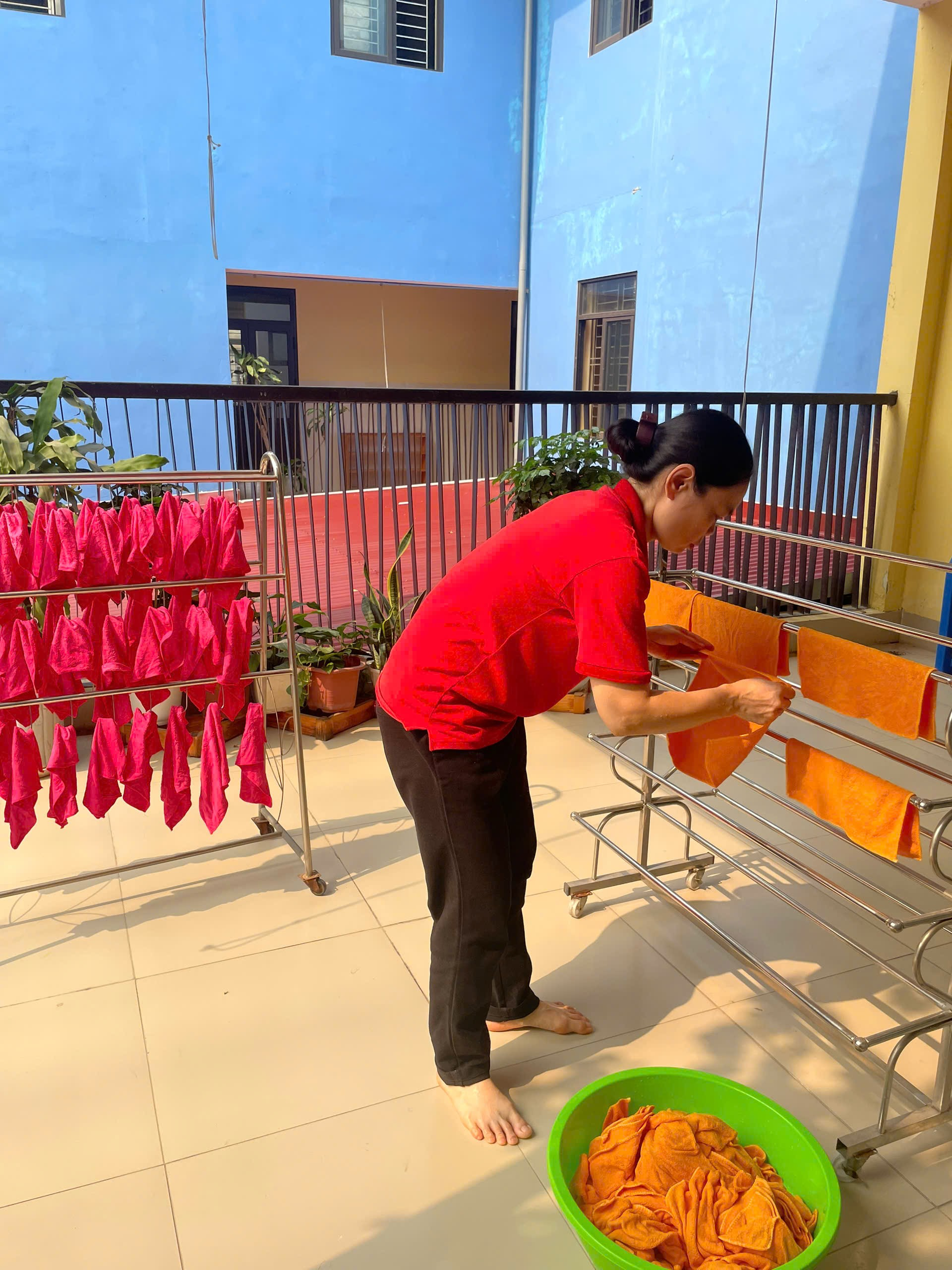 Ảnh: Giáo viên giặt khăn và phơi khăn.