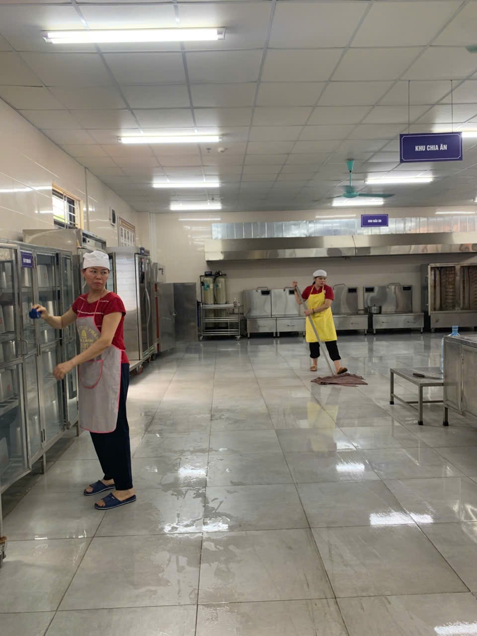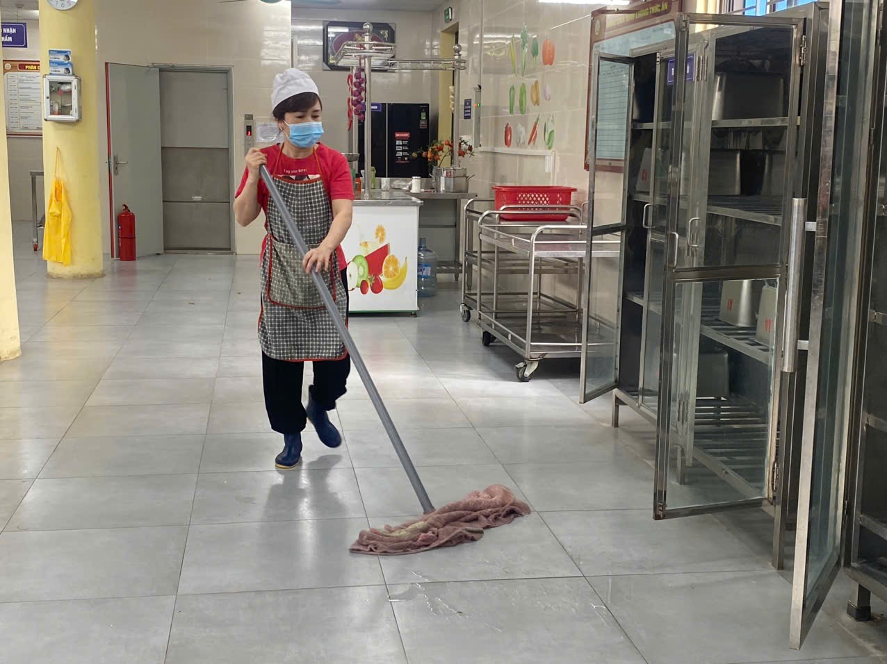 Ảnh: Nhân viên vệ sinh sàn nhà khu vực bếp ăn.