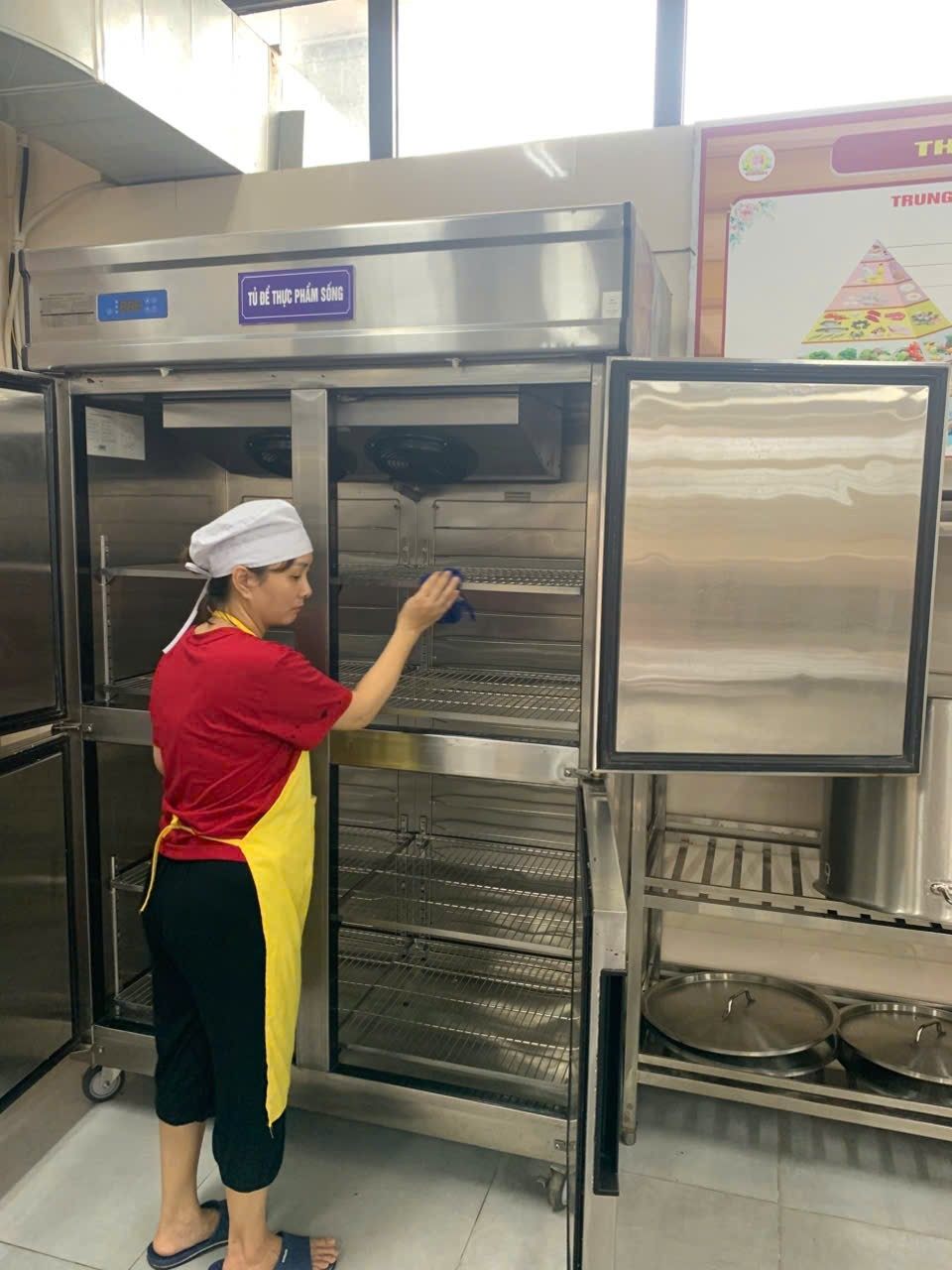 Ảnh: Nhân viên vệ sinh tủ lạnh lưu nghiệp thức ăn hàng ngày.