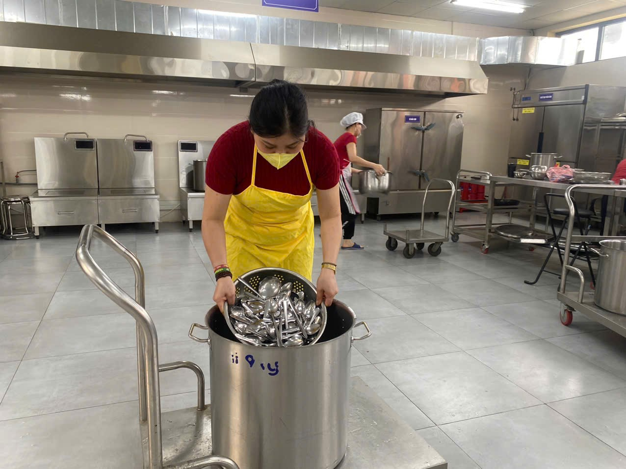 Ảnh: Nhân viên luộc thìa khử khuẩn sau khi đã rửa sạch.