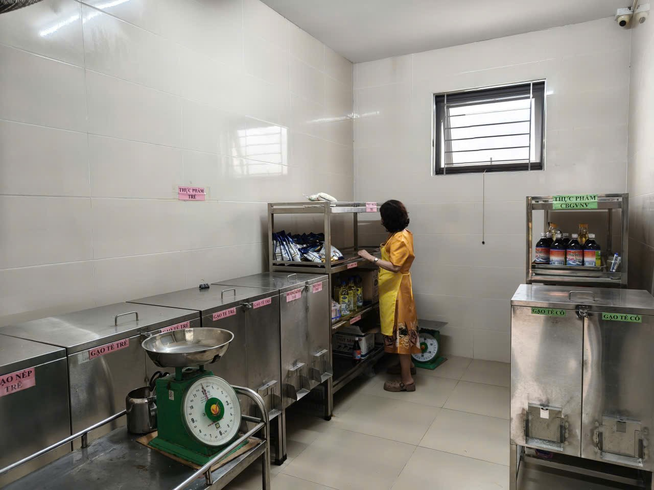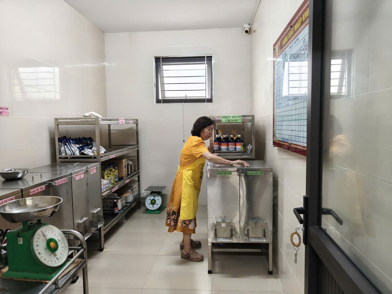 Ảnh: Nhân viên vệ sinh phòng kho thực phẩm của nhà trường.