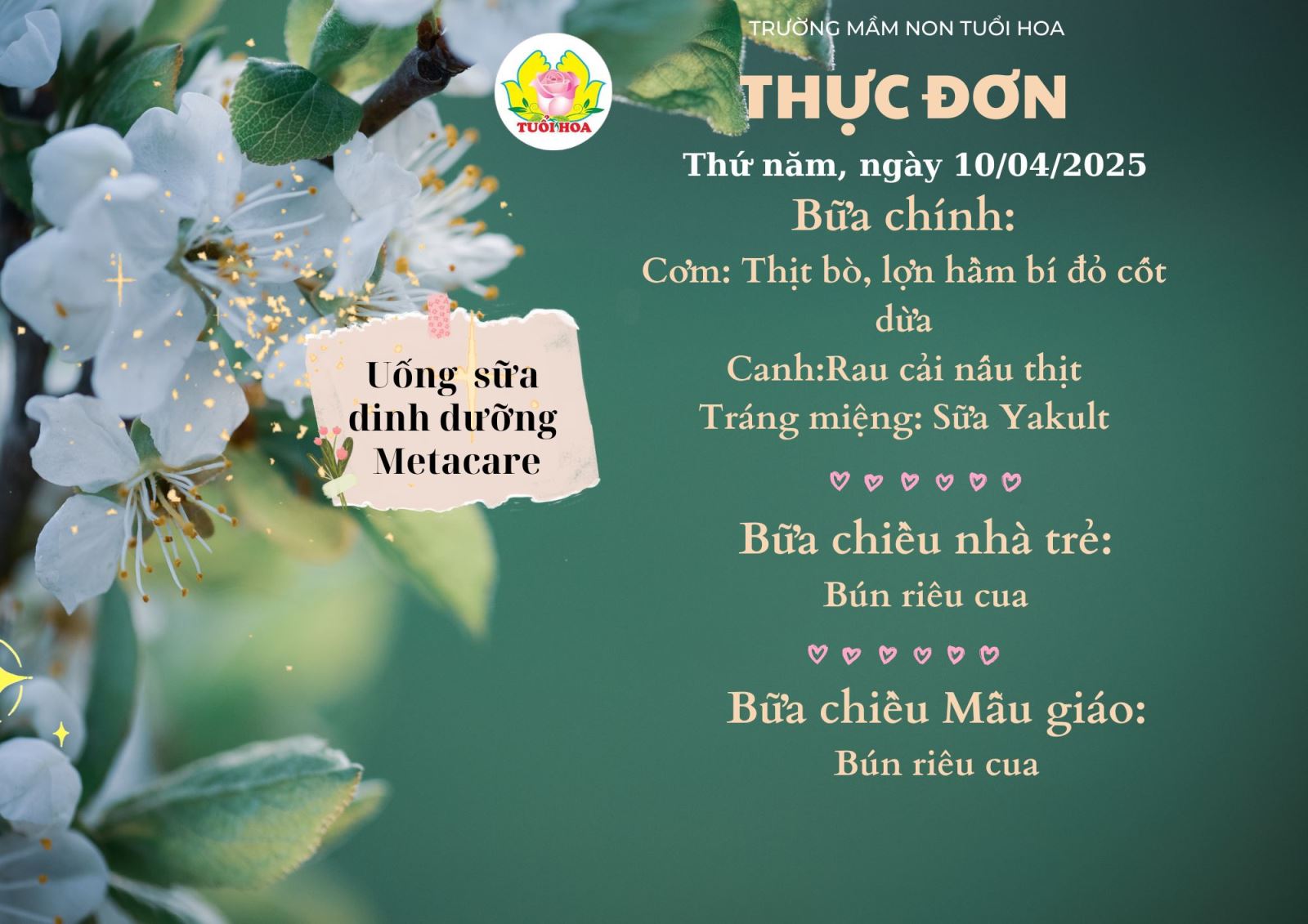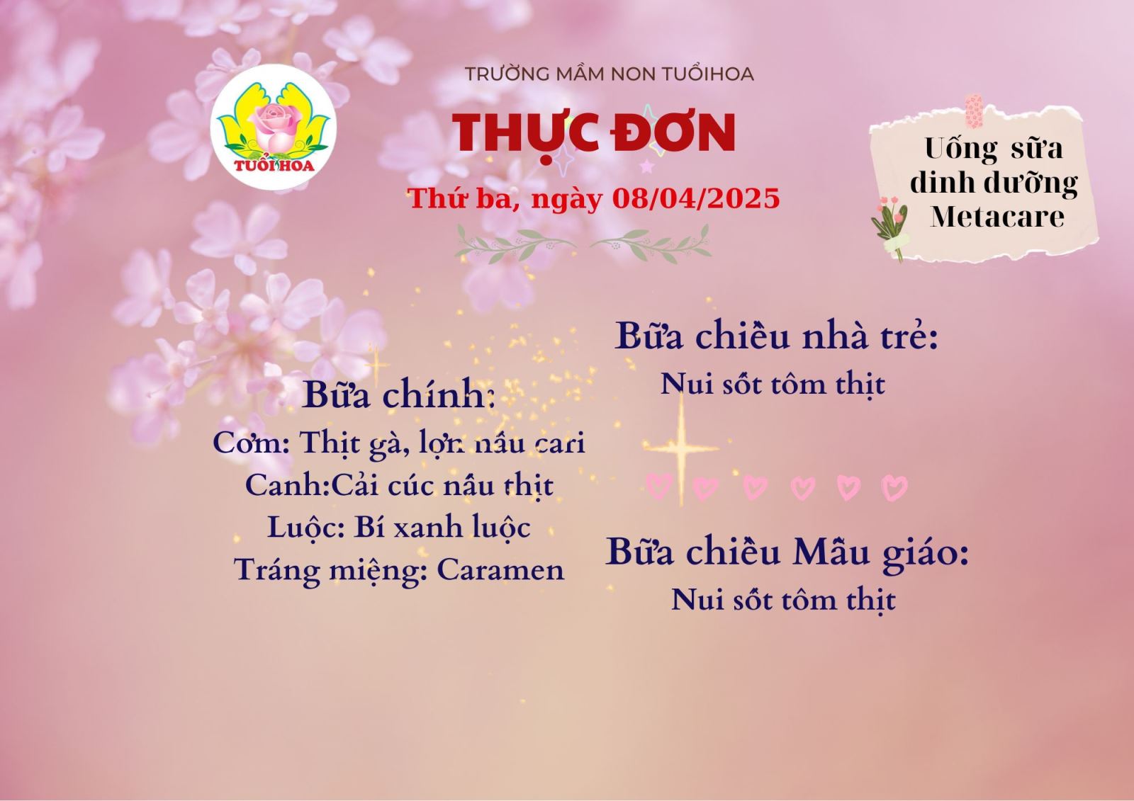 Kính gửi phụ huynh tham khảo thực đơn tại trường mầm non Tuổi Hoa. Các bé ăn ngon miệng là niềm vui của các bác, các cô.