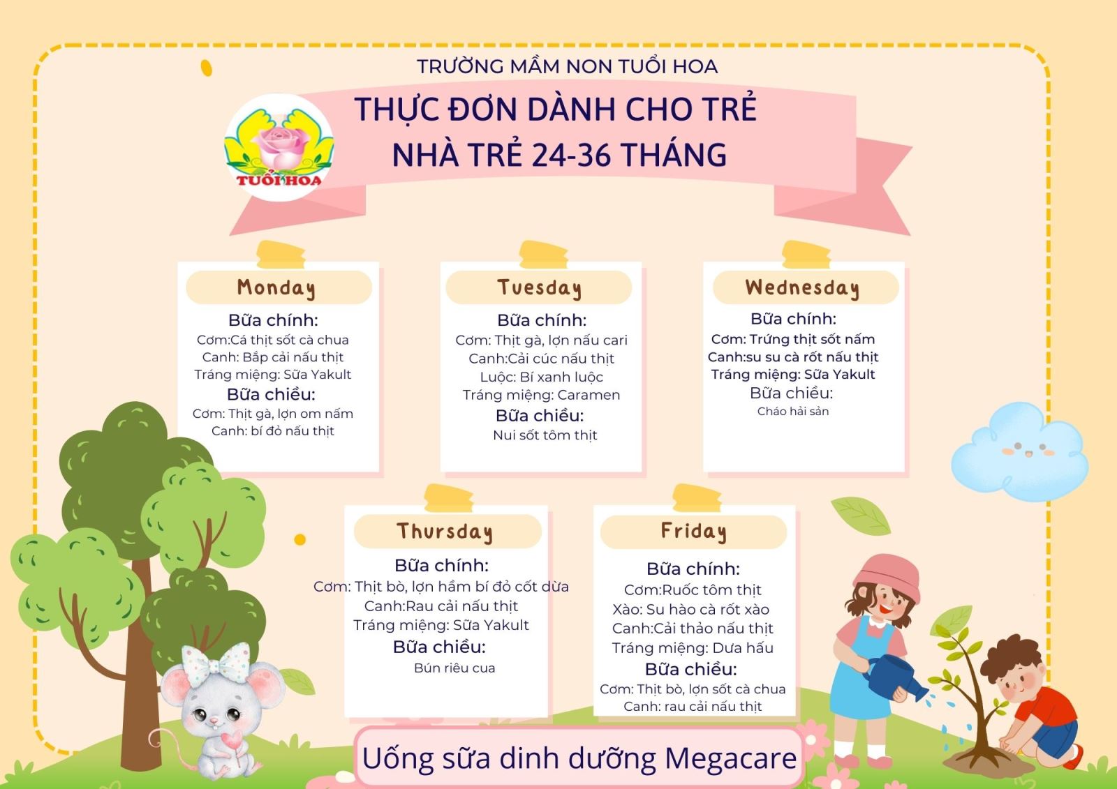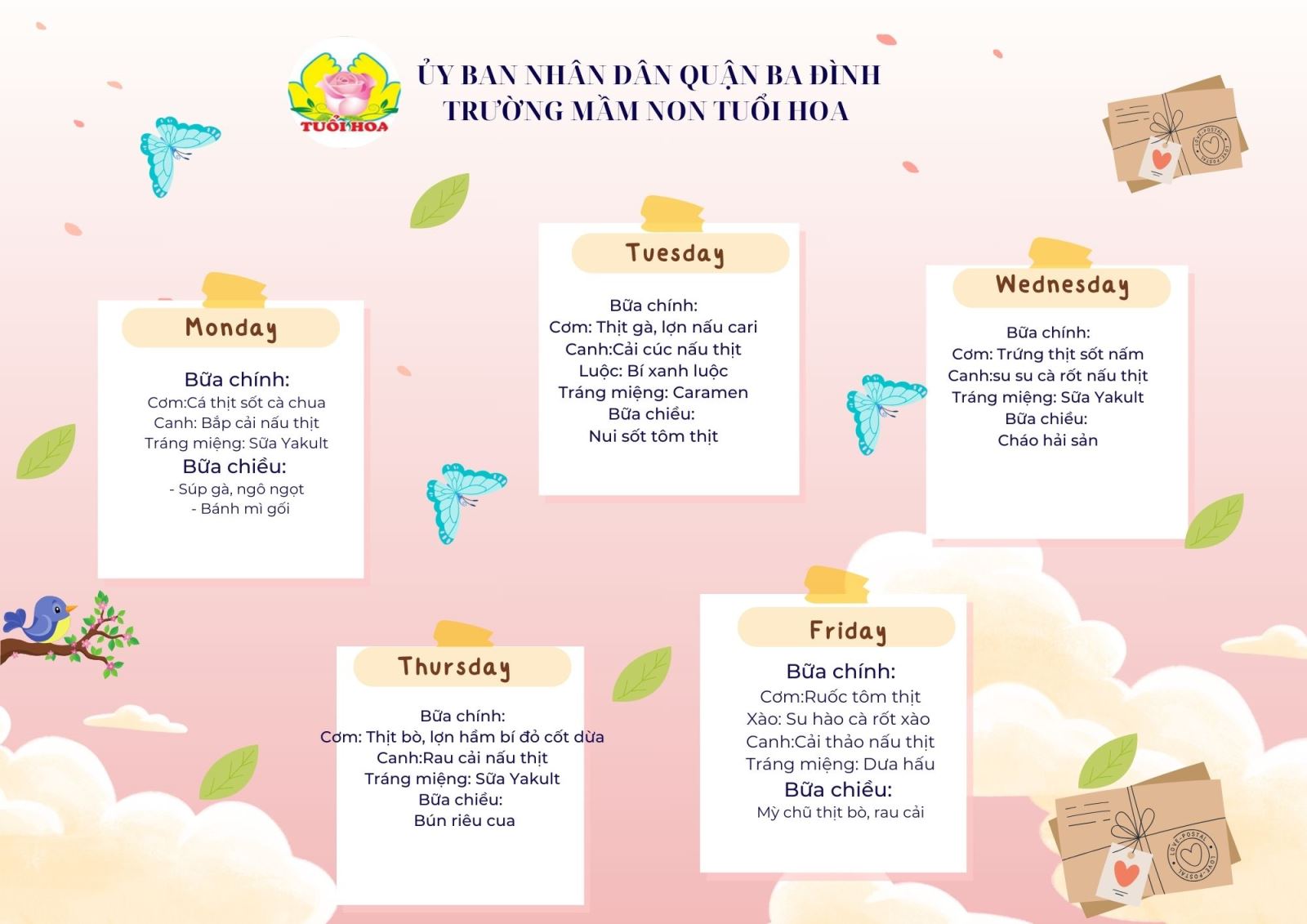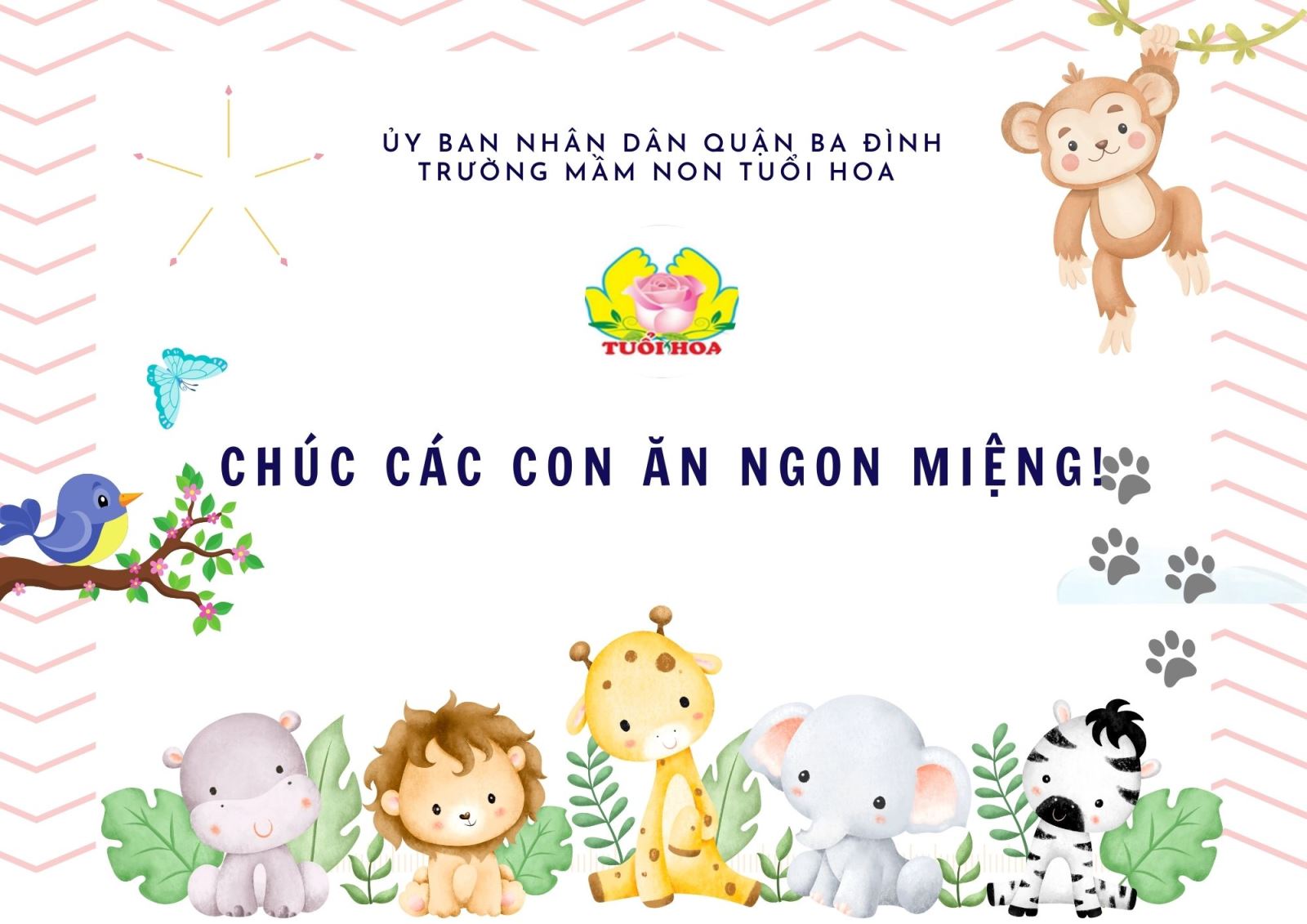 Mời quí phụ huynh tham khảo thực đơn dành cho các bé tại trường Mầm non Tuổi Hoa dưới đây! Ghi chú: Thực đơn có thể thay đổi cho phù hợp trong các ngày lễ hội, hoặc có việc đột xuất nhưng vẫn đảm bảo chất dinh dưỡng cho trẻ Ghi chú: Thực đơn có thể thay đổi cho phù hợp trong các ngày lễ hội, hoặc có việc đột xuất nhưng vẫn đảm bảo chất dinh dưỡng cho trẻ
