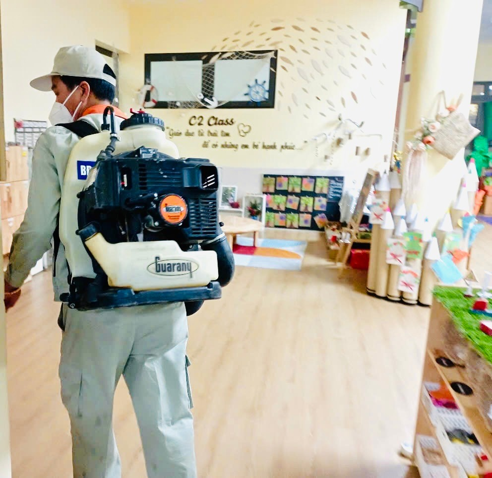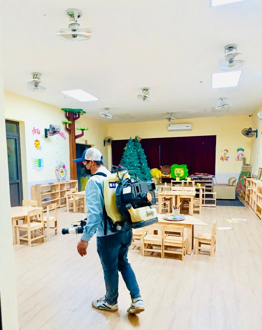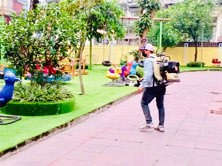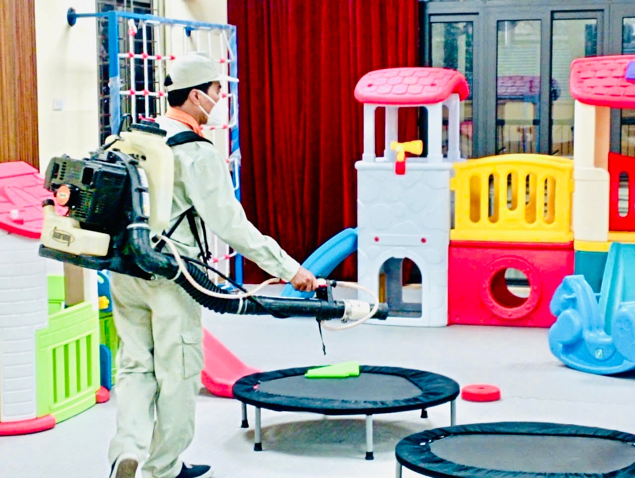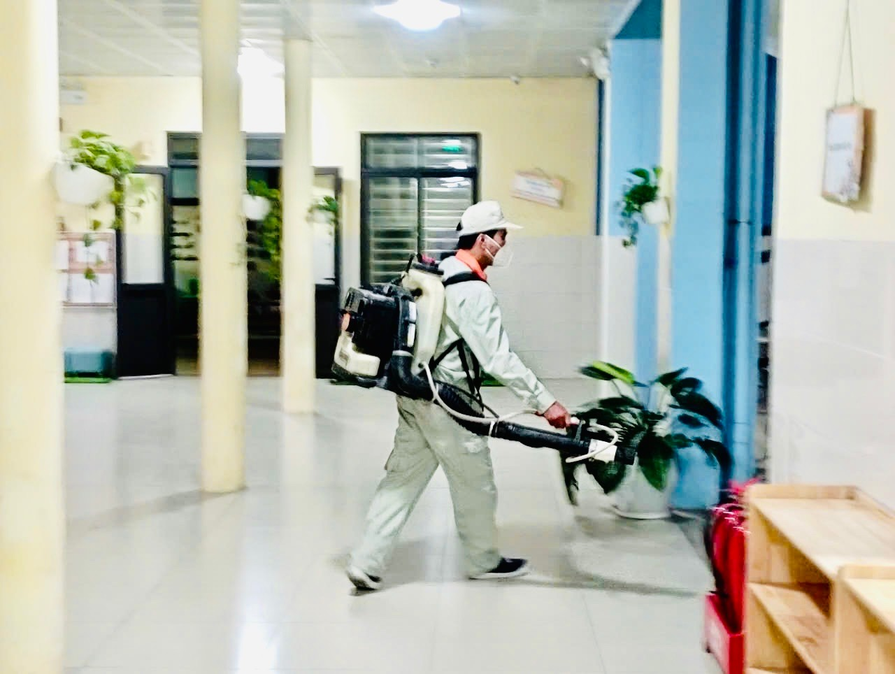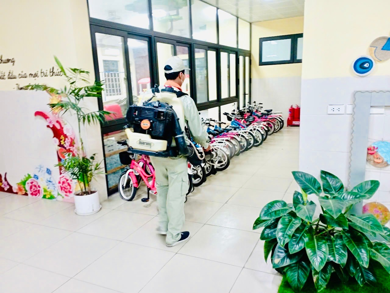 Trường Mầm non Tuổi Hoa phun khử khuẩn phòng chống dịch sởi
