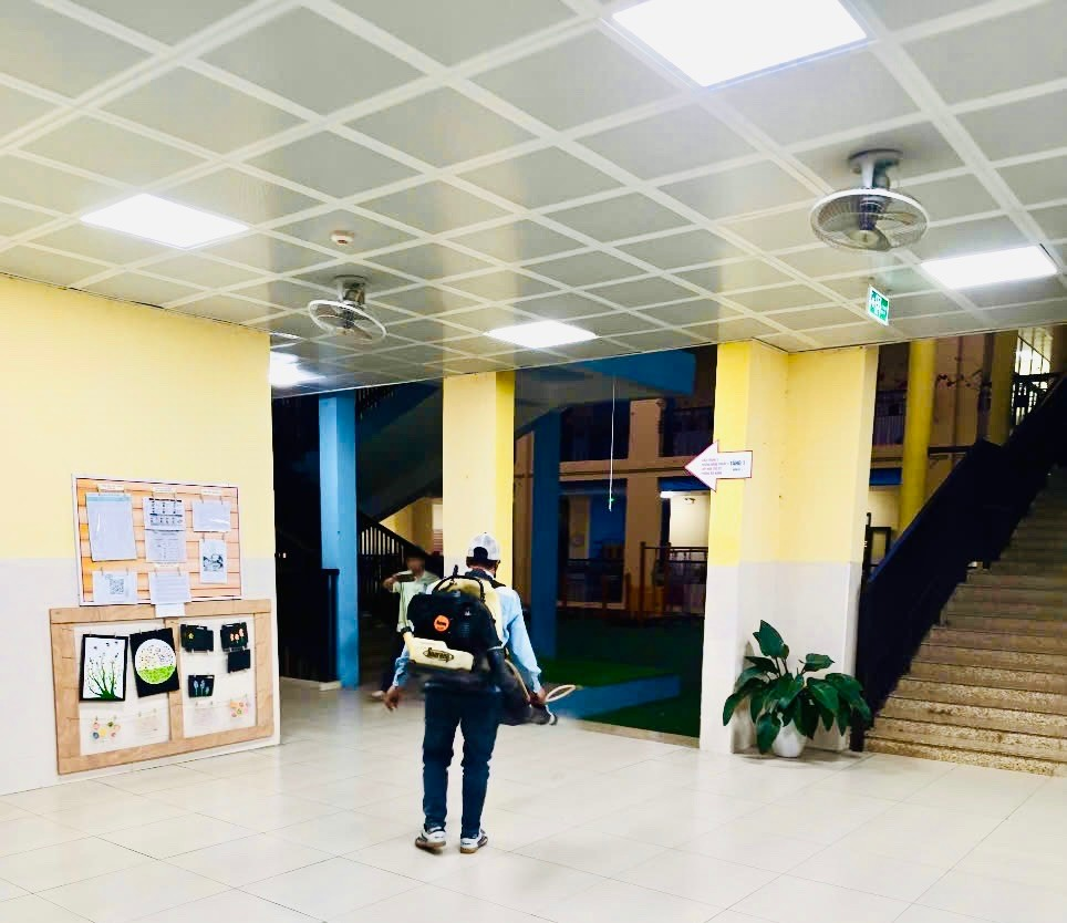 Phun khử khuẩn Cloramin B gầm cầu thang nhà trường.