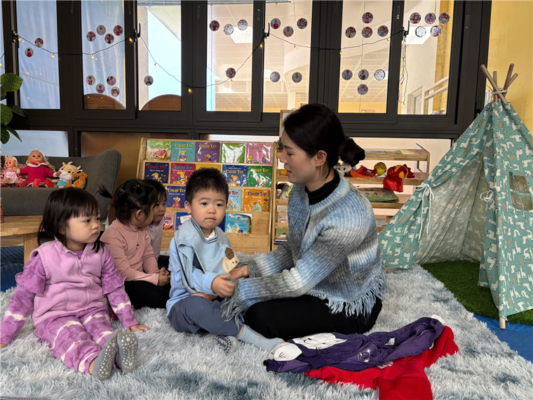 Hình ảnh giáo viên hướng dẫn trẻ mặc quần áo ấm sau khi ngủ dậy