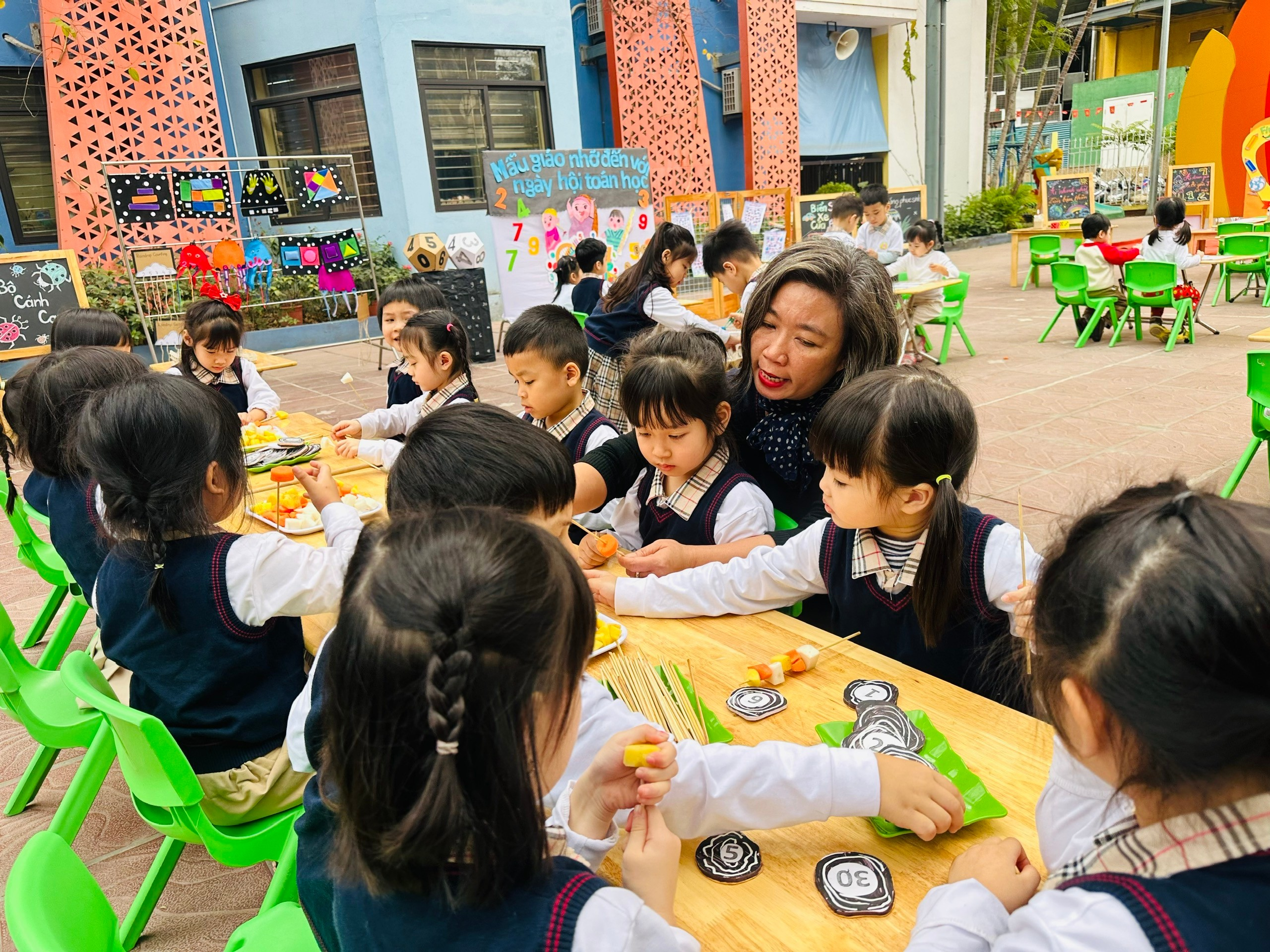 Các bé từ nhừng rau củ quả và que xiên tọa thành những hình học , số lượng