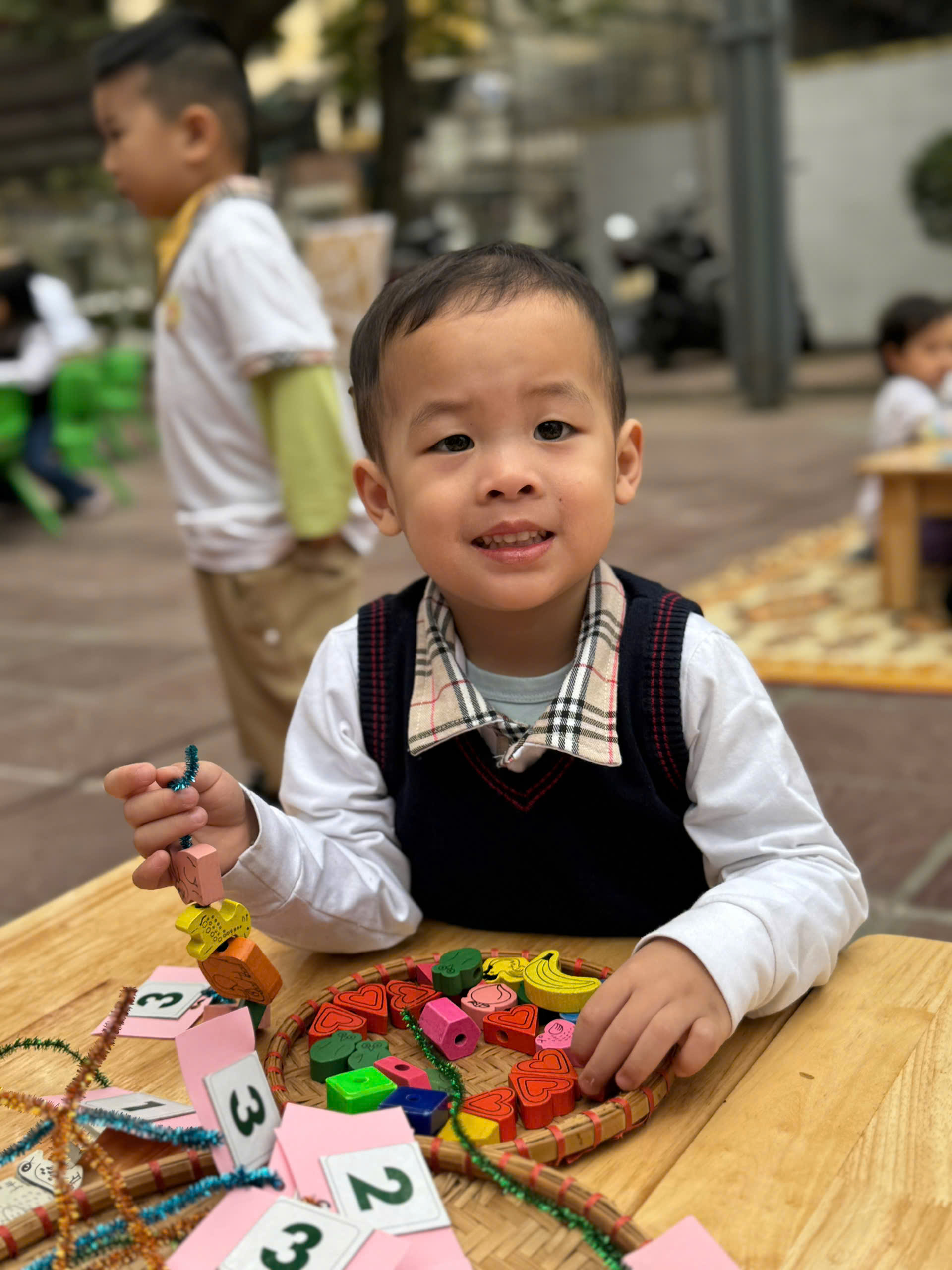 Hình ảnh bé chơi xâu vòng theo đúng số lượng.